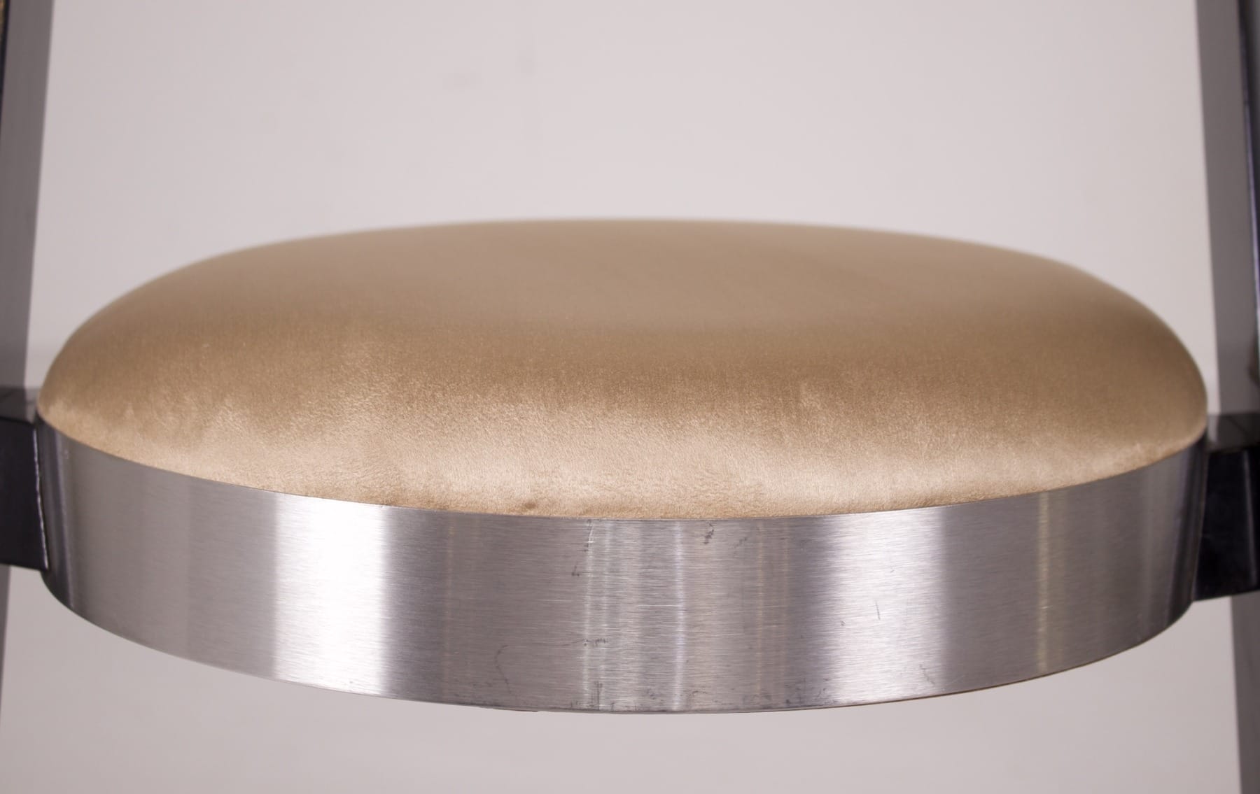 • Willy Rizzo für Mario Sabot, 6-teilige Sitzgruppe aus schwarz lackiertem Holz, Sitzflächen aus Mikrofaser, die Wildleder imitiert, umrandet von einem Band aus gebürstetem Stahl. Originalausgabe um 1970.