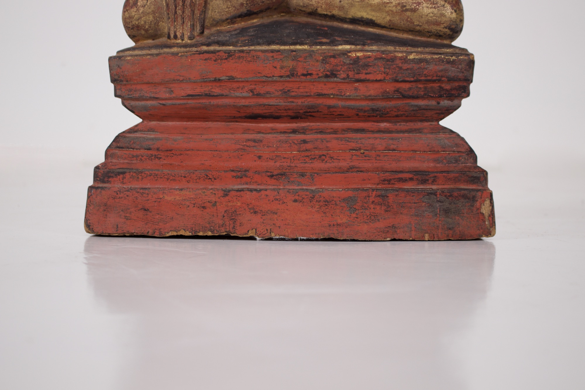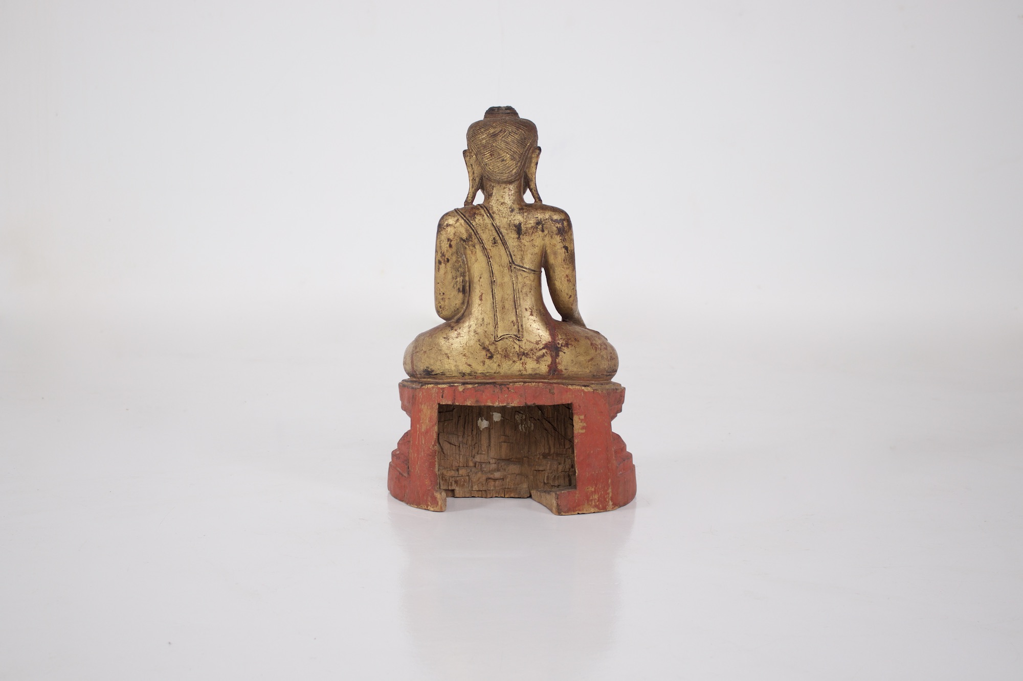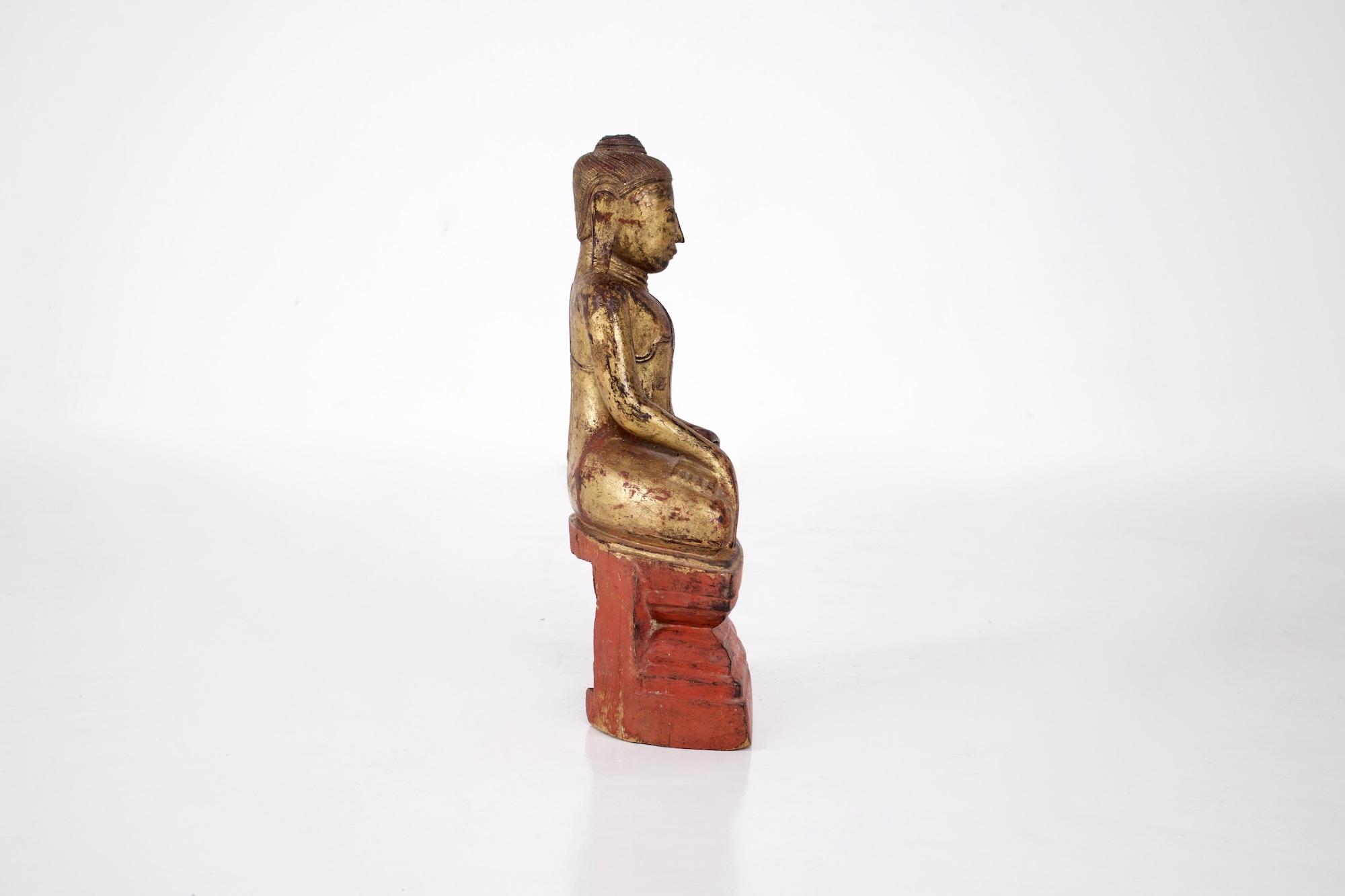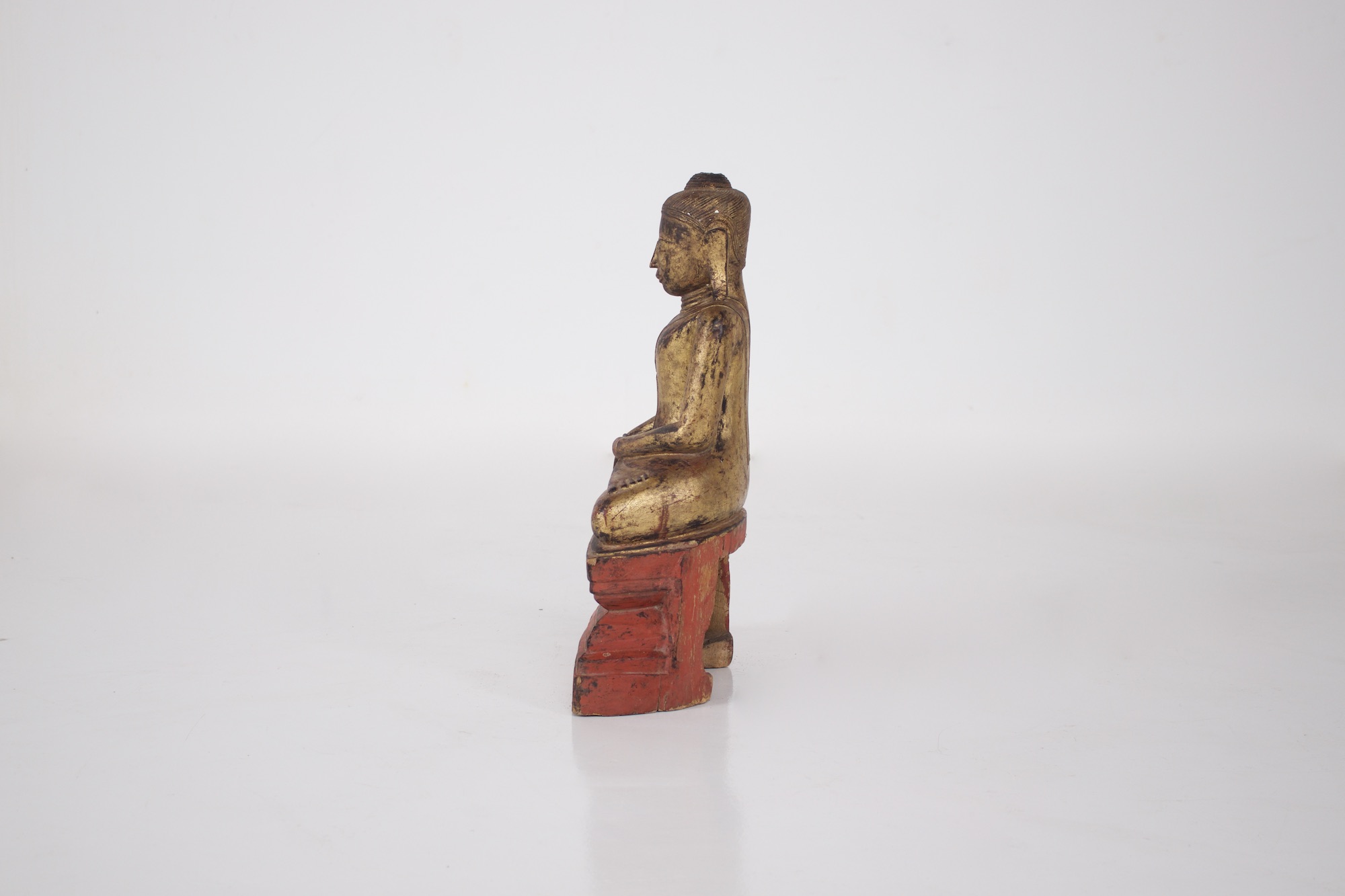 - Burmesische Darstellung des sitzenden Buddha in Bhumisparsha Mudra, Massivholz mit Trockenlack überzogen und vergoldet, Konbaung Periode (1782-1885), Shan Staaten.