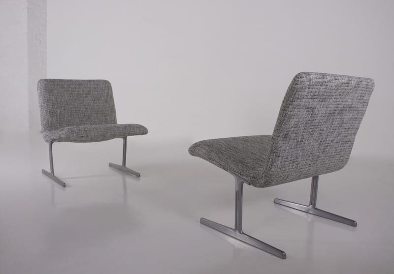 Diese Stuhlmodelle werden durch zwei große Beine mit Kufen aus gegossenem Aluminium definiert, die ein hohes Maß an Stabilität bieten, und die im Wesentlichen rechteckige Konstruktion der Sitzfläche und der Rückenlehne weist eine ausgeprägte Neigung nach hinten auf. Der 601 war für Wohnzimmer oder Schlafzimmer gedacht, um eine entspanntere Sitzhaltung zu ermöglichen. Heute, mit der Entwicklung des Lebenskonzepts am Arbeitsplatz, fügt er sich perfekt in eine Dreiecksbeziehung aus Komfort, Ergonomie und Ästhetik ein.