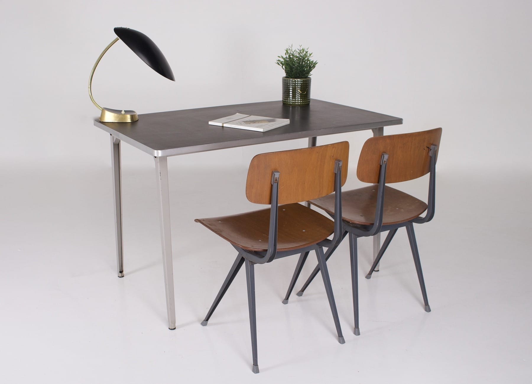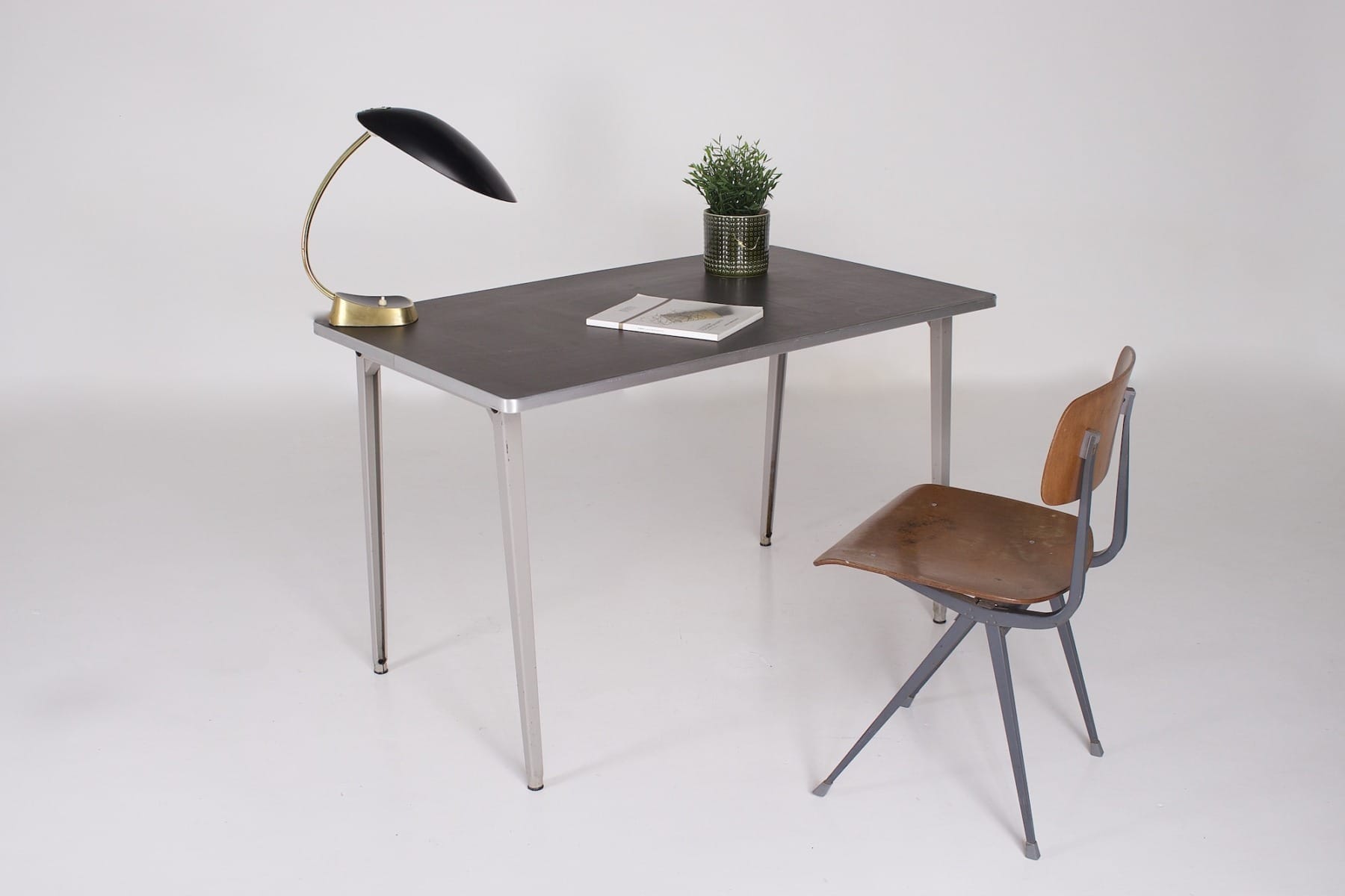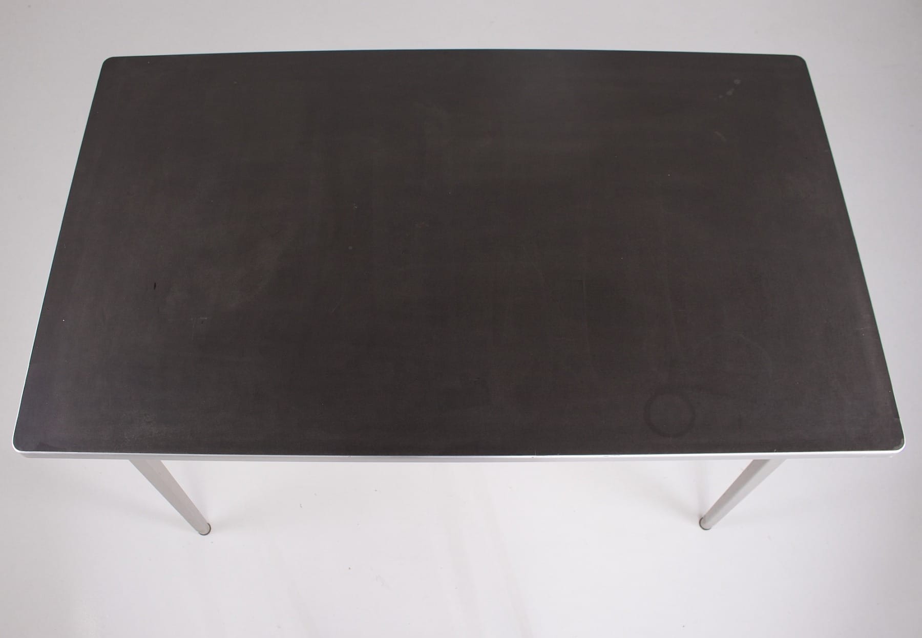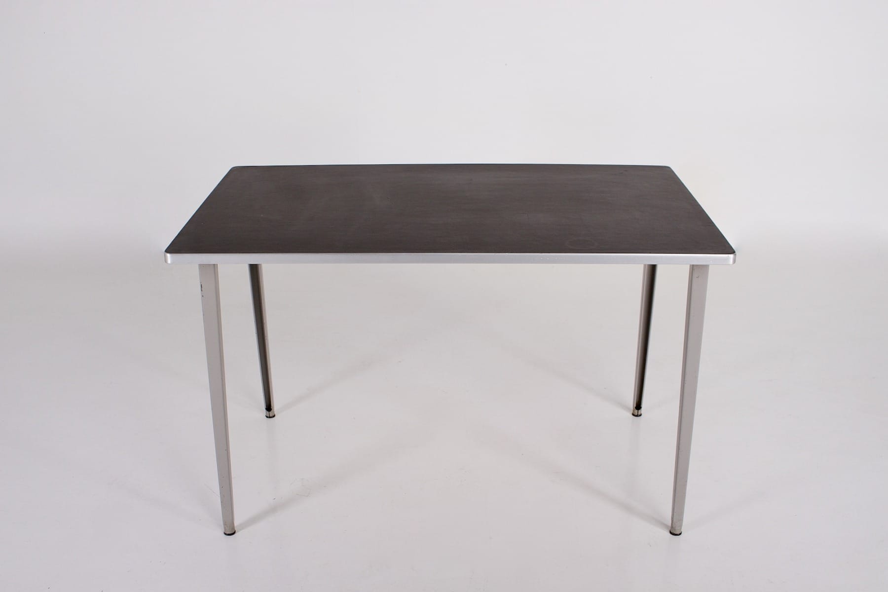 Seine robuste Konstruktion aus gebogenen Profilen ist funktionsgerecht, insbesondere mit zwei Verstärkungsrohren aus Stahl, die die Platte stützen. Diese ist mit anthrazit/schwarzem Linoleum belegt und mit einer Kante aus eloxiertem Aluminium eingefasst. Die Beine schließen mit integrierten Kunststoffgleitern ab, um Spuren auf empfindlichen Böden zu vermeiden. Die graue Farbe ist original; sie wurde gewählt, um eine ruhige Atmosphäre zu schaffen und die Integration in verschiedene professionelle und private Umgebungen zu erleichtern. Der Tisch Reform von Friso Kramer ist somit ein zeitloses Möbelstück in Form und Farbe.