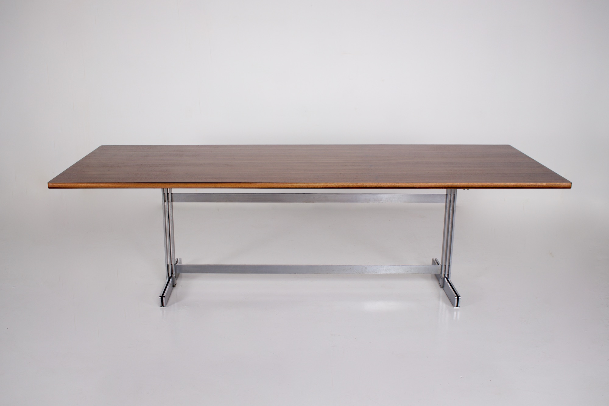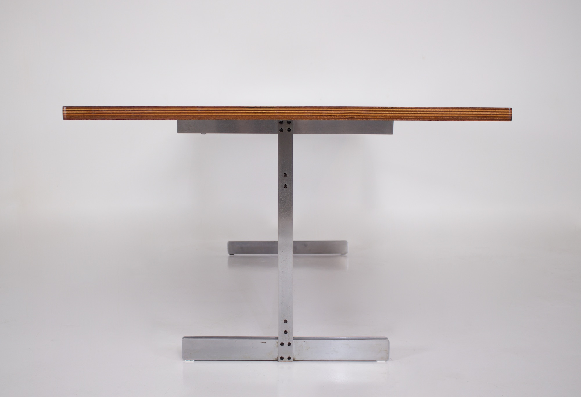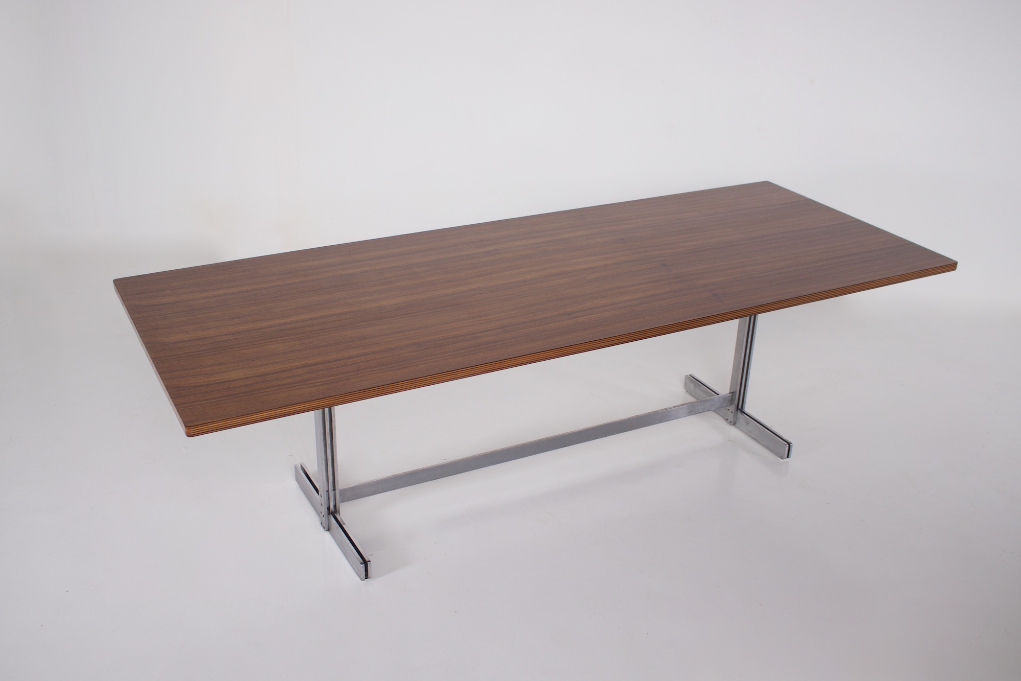 • Jules Wabbes und Le Mobilier Universel, rechteckiger Tisch aus Palisanderfurnier auf einem Stahlblattgestell, um 1970.