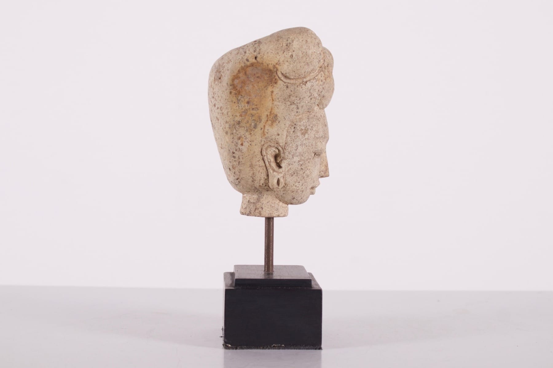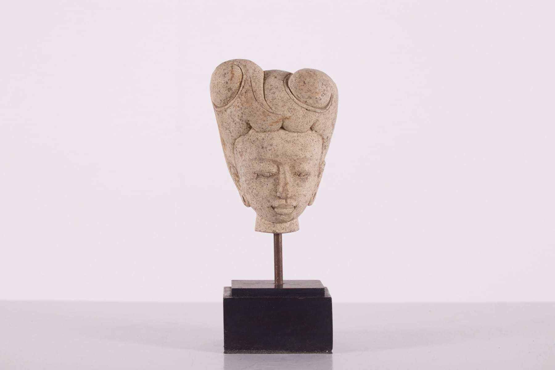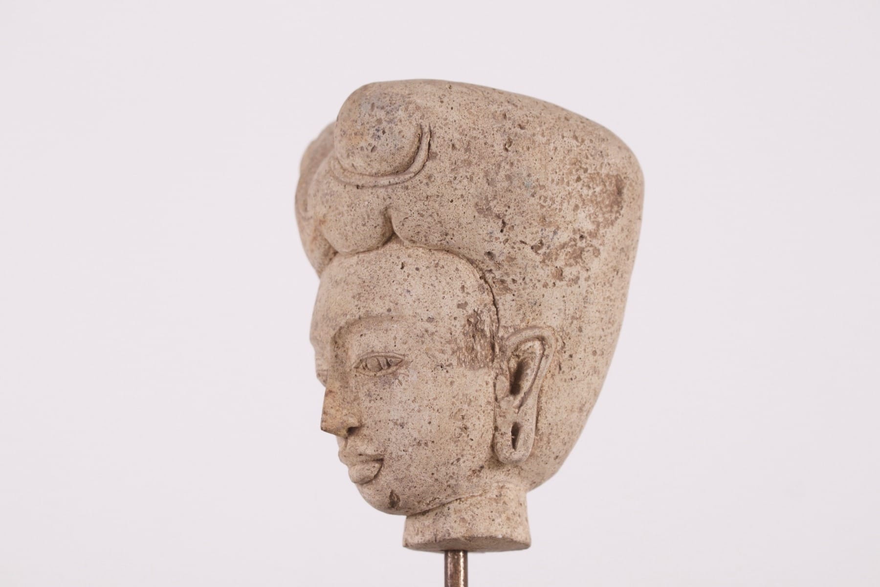 - Weiblicher Kopf, vielleicht eine Gottheit oder ein Würdenträger desMajapahit-Hofes, Sumatra, 13/15 Jh. Aus Tuffstein, einem vulkanischen Gestein, das durch die Ansammlung von Asche und Trümmern bei Eruptionen entstanden ist.