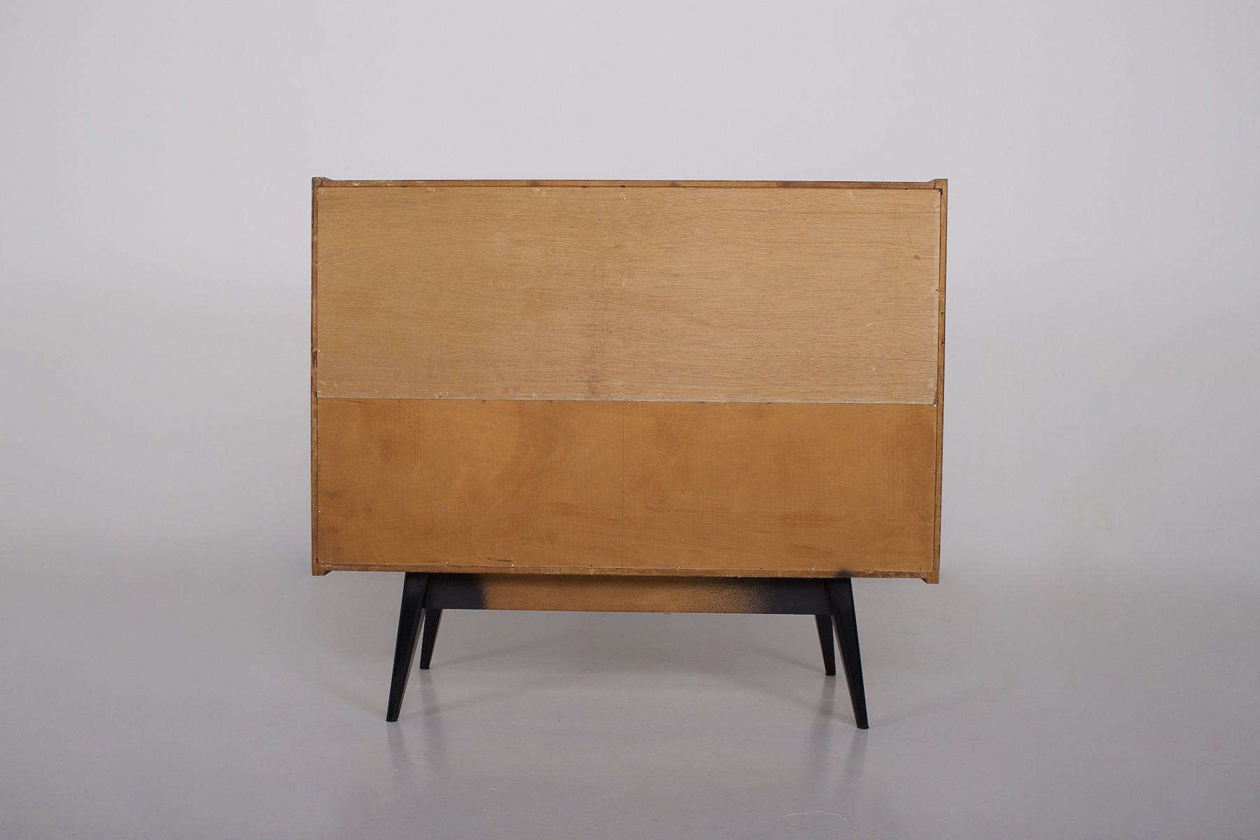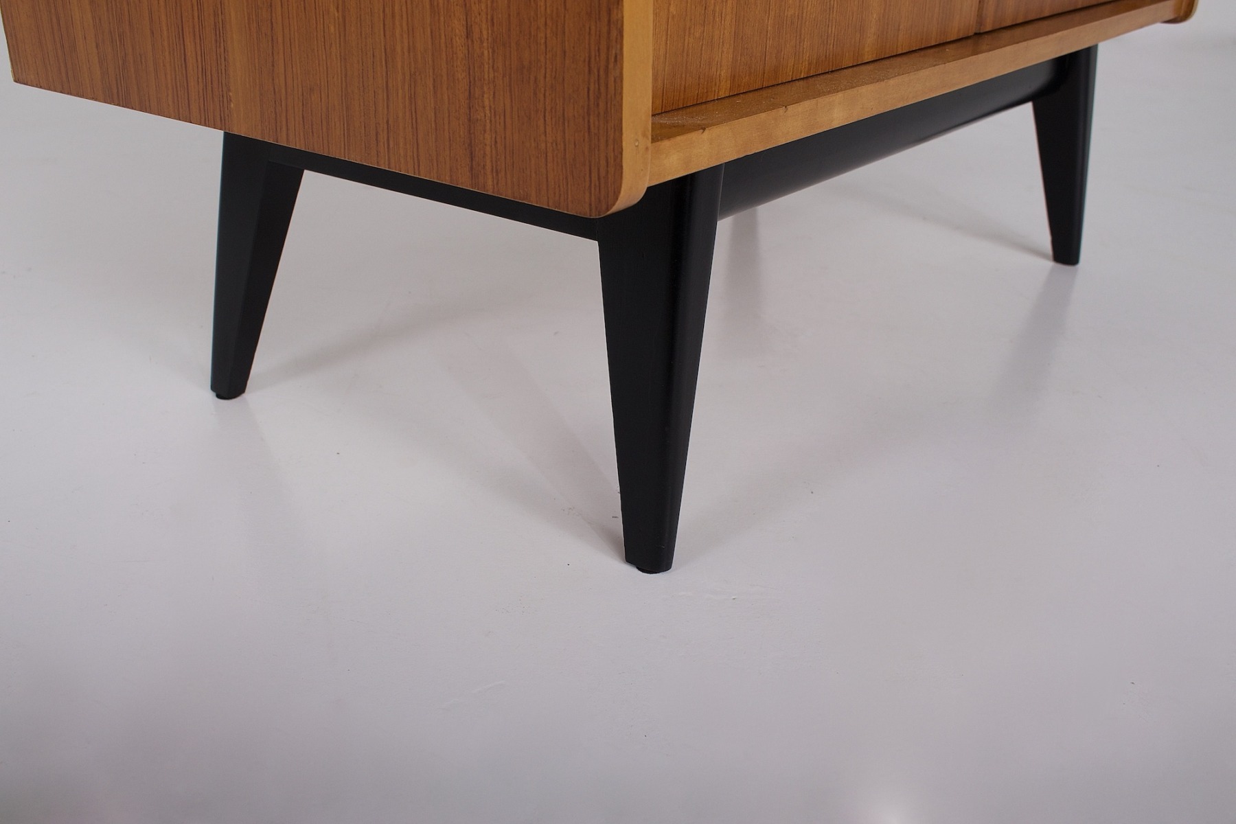 - Small two-door sideboard in exotic wood (Bubinga) on black-lacquered beech compass base. It opens with a free-form solid brass handle, a true signature of the 1950s.