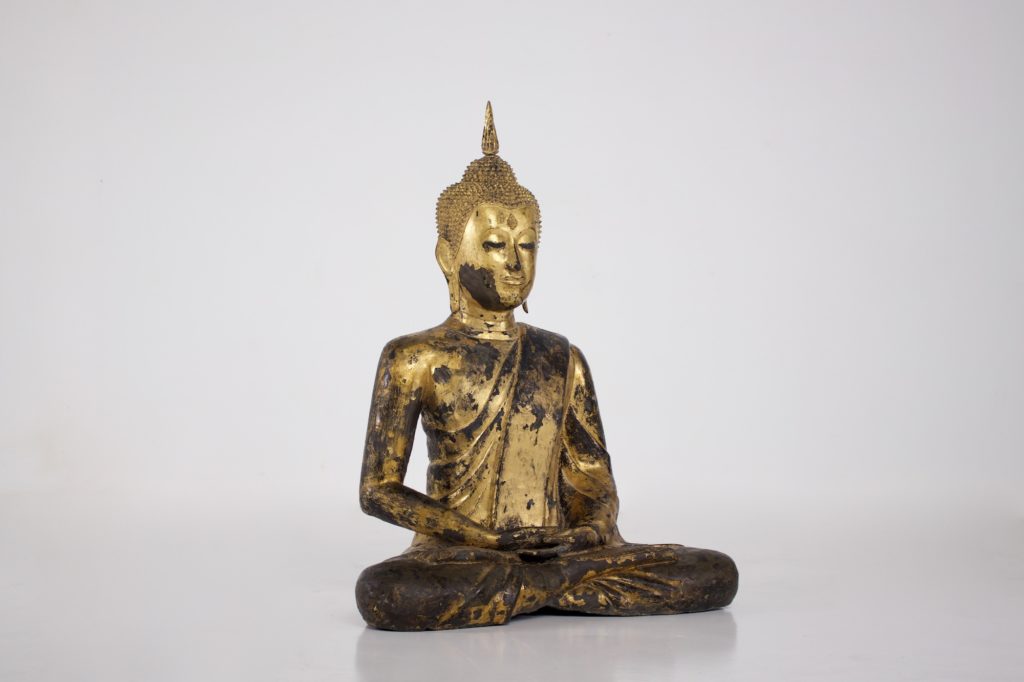 - This gilded bronze Buddha statue, 104 cm high, dates from the Rattanakosin period (1782-1932) in Thailand. Seated in lotus position(Padmasana), hands in meditative mudrā(dhyana mudra), the Buddha’s face is peaceful, with deeply incised eyelids and a delicately marked urna in the center of the forehead. His hair in regular curls and slenderusnisha add to the sculpture’s grace. On the soles of his feet are the 108 auspicious marks(lakshana) and the wheel of Dharma, symbolizing the virtues and the perfect, pure and timeless teaching of the Buddha. This element is frequently found in high-quality images.