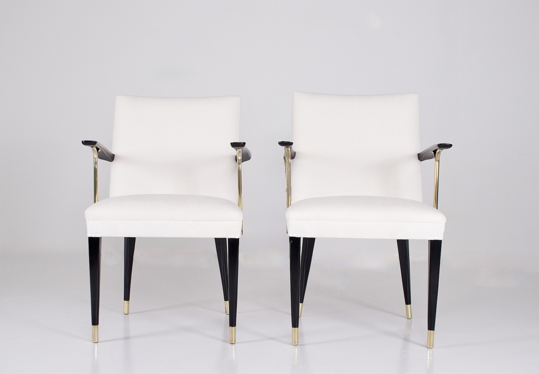 - Pair of modernist armchairs in beech lacquered black, the armrests resting on the brackets in brass solid polished, their base banded. 1950s edition.