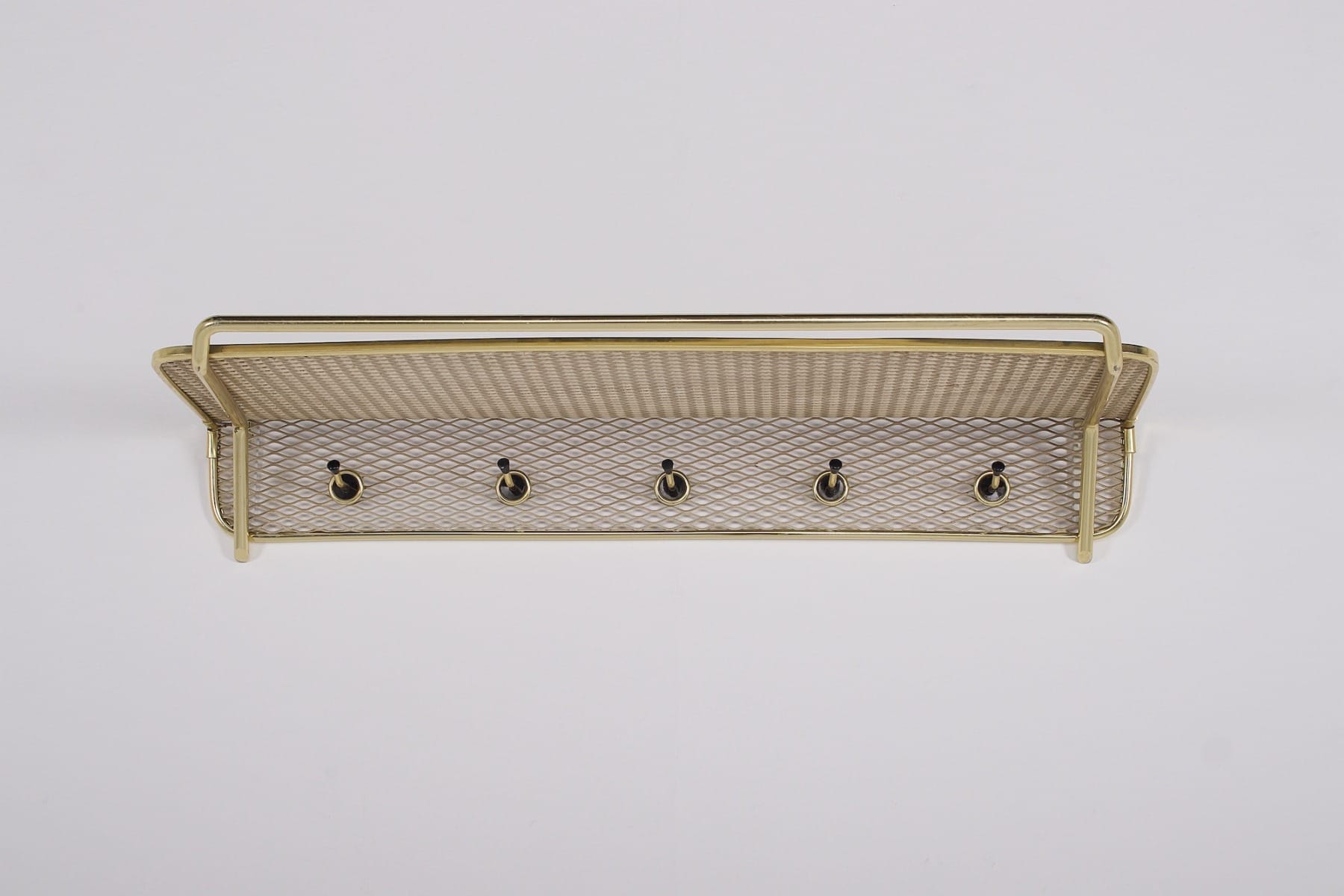 • Wall-mounted modernist coat rack in brass and gilded aluminum, with five hooks, covered with white lacquered steel mesh.