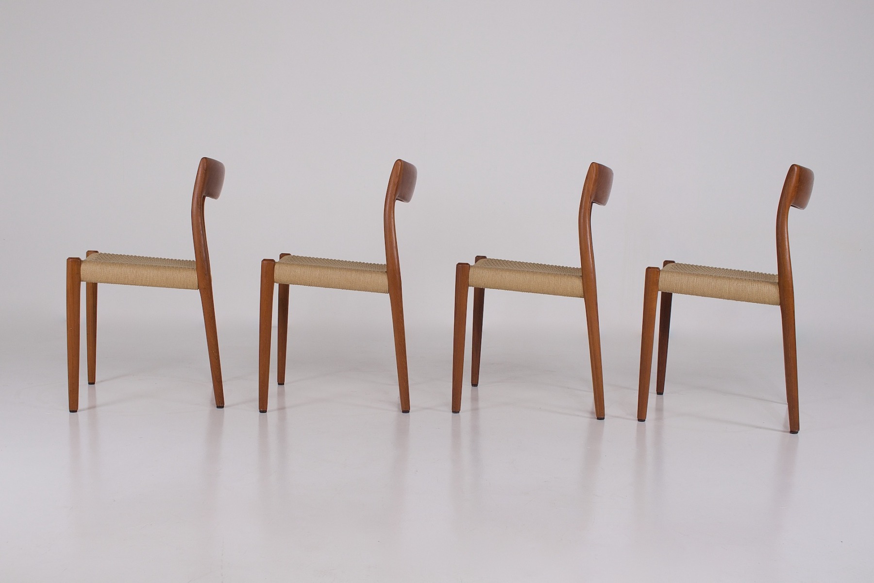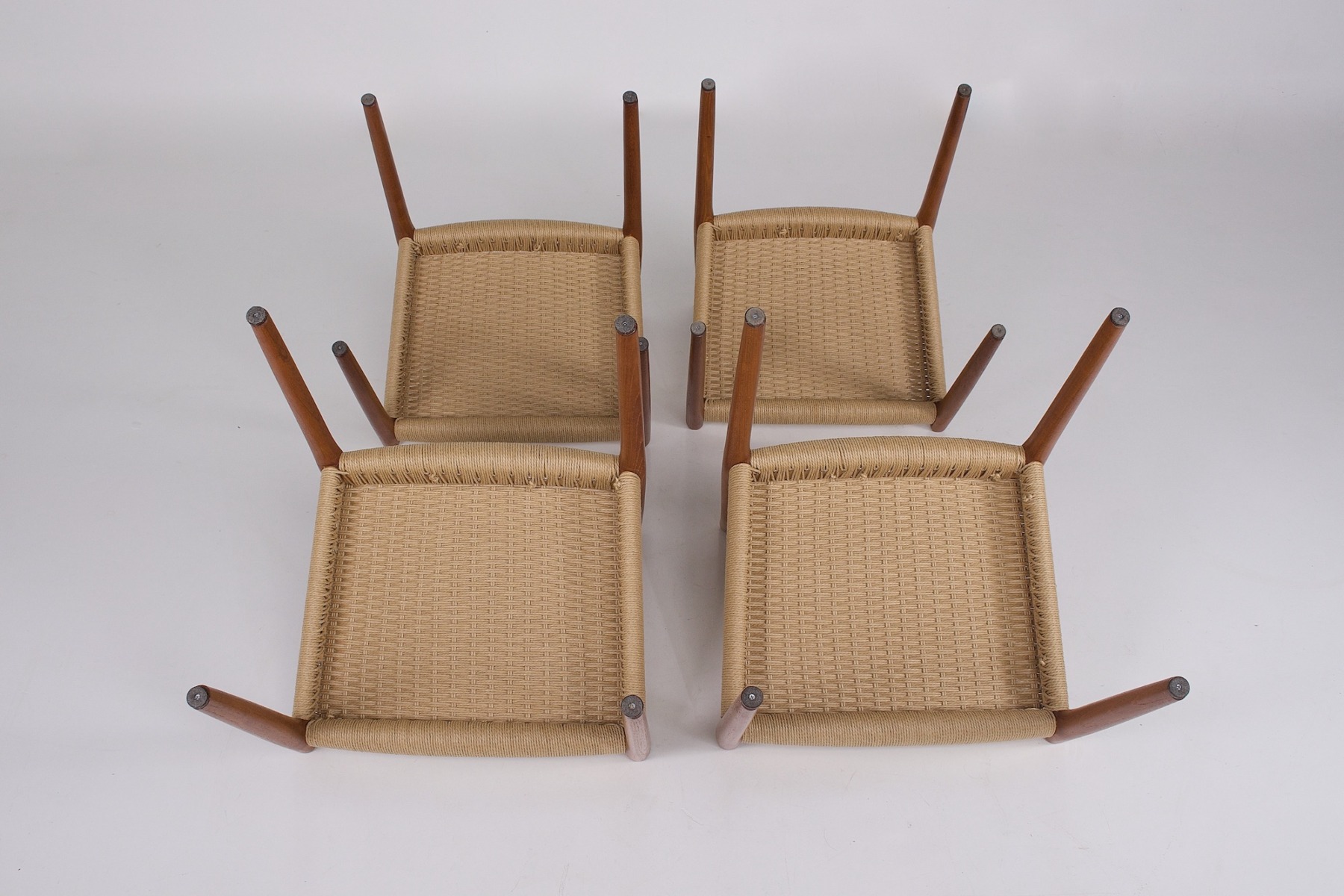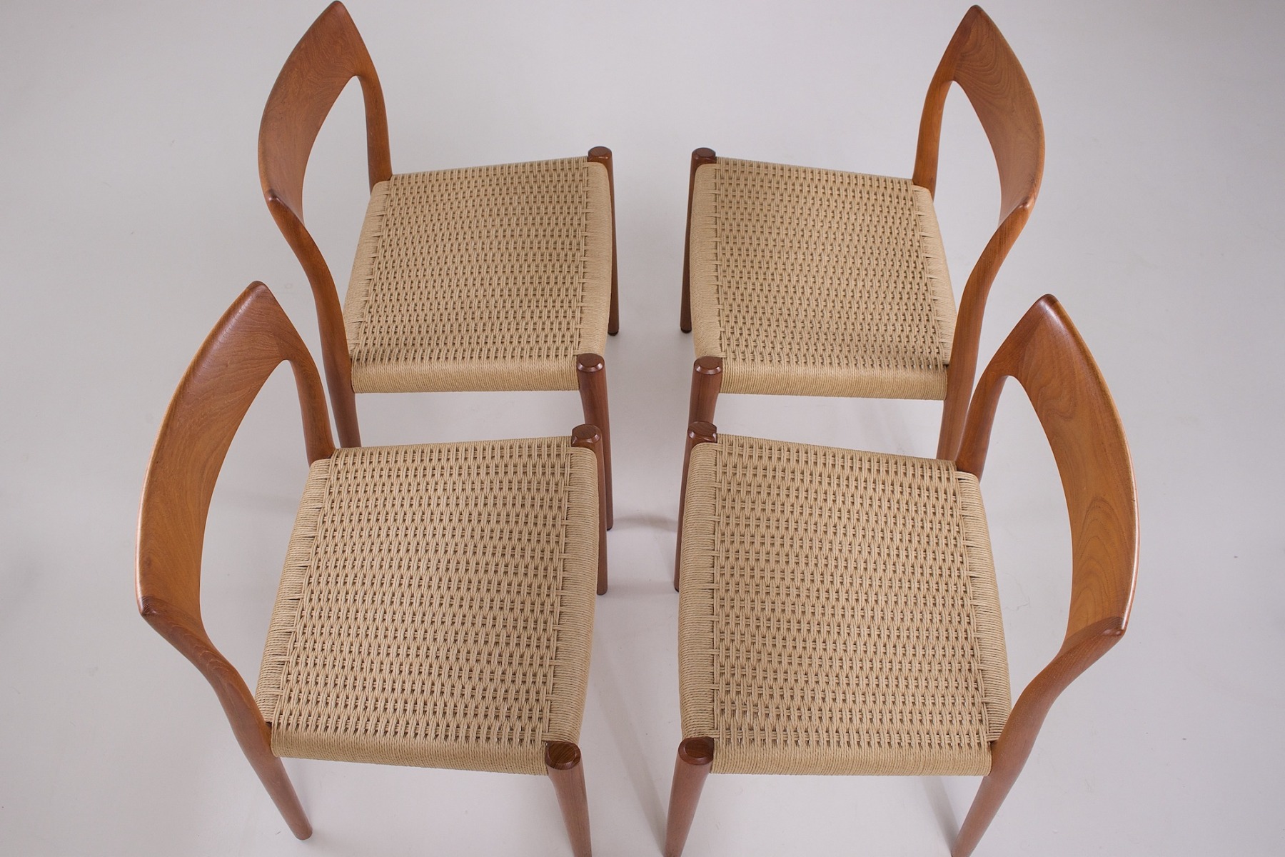 - Niels Otto Møller (1920-1982) per J.L. Møllers Møbelfabrik, suite di 4 sedie in teak, sedute intrecciate con corda di carta danese. Edizione originale degli anni ’60