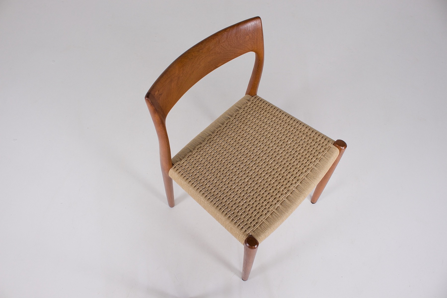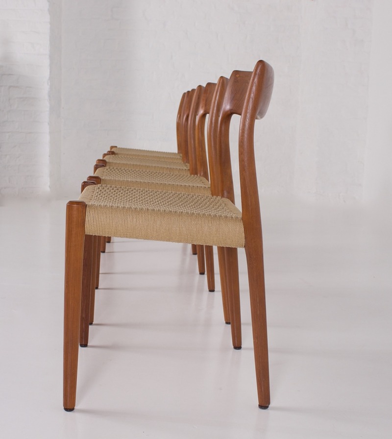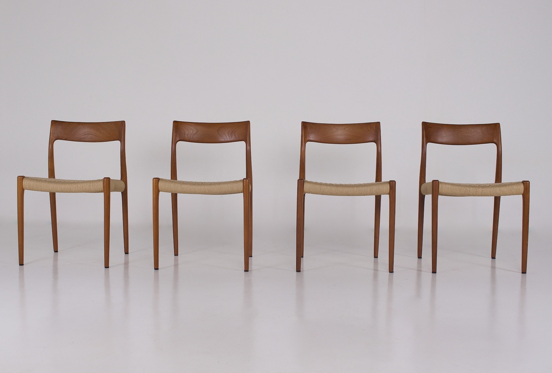 - Niels Otto Møller (1920-1982) per J.L. Møllers Møbelfabrik, suite di 4 sedie in teak, sedute intrecciate con corda di carta danese. Edizione originale degli anni ’60