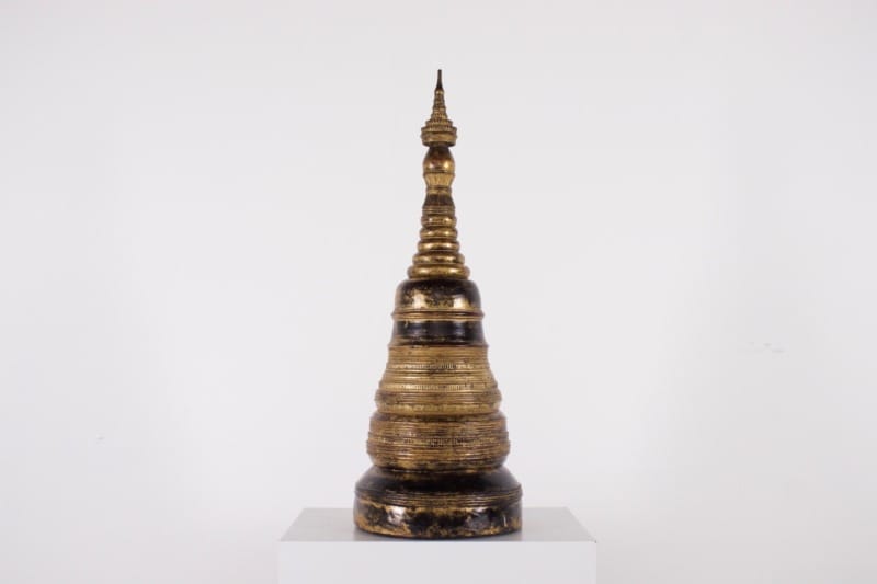Questo antico stupa birmano in legno dorato è un oggetto votivo legato al culto buddista che riproduce in scala ridotta la forma dello stupa, un monumento centrale della tradizione buddista. In sostanza, lo stupa è concepito come un monumento reliquiario, destinato a evocare la presenza del Buddha o di eminenti maestri e, talvolta, a ospitare reliquie sacre. Nel caso degli stupa portatili o domestici, questa funzione è spesso simbolica, anche se la presenza effettiva di reliquie non può essere stabilita sistematicamente.
