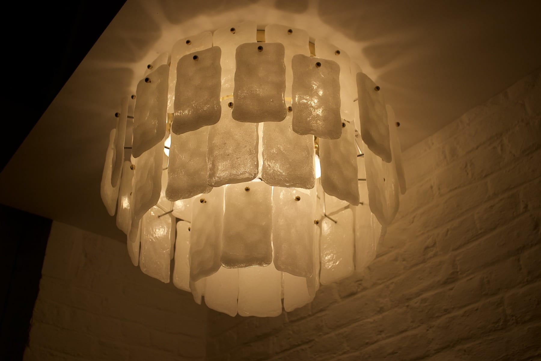 - Gli elementi in vetro, lavorati con le pinze, presentano sottili inclusioni d’aria. La loro superficie interna è punteggiata di microcristalli di vetro e delicatamente polverizzata d’oro, un trattamento che amplifica i giochi di luce a contatto con la struttura in ottone.
