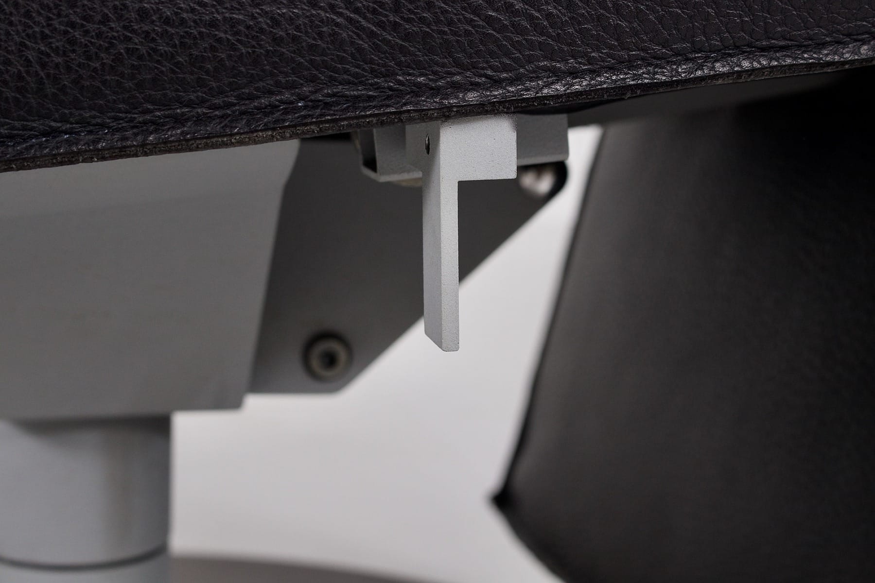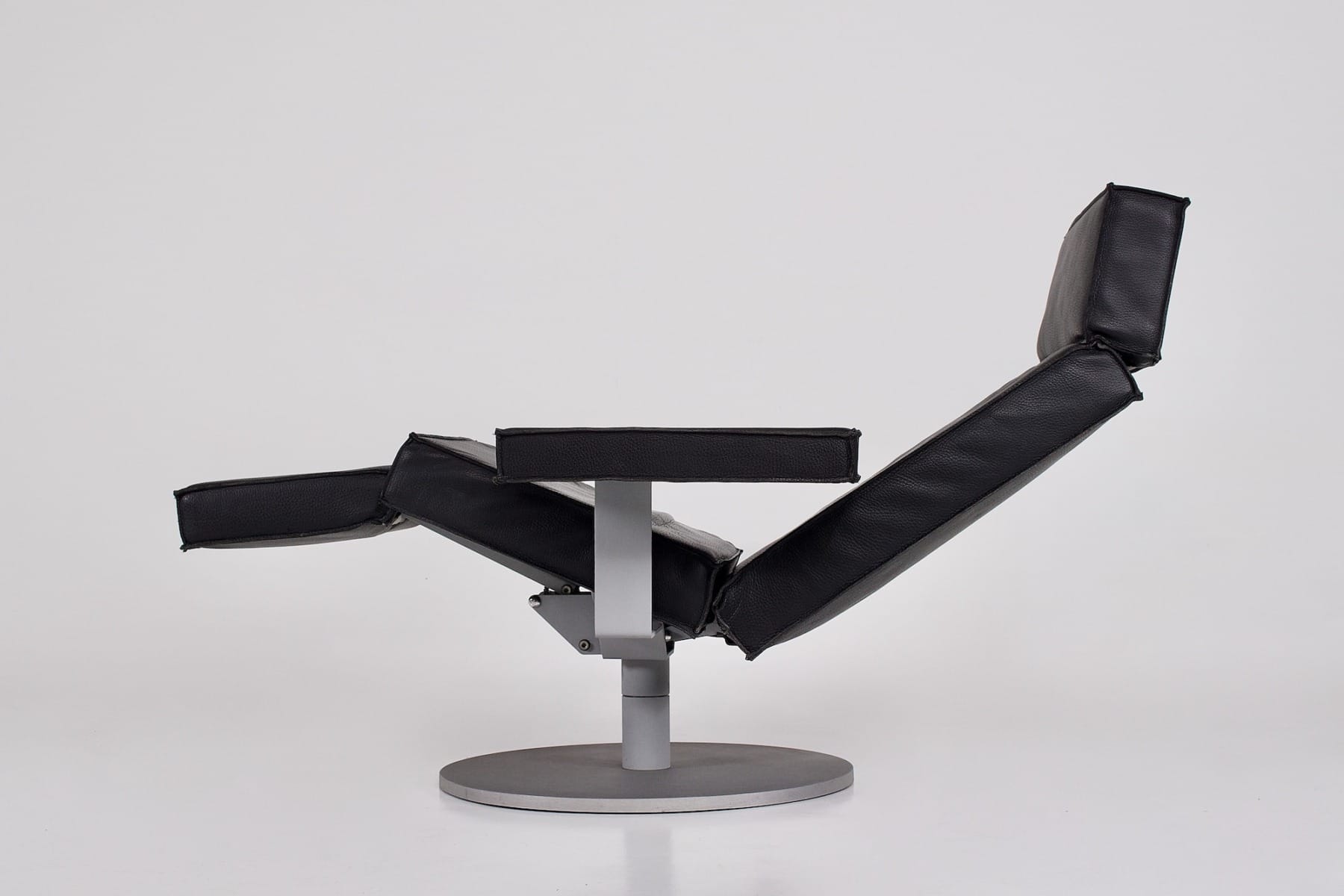 La seduta è composta da volumi rettilinei rivestiti in pelle nera, utilizzando il vocabolario minimalista caratteristico di Van Severen: blocchi puliti, proporzioni controllate e assenza di dettagli superflui. La seduta, lo schienale e il poggiagambe sono organizzati in una continuità geometrica che rafforza la leggibilità del gesto progettuale. I cuscini rimangono solidi, perfettamente calibrati per mantenere una postura stabile, pur conservando la purezza visiva caratteristica del lavoro del designer belga. La Maarten Van Severen Durlet Lounge Chair ha una struttura che amplifica questa estetica pura.