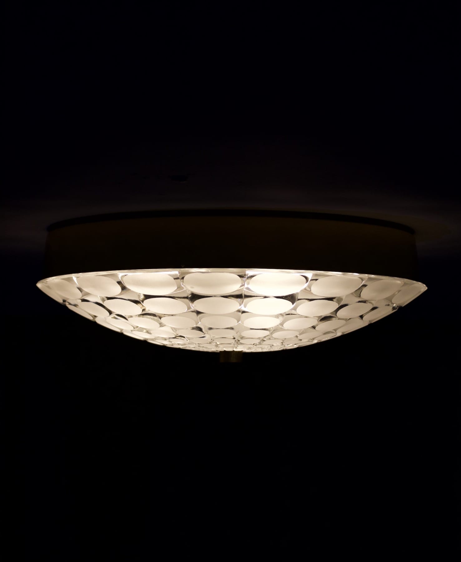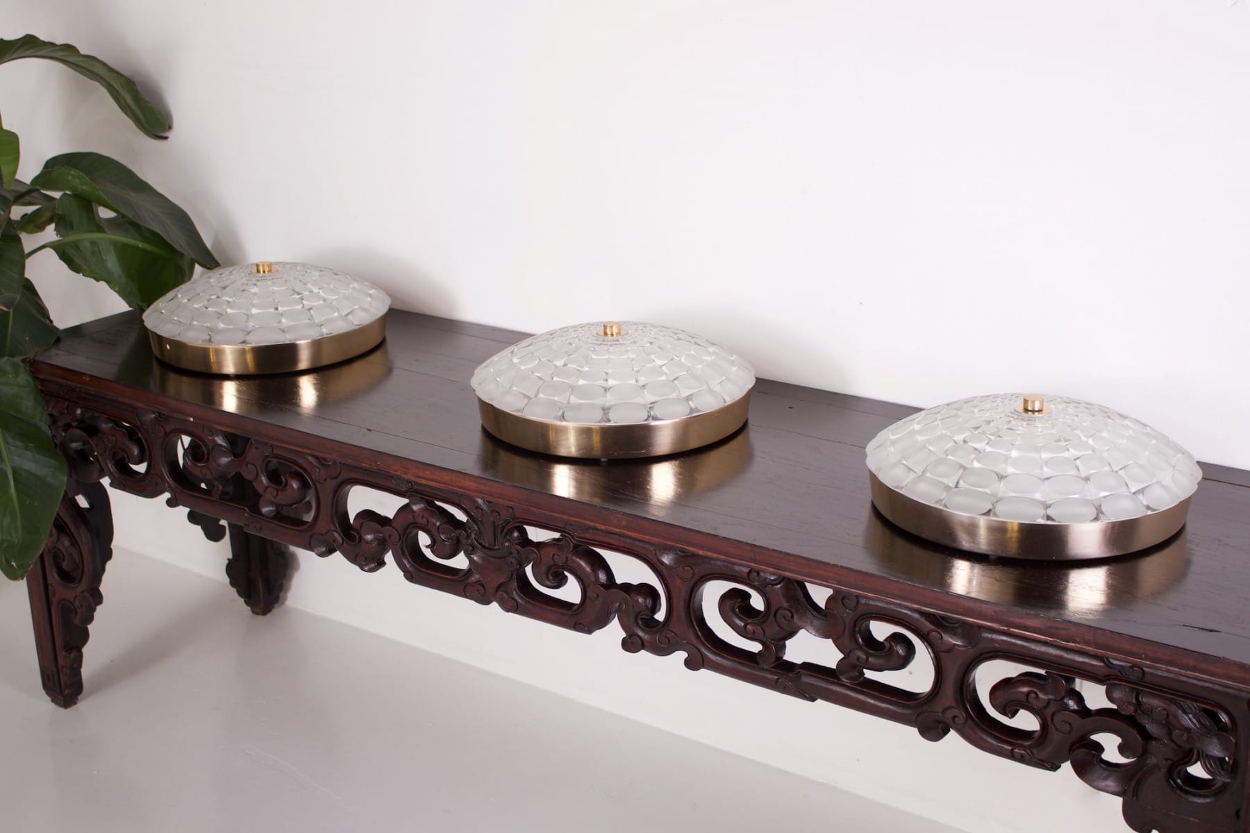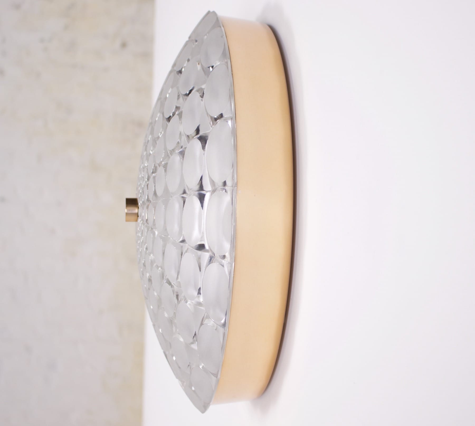 - Lampada da parete o soffitto, corpo in ottone massiccio ricoperto da una cupola di vetro con motivi concentrici smerigliati. Opera degli anni ’70, 3 lampadine LED E 27 in dotazione.