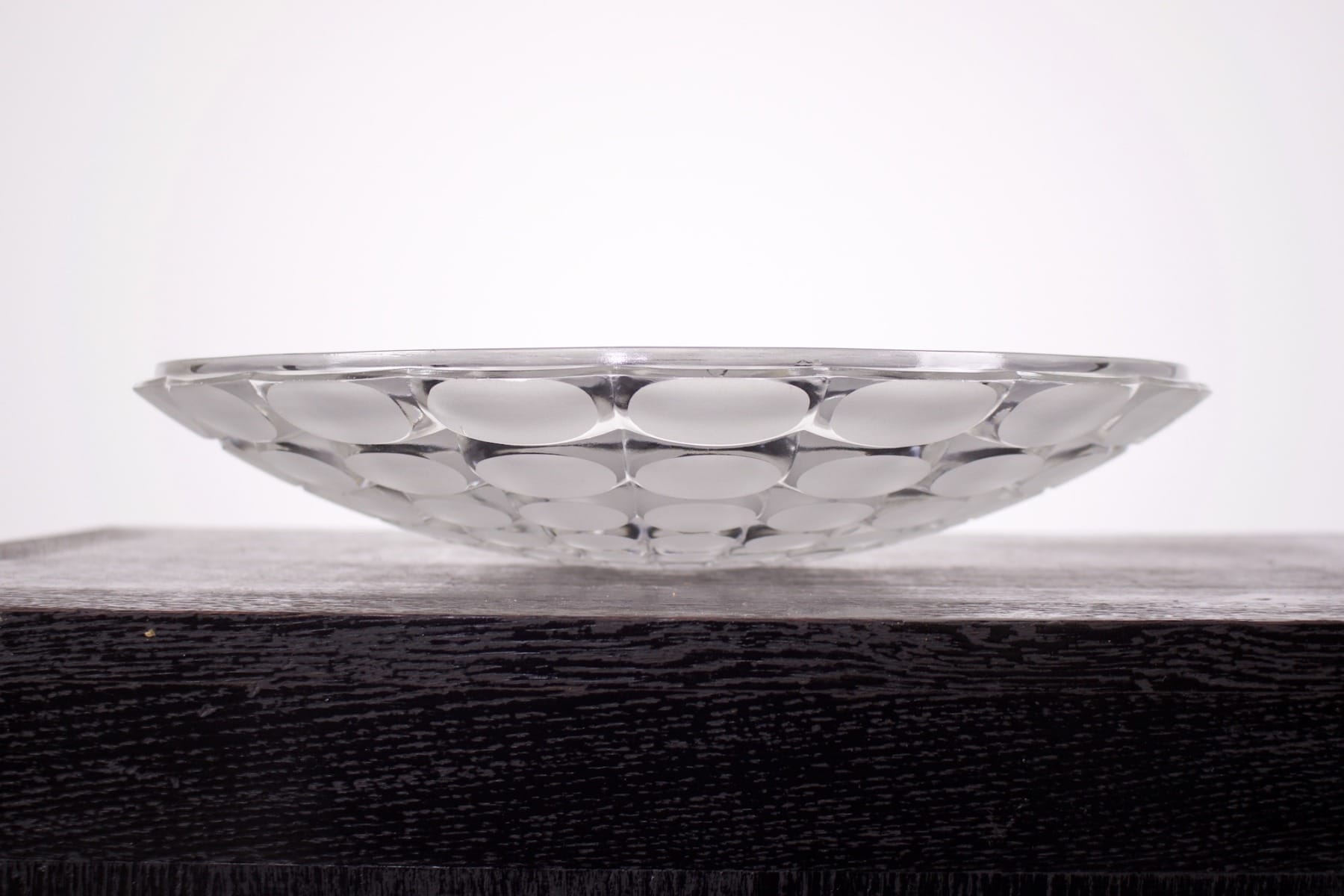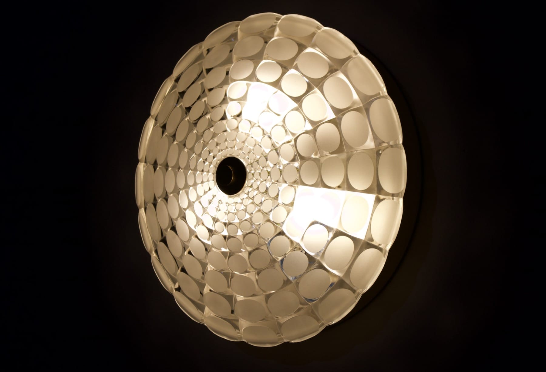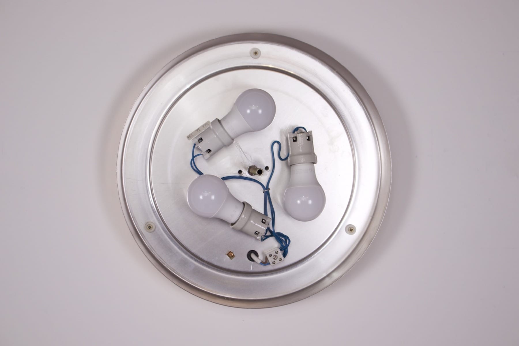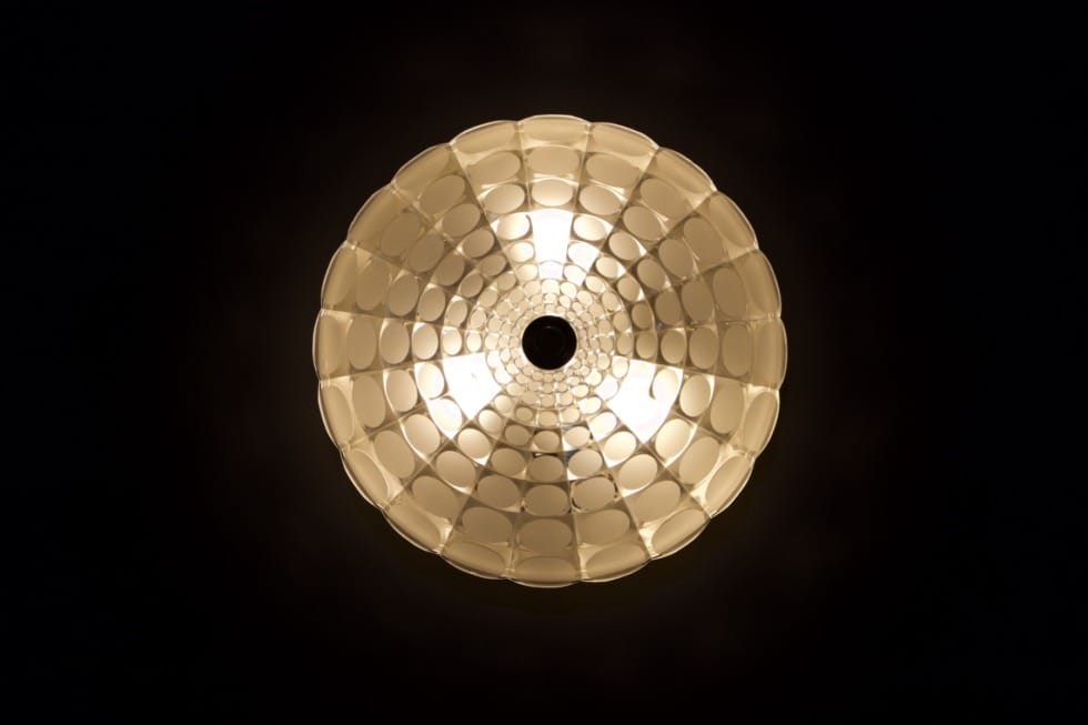 - Lampada da parete o soffitto, corpo in ottone massiccio ricoperto da una cupola di vetro con motivi concentrici smerigliati. Opera degli anni ’70, 3 lampadine LED E 27 in dotazione.