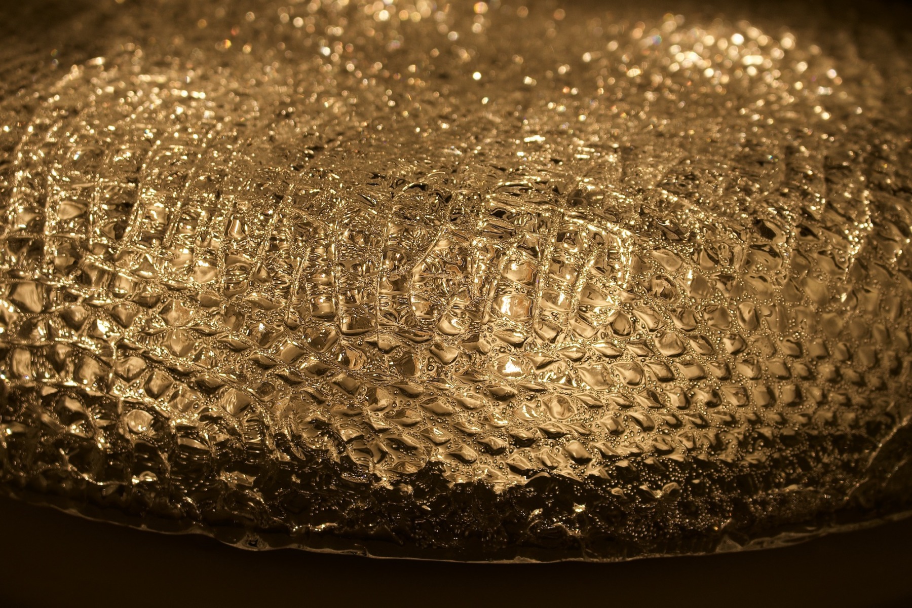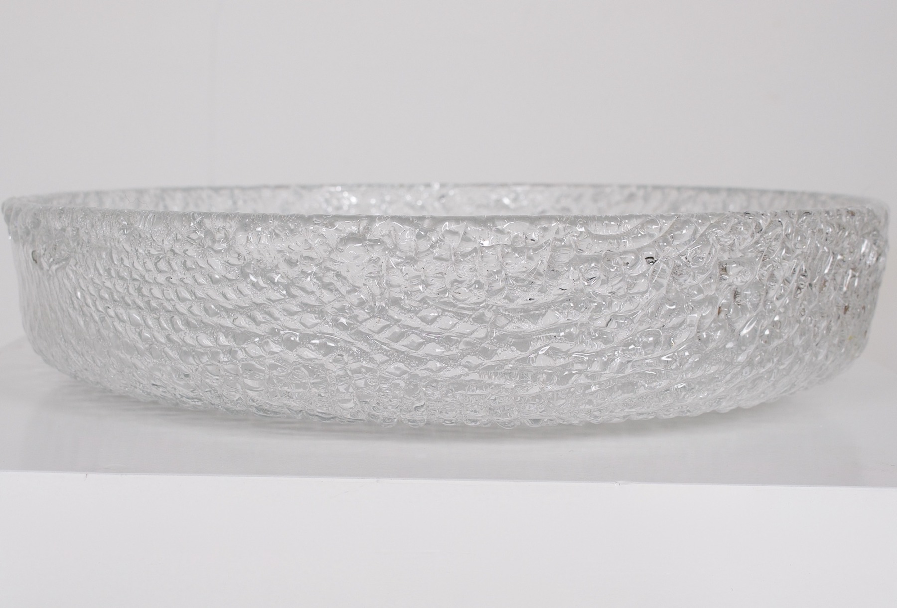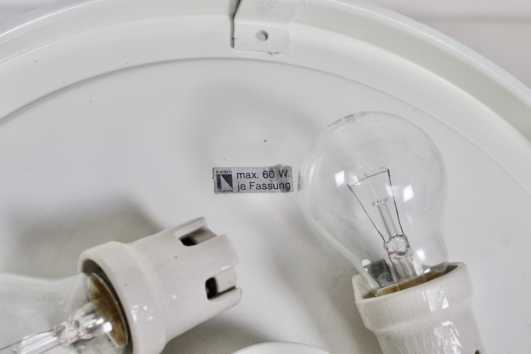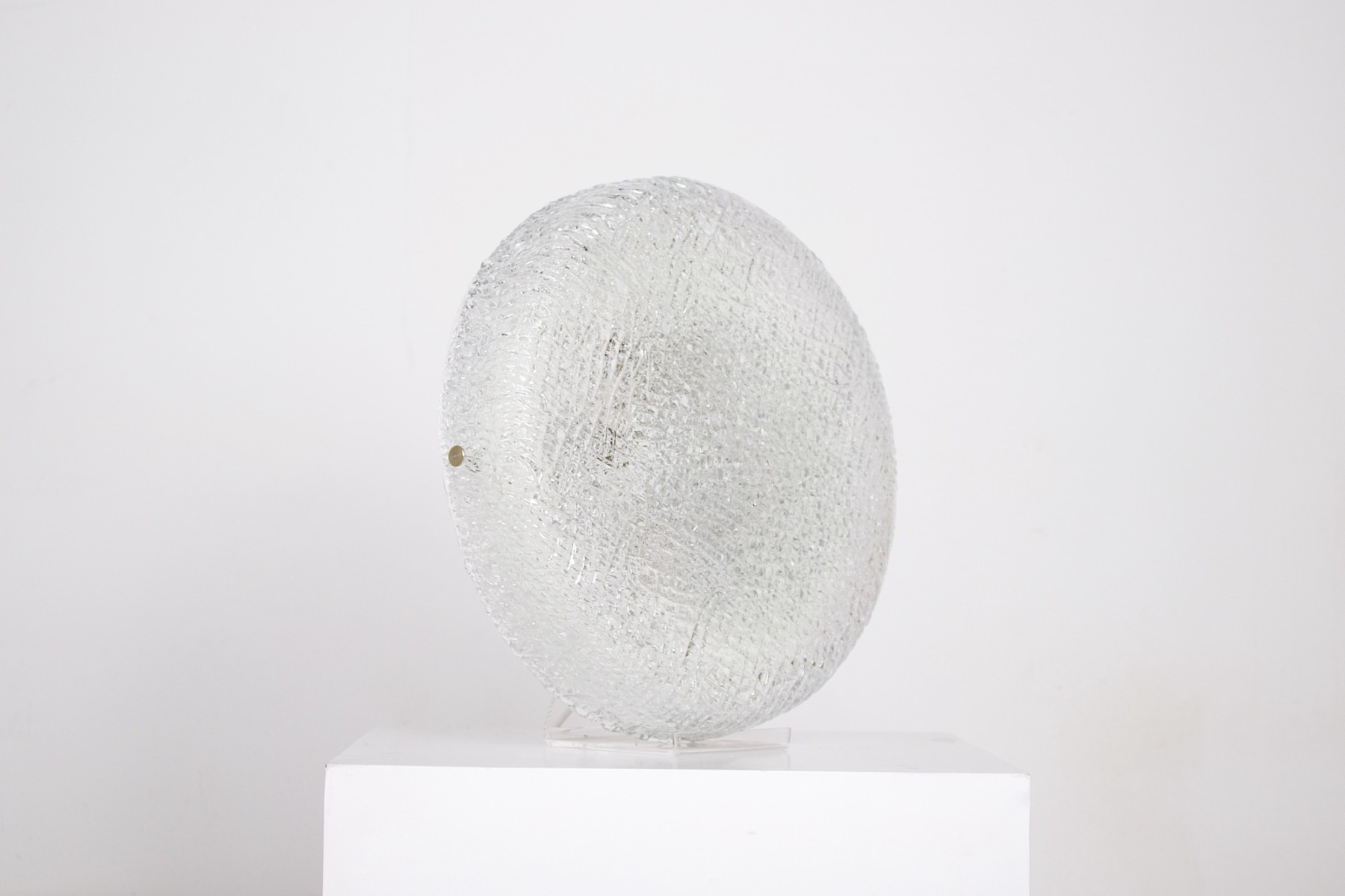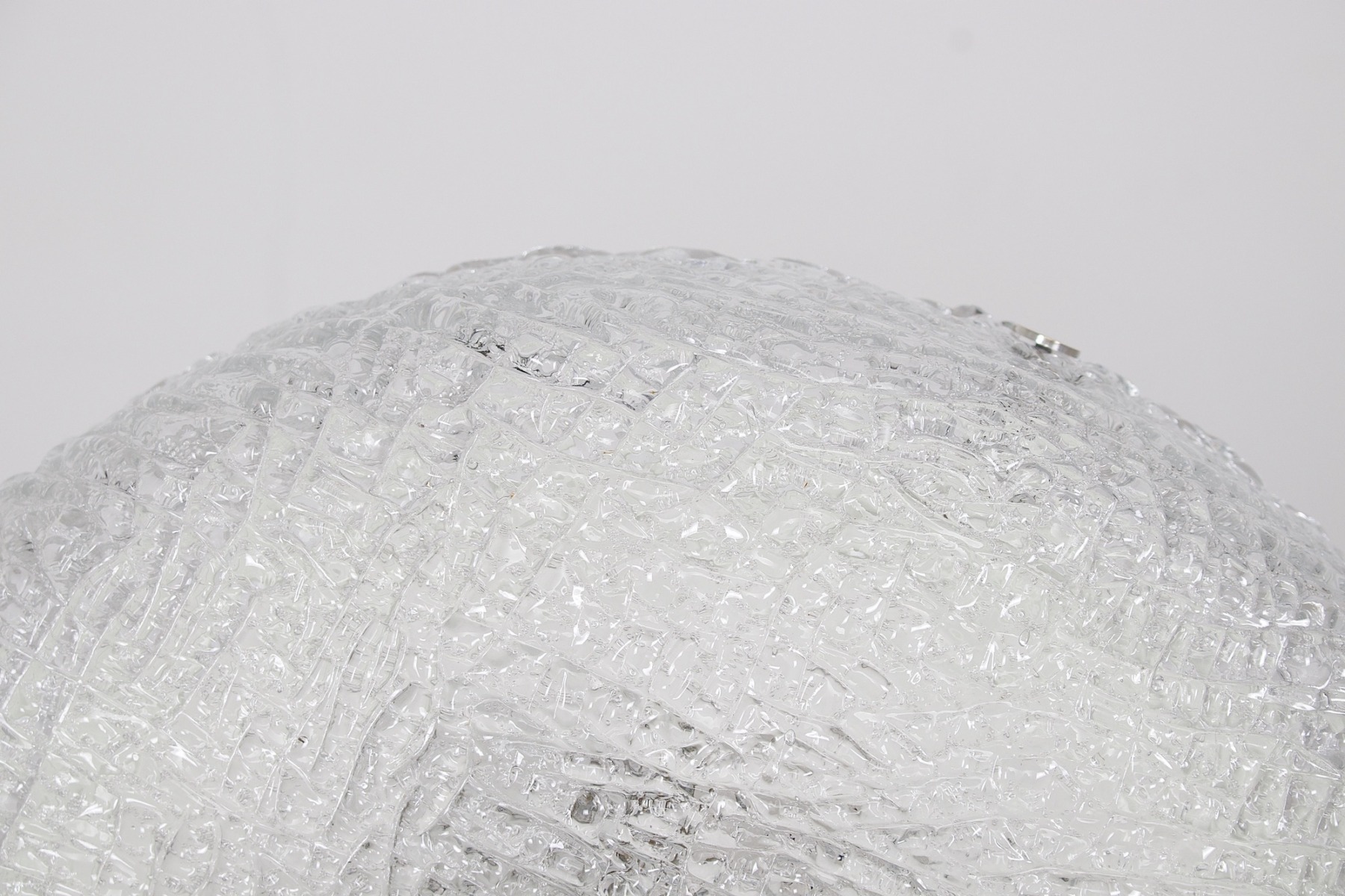 - Plafoniera tonda in vetro smerigliato a texture profonda, fissata alla base con 3 elementi di fissaggio cromati, edizione Kaiser del 1970 circa.