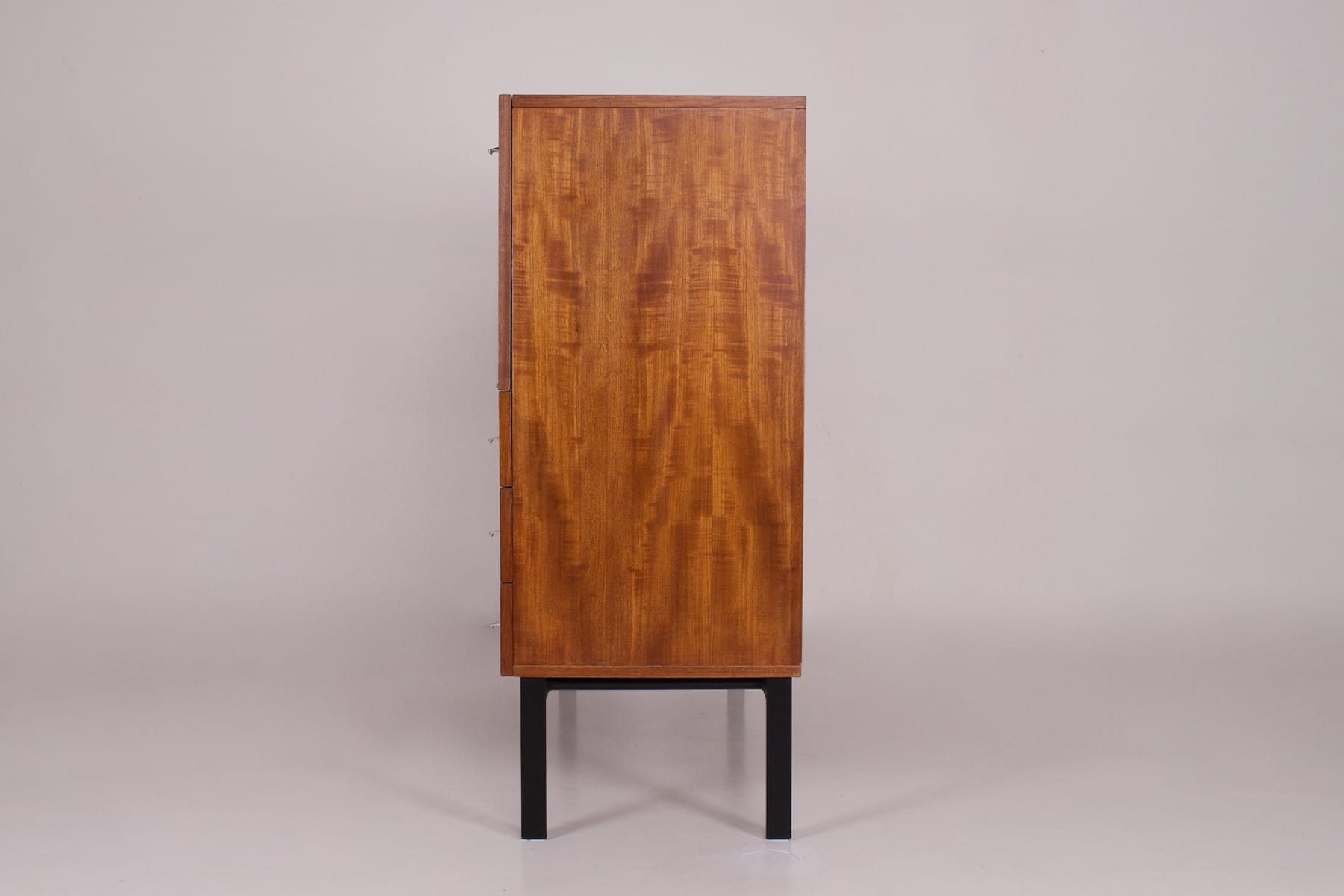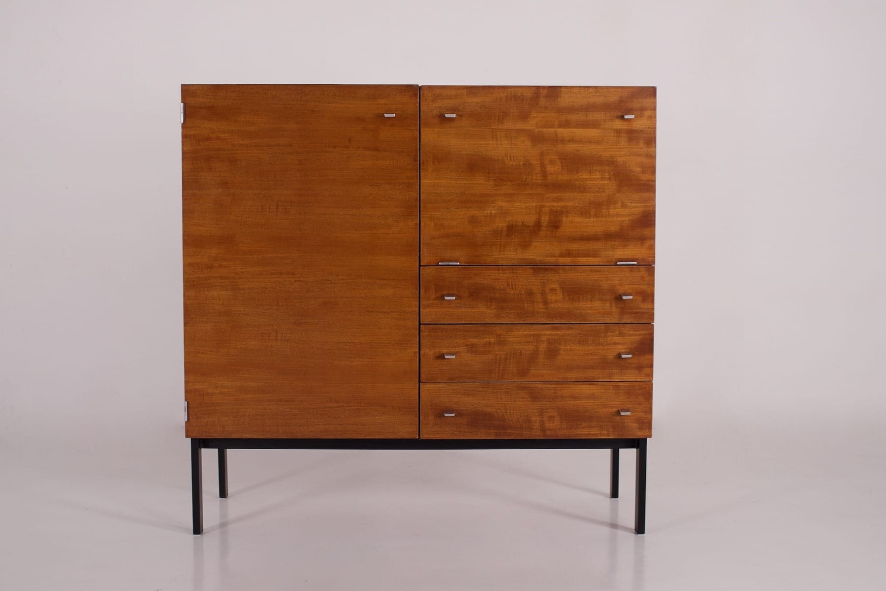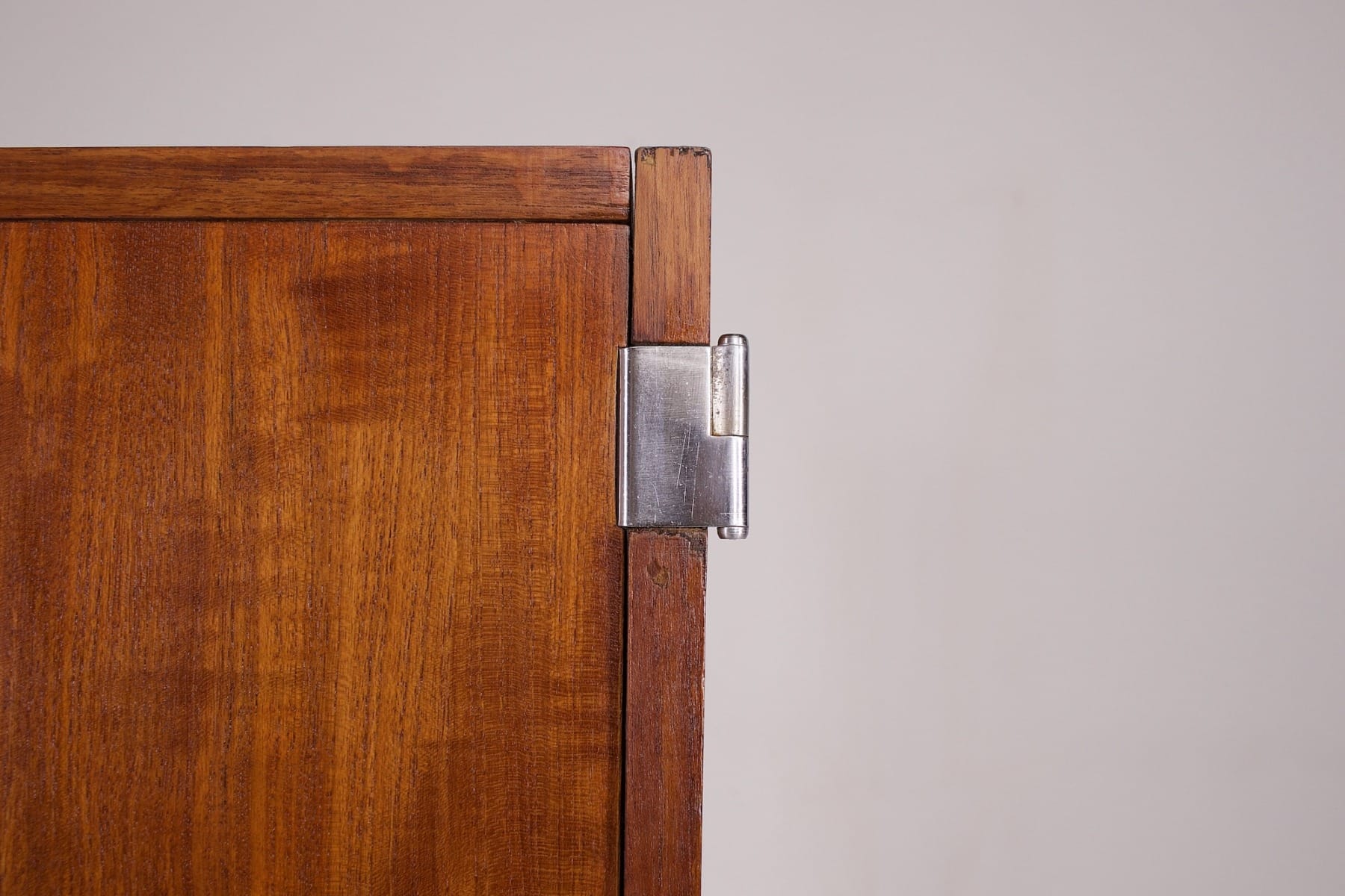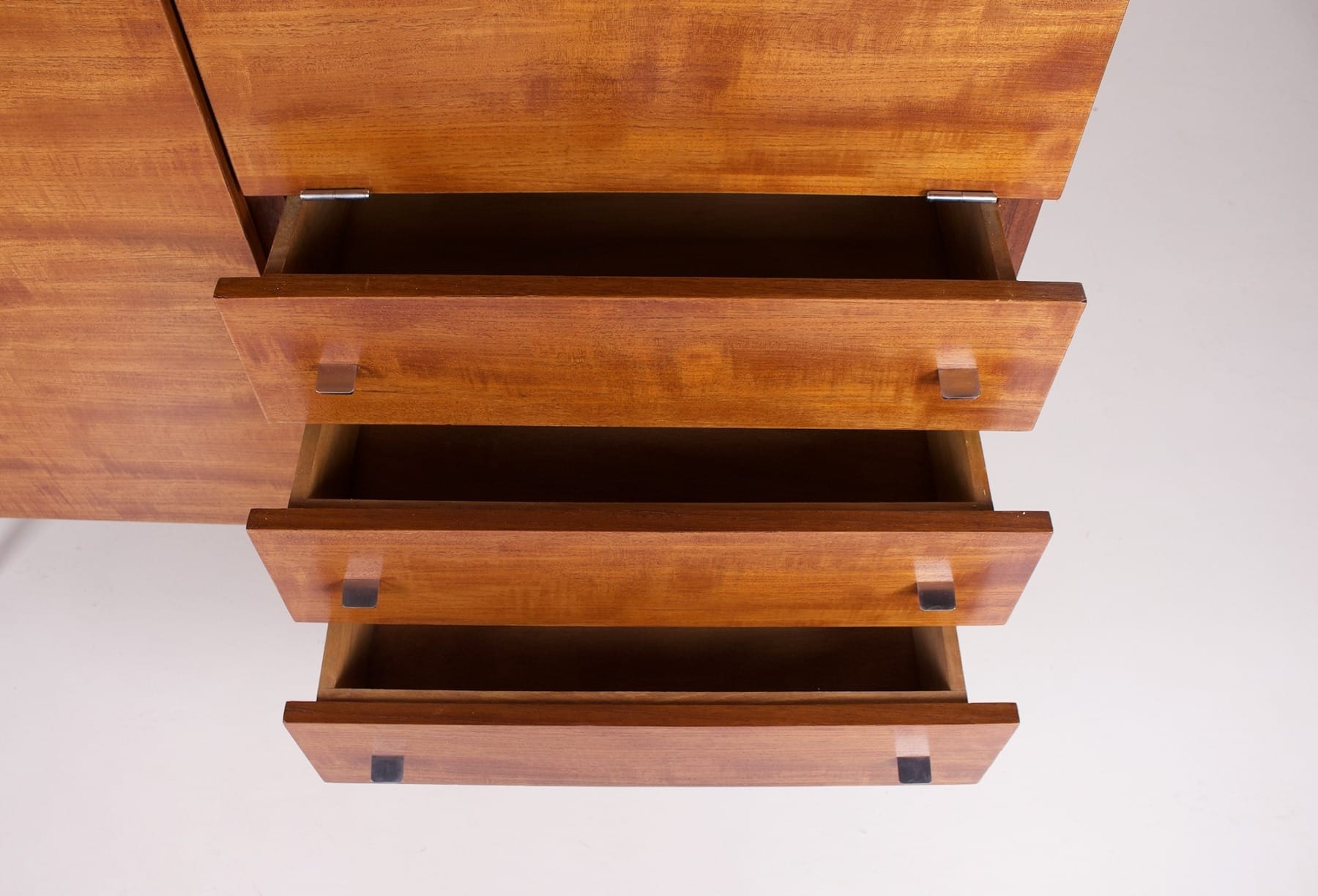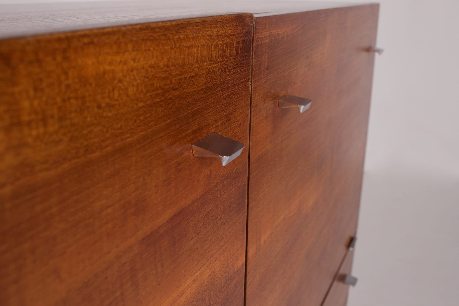 - Nonostante la produzione di massa dell’epoca, le impiallacciature di questo mobile sono molto particolari e cangianti alla luce.