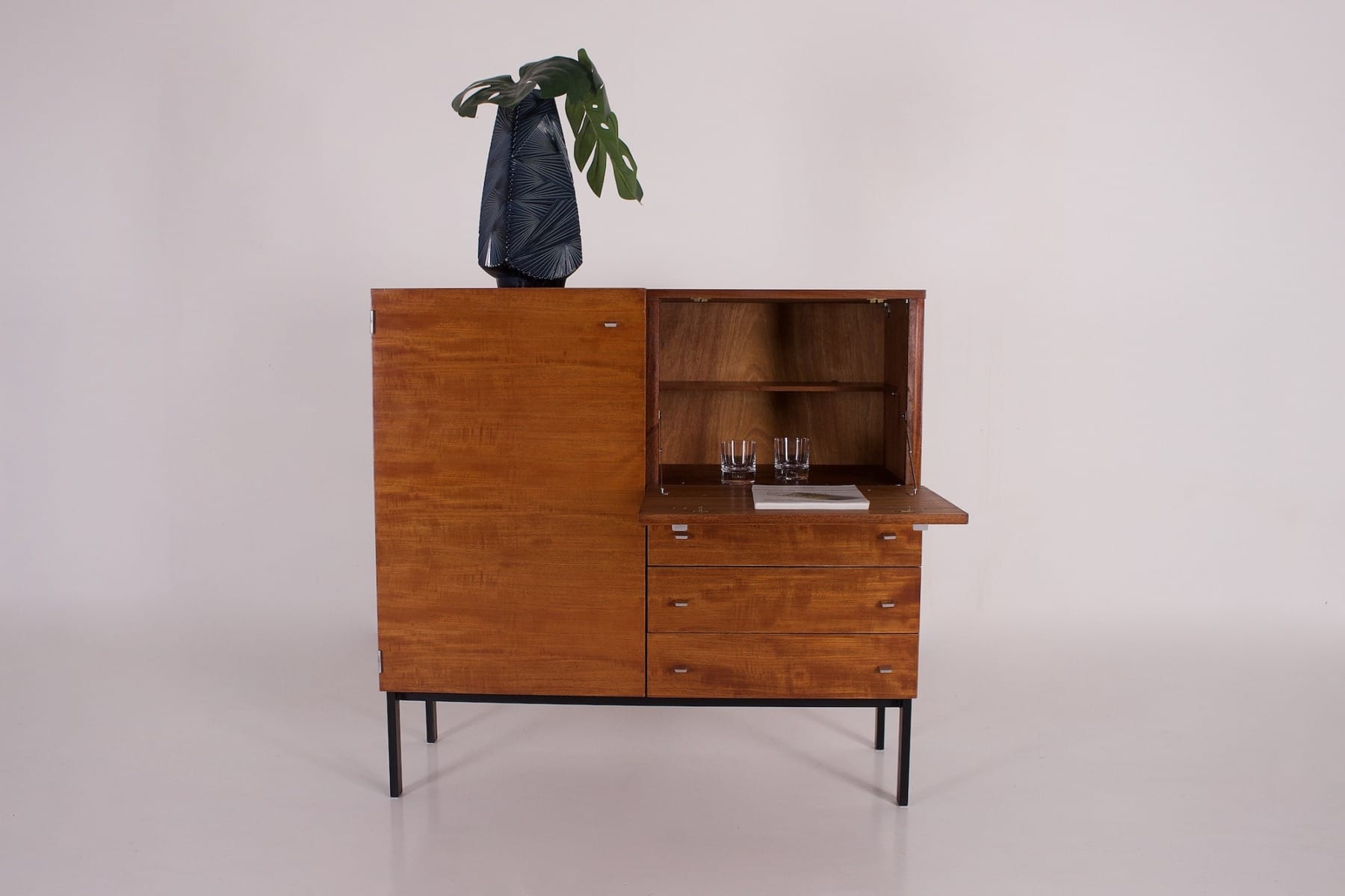 - Mobile bar in teak disegnato da Pierre Guariche per Meurop, pubblicato negli anni ’60.