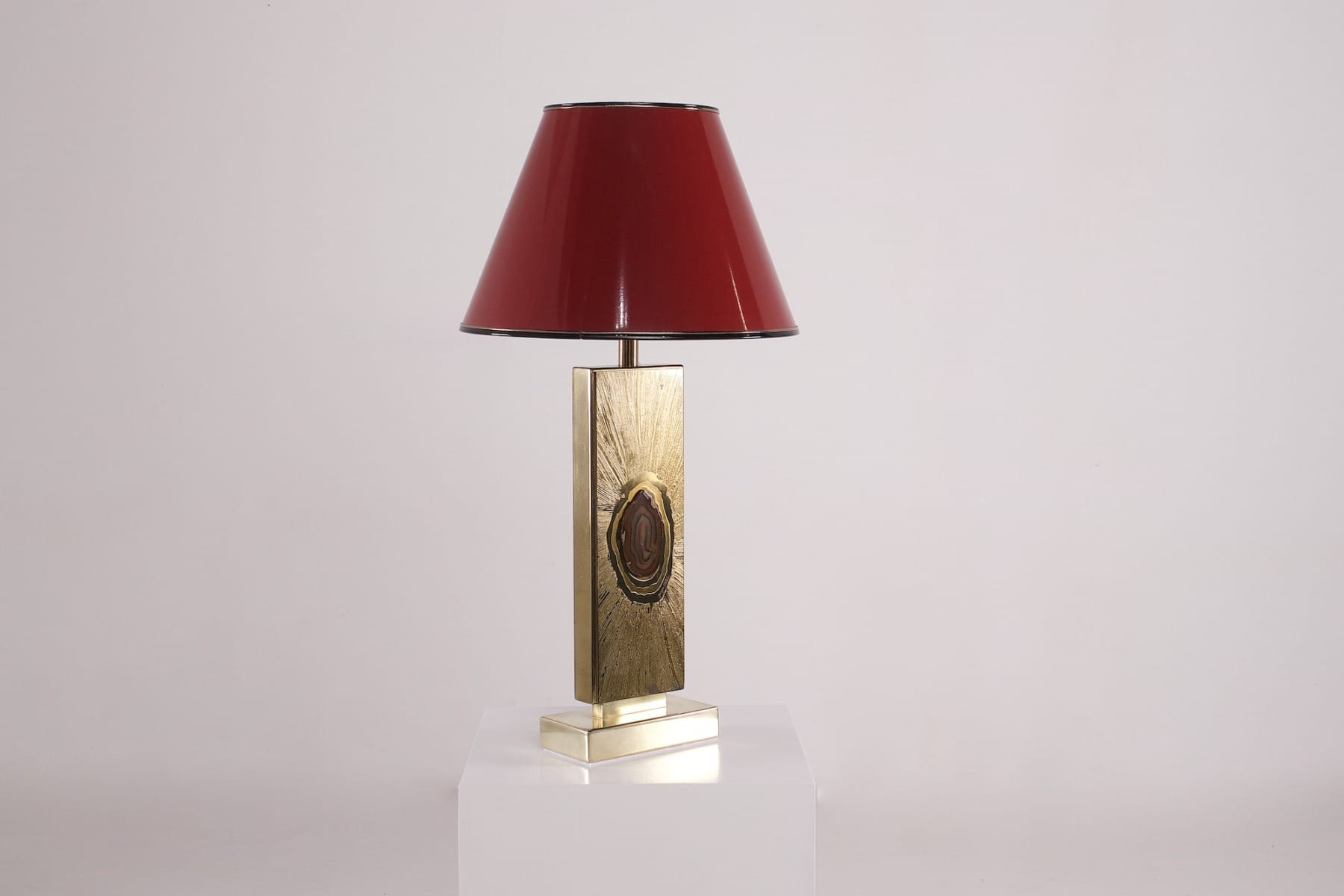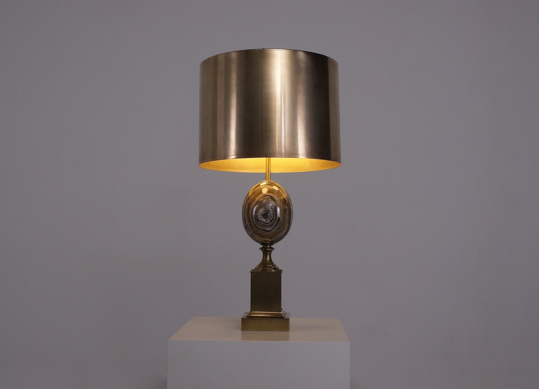 - Willy Daro, lamp met massief messing voet, versierd met een agaatkwart en voorzien van een grote antieke lampenkap van dik zwart glanzend papier met gouden voering. Begin jaren 1970.
