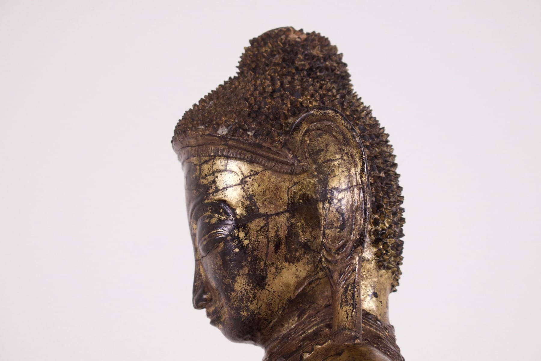 - De zijkanten van de troon en de vlam zijn door de eeuwen heen verdwenen, maar het beeld is bewaard gebleven: de adel van het gezicht, evenwichtig en gracieus, herinnert aan zijn serene meditatie.
