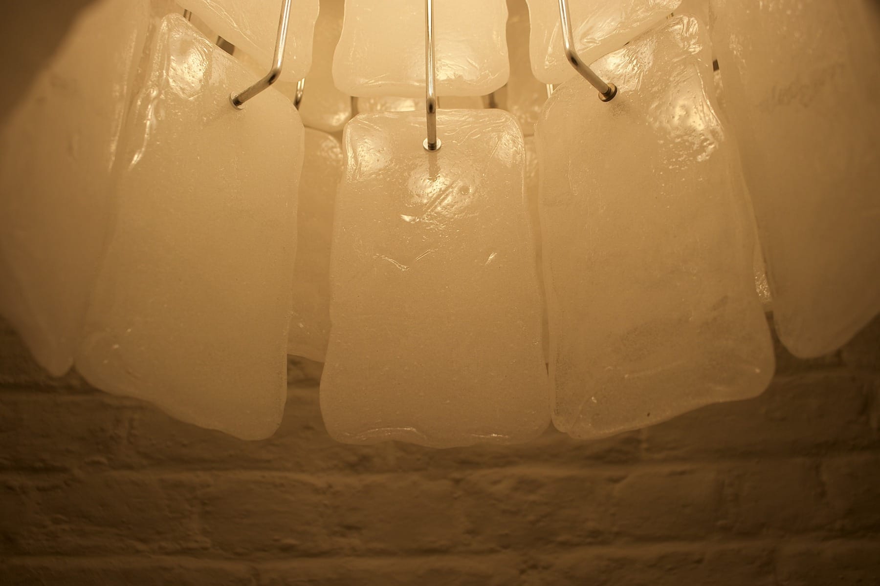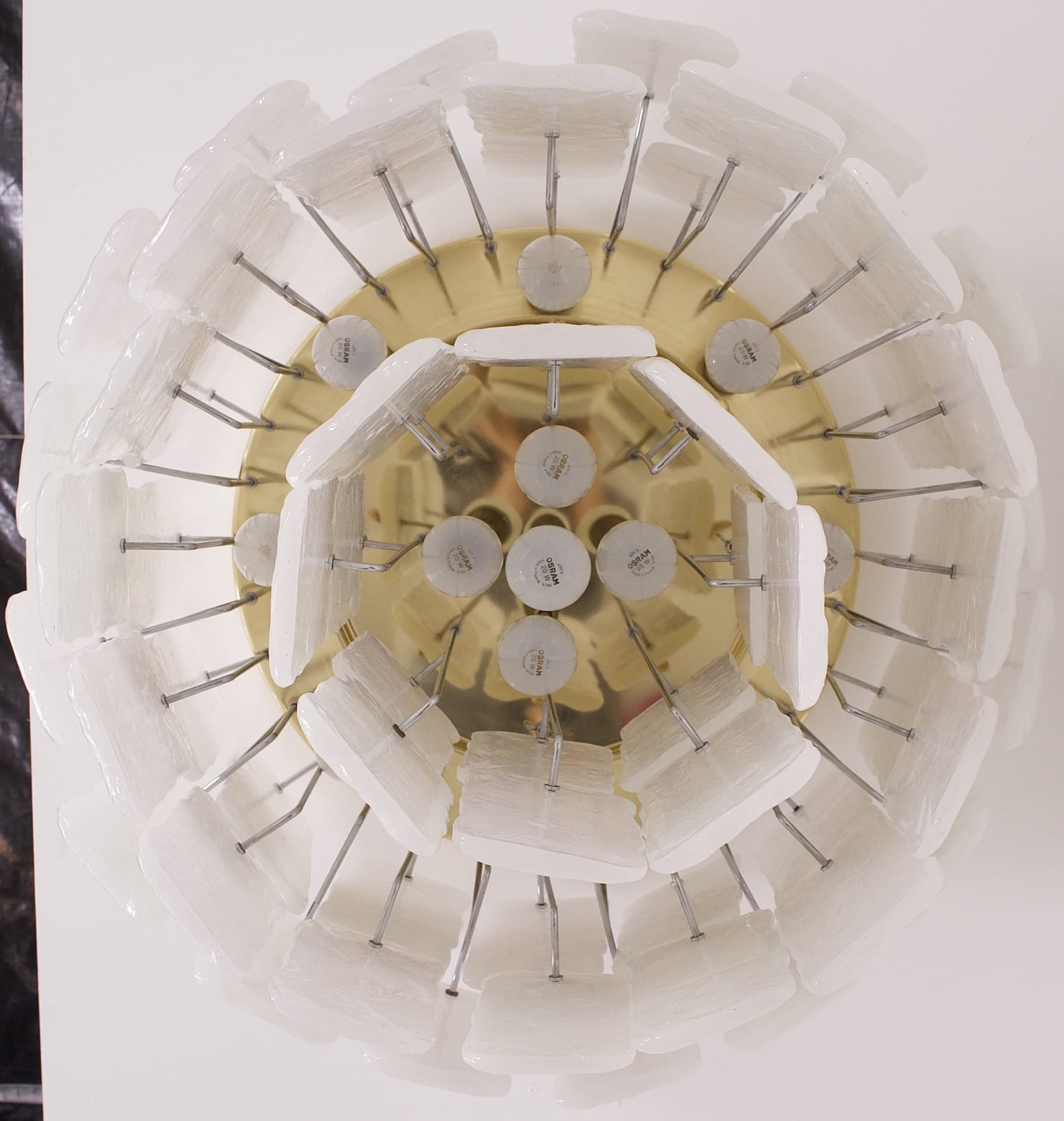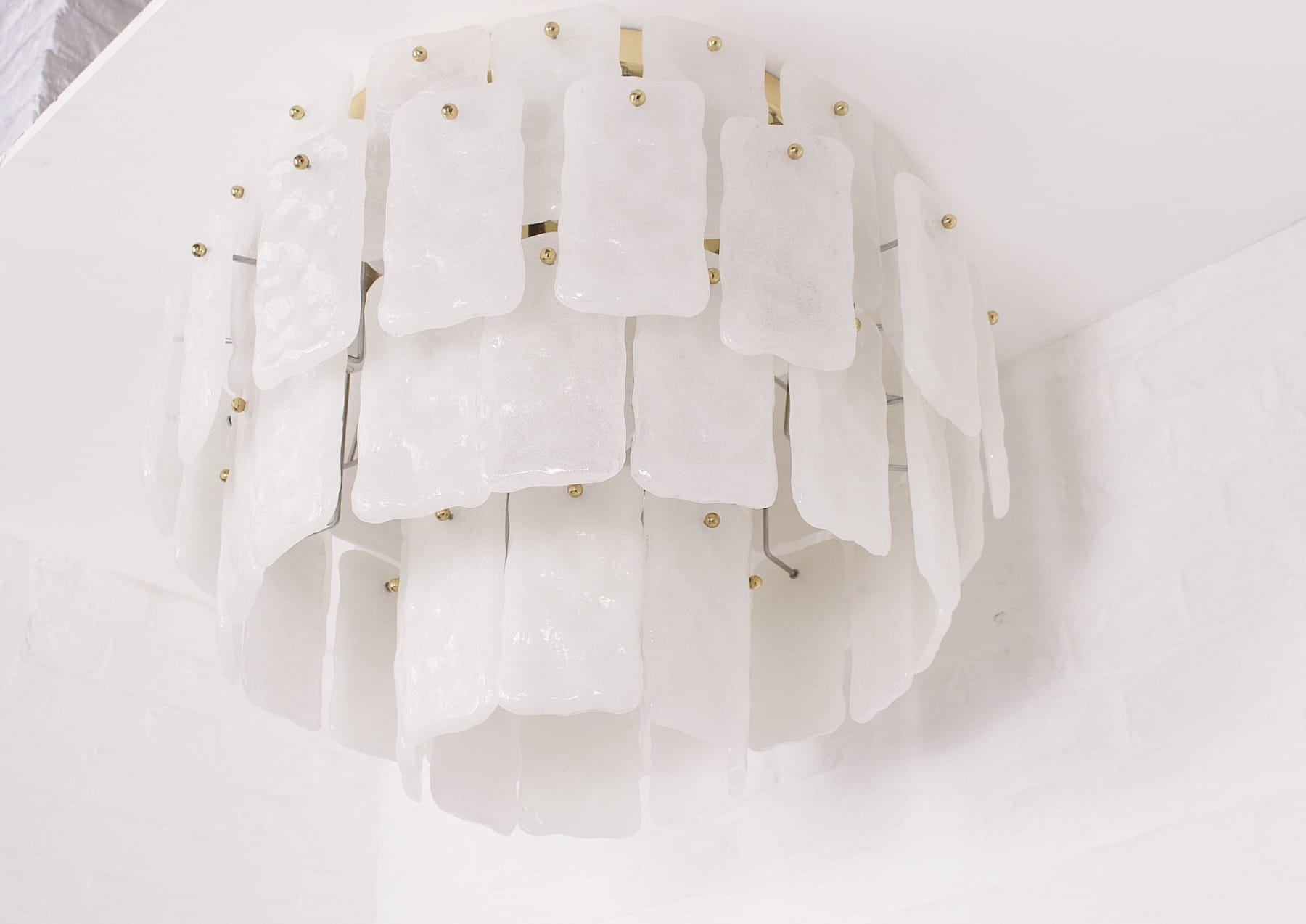 - Grote plafondlamp in messing en Murano glas, versierd met 64 doorschijnende witte glazen panelen op 3 niveaus, verlicht door 13 lampjes (E27).