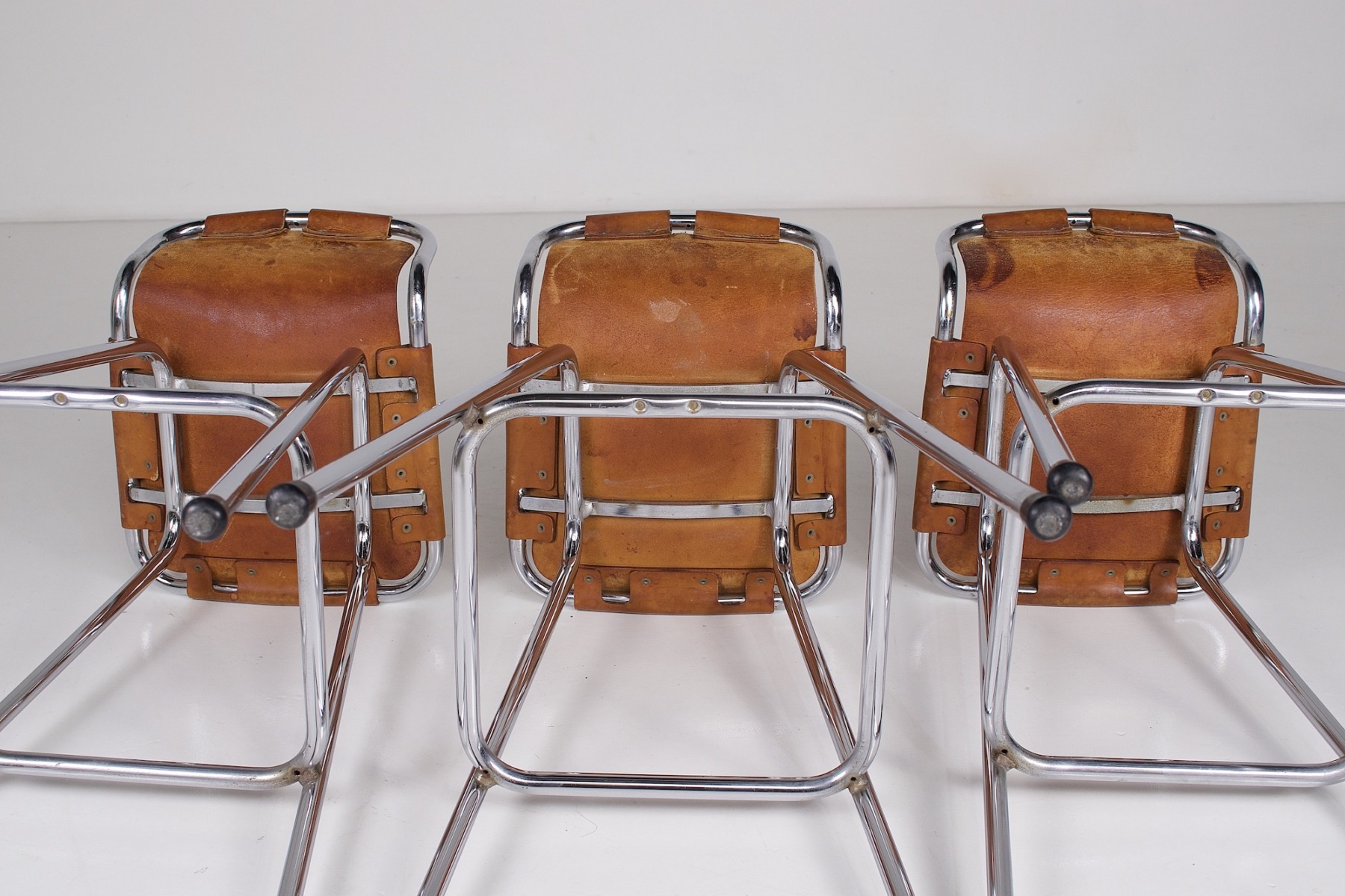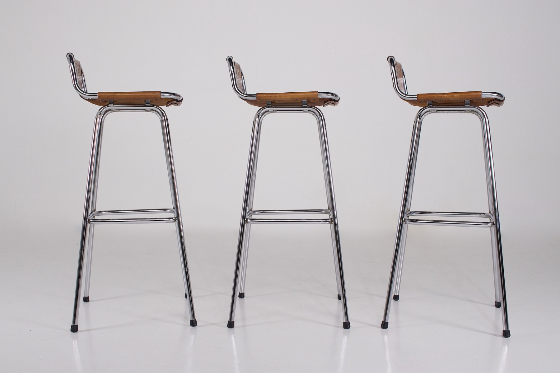 - Set van drie barkrukken met lage rugleuning, geklonken cognac leer op verchroomd buisframe, circa 1970