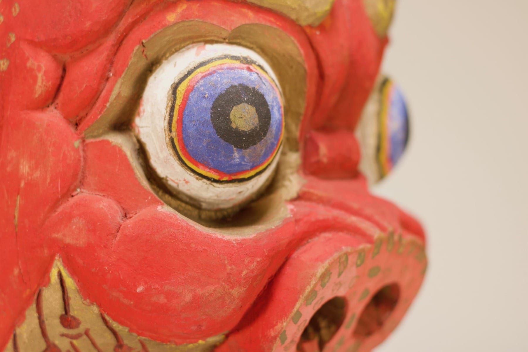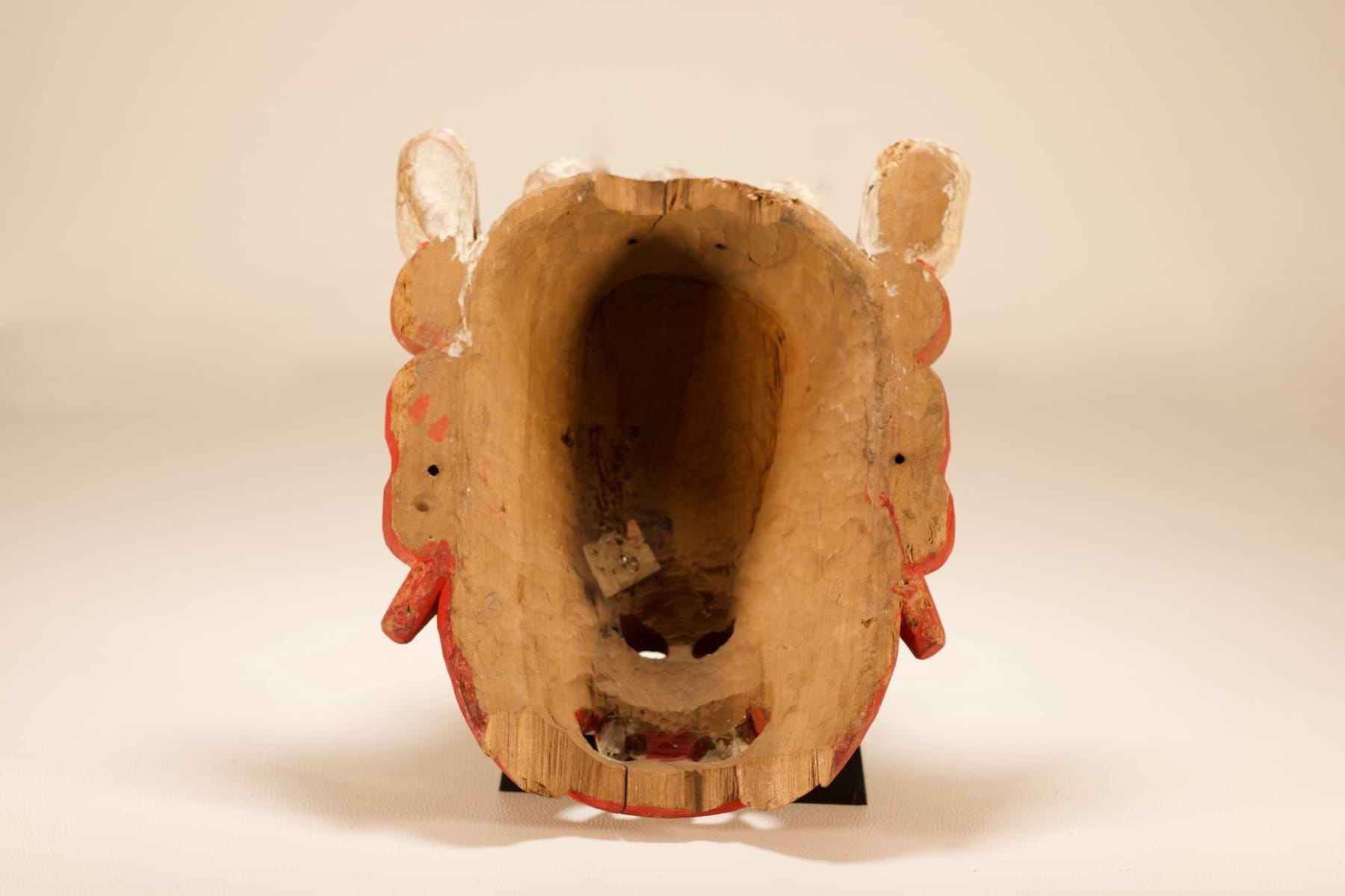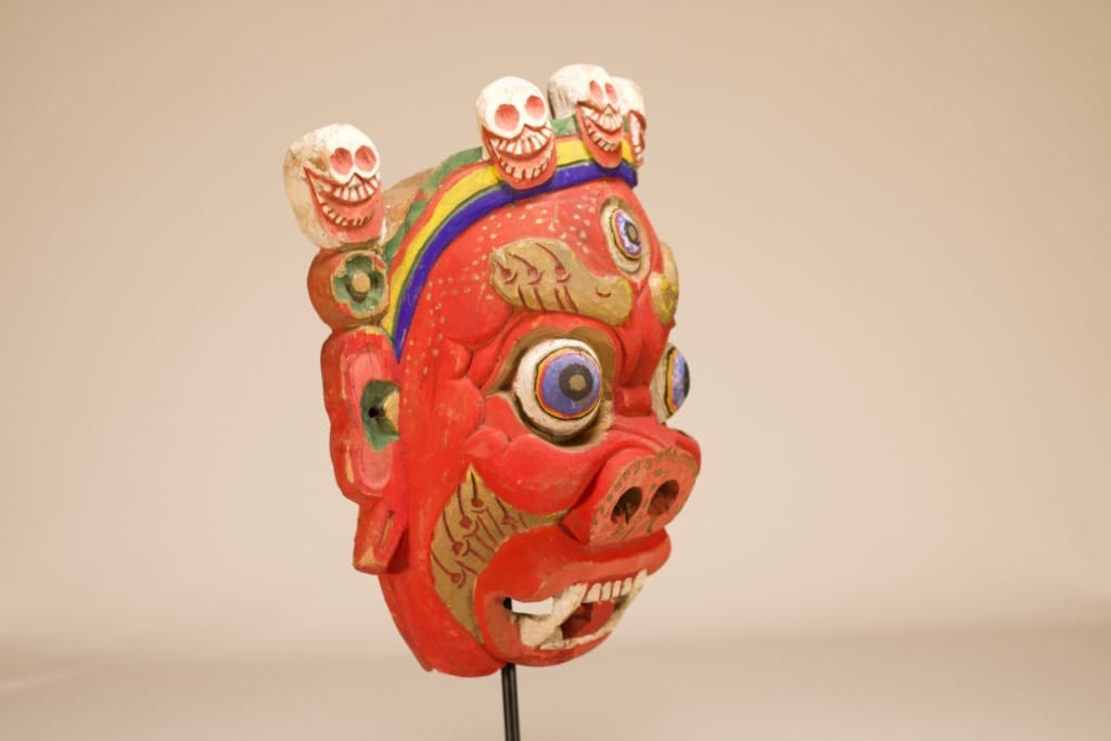 - Een houten masker met toornige trekken, de rode kleur en de vijf schedels (de 5 kwalen, de oorzaken van lijden) die de diadeem sieren, stellen Mahakala voor, een van de grootste beschermgoden van beoefenaars en leringen (Dharmapala) in het esoterisch boeddhisme (Vajrayāna).