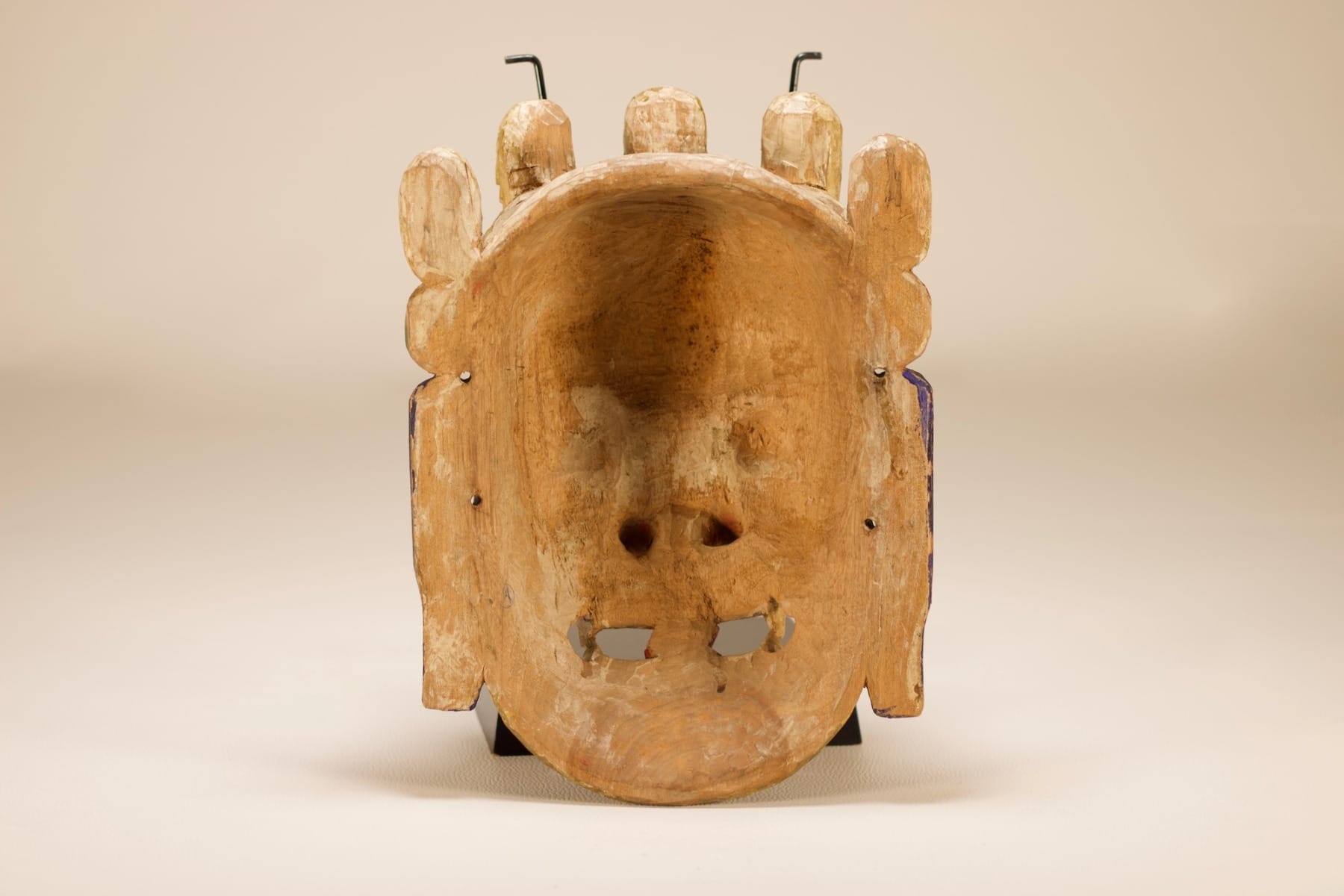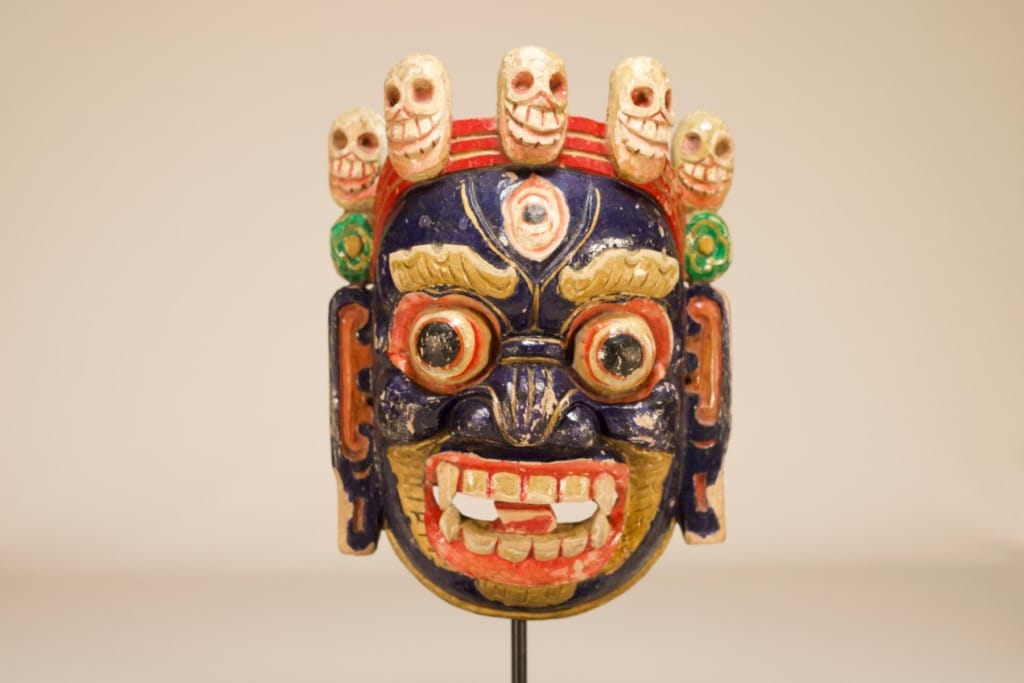 - Een houten masker met toornige trekken, de blauwe kleur en de vijf schedels (de 5 kwalen, de oorzaken van lijden) die de diadeem sieren, stellen Mahakala voor, een van de grootste beschermgoden van beoefenaars en leringen (Dharmapala) in het esoterisch boeddhisme (Vajrayāna).
