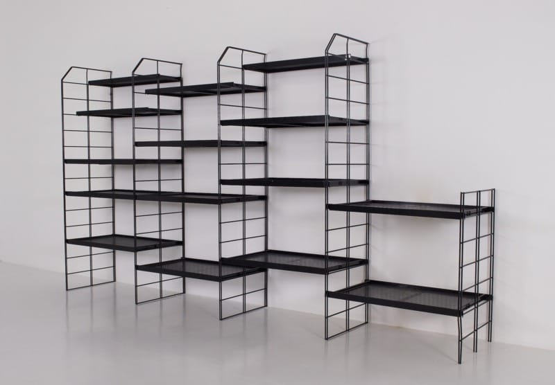 - Toegekend aan Tjerk Reijenga voor Pilastro, modulaire wandplank van zwart gelakt staal, circa 1980.