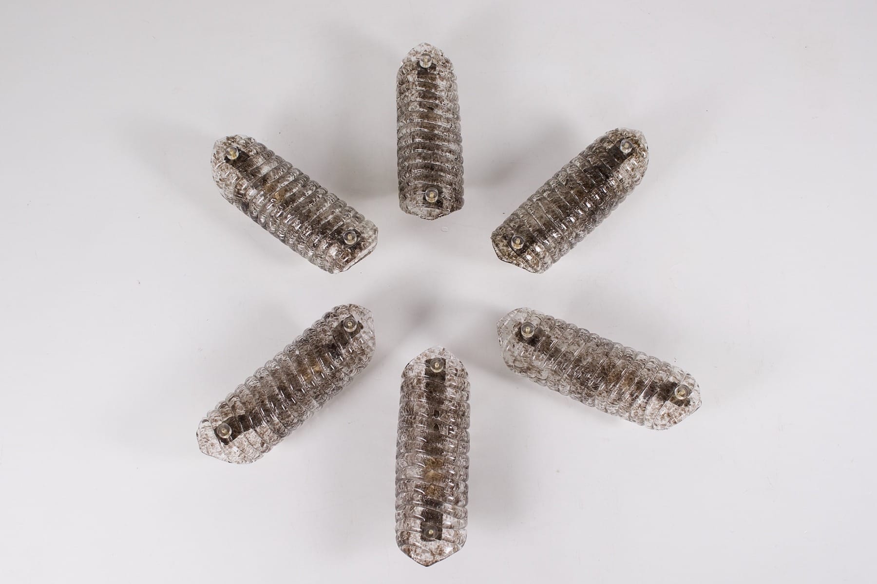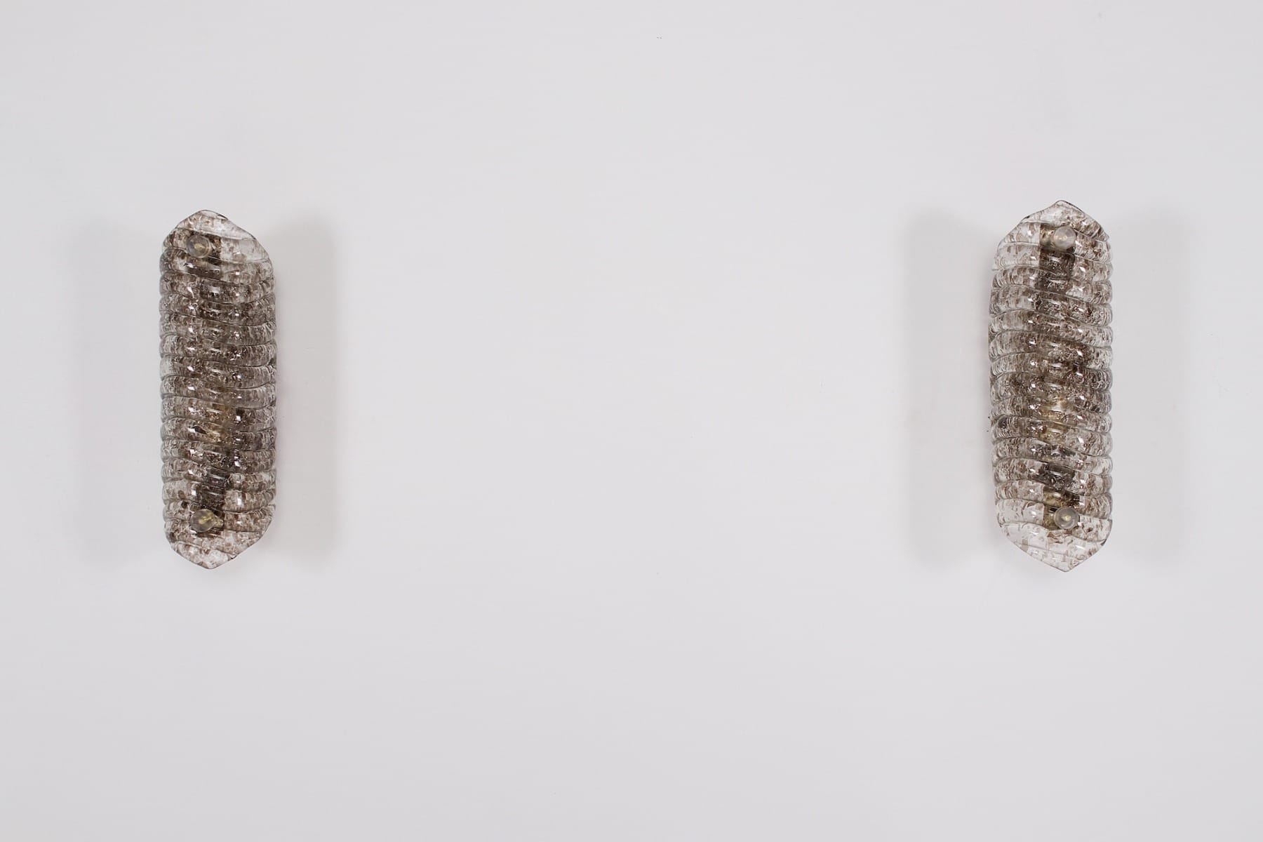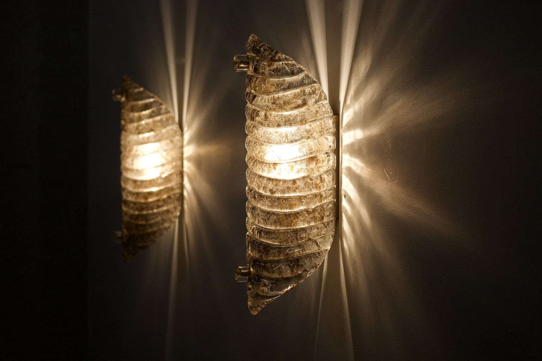 - Een paar wandlampen van Murano-glas die een kegel vormen die taps toeloopt in strepen. Het licht amberkleurige glas is aan de binnenkant bekleed met kristallen om de schittering te accentueren.