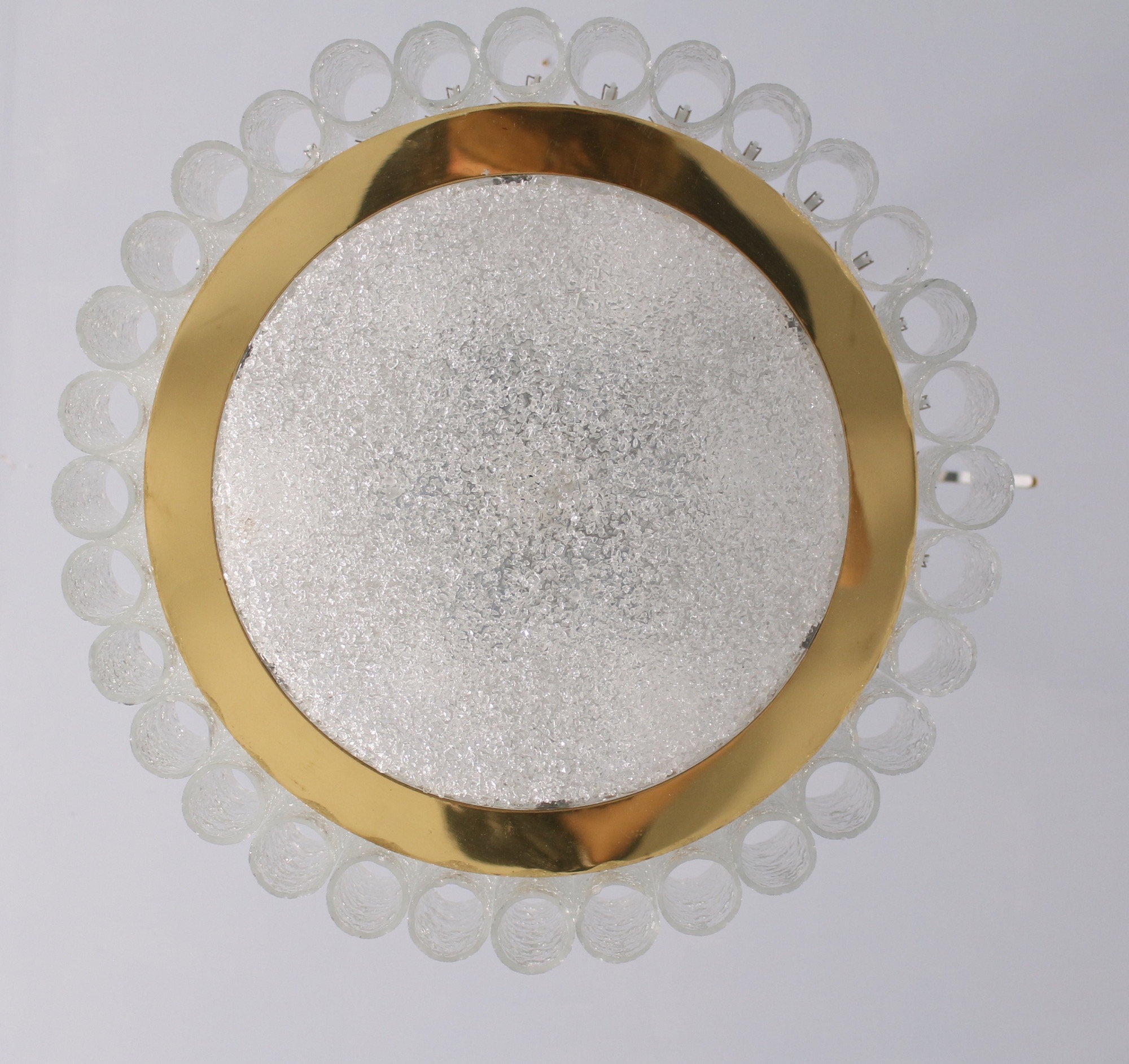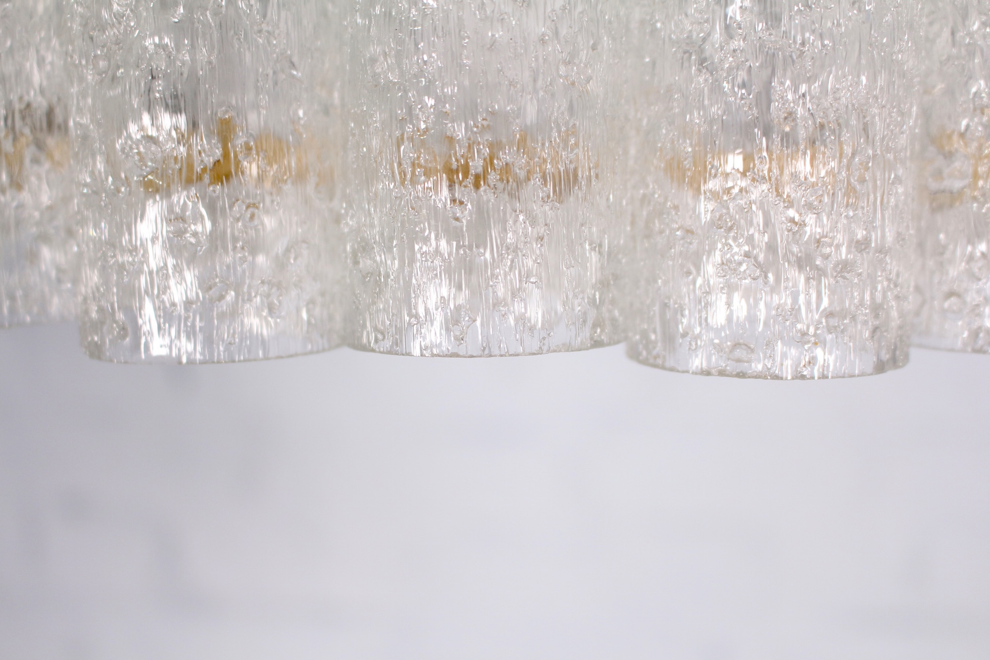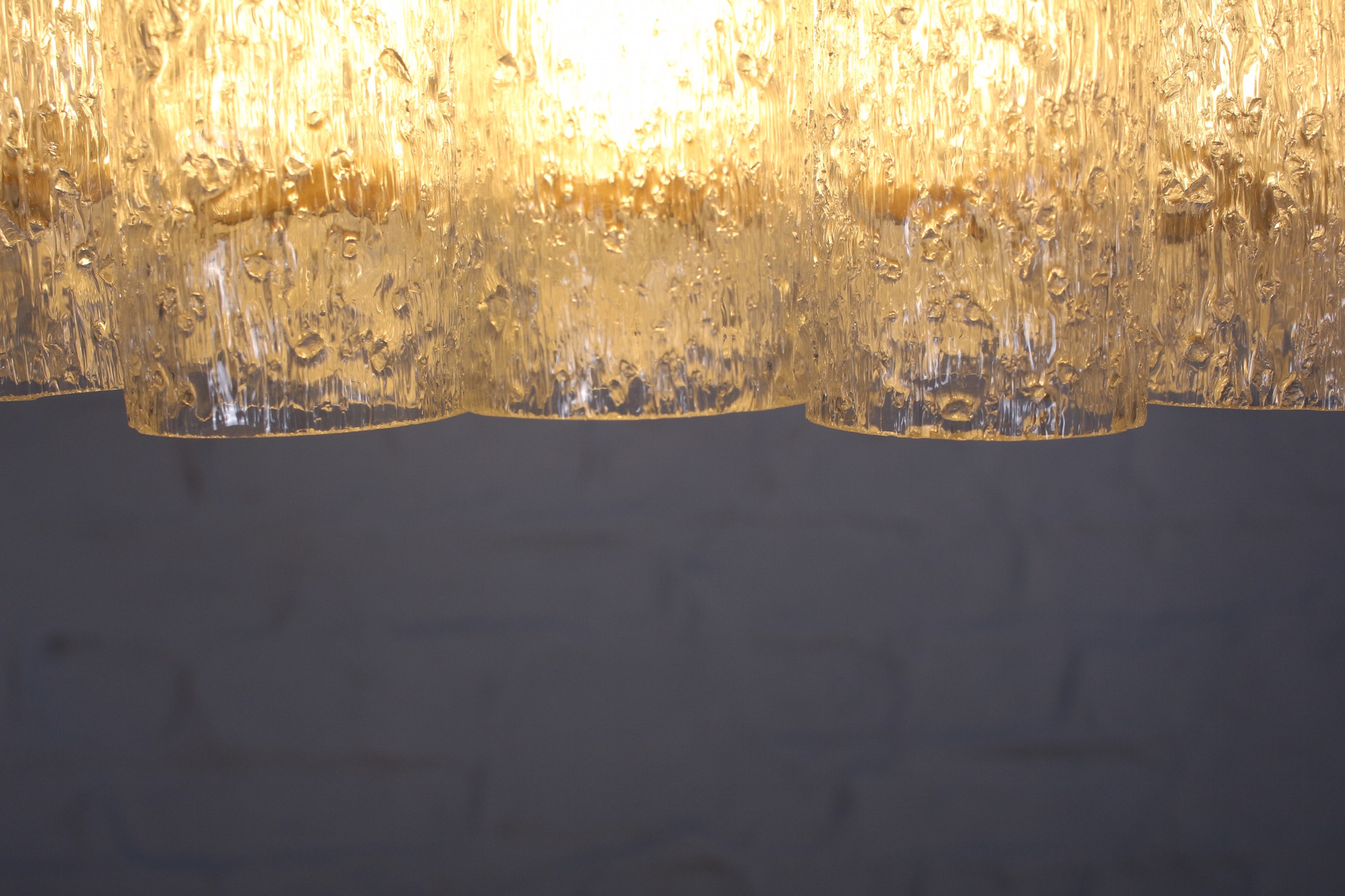• Messing en buisvormige geblazen glazen plafondlamp / kroonluchter, matte textuur.