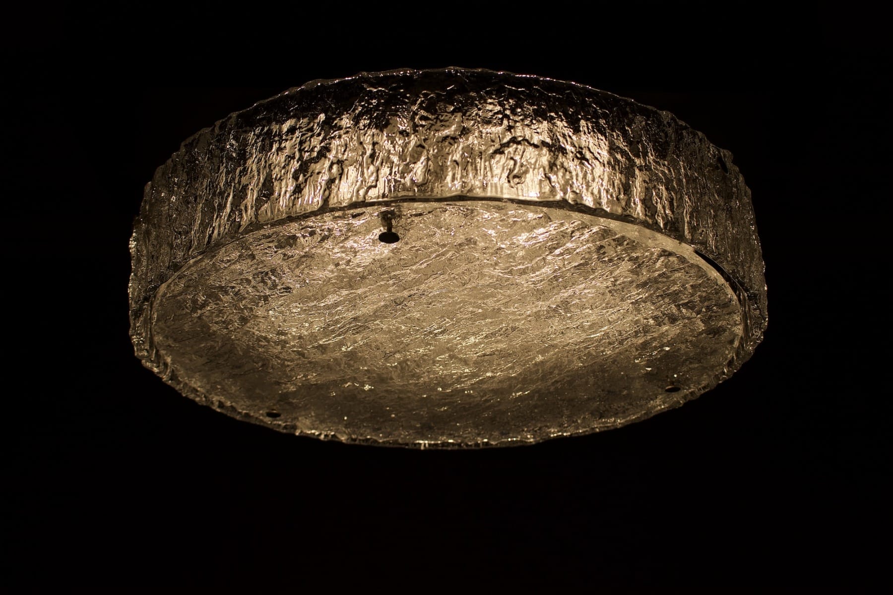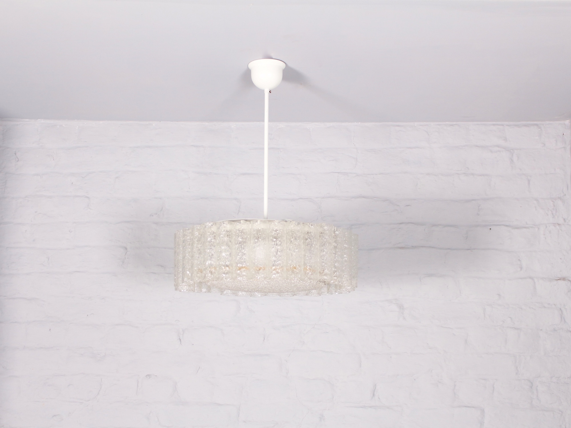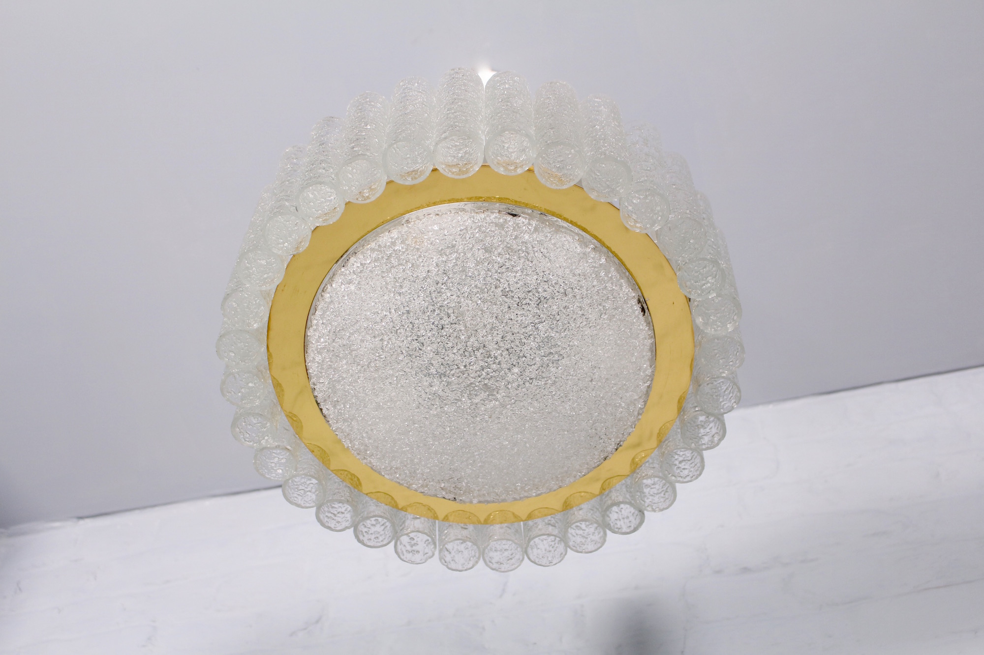 • Messing en buisvormige geblazen glazen plafondlamp / kroonluchter, matte textuur.