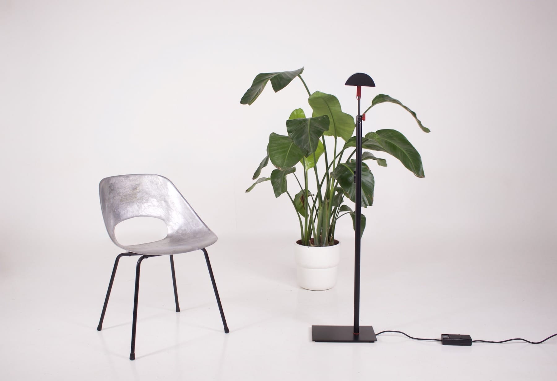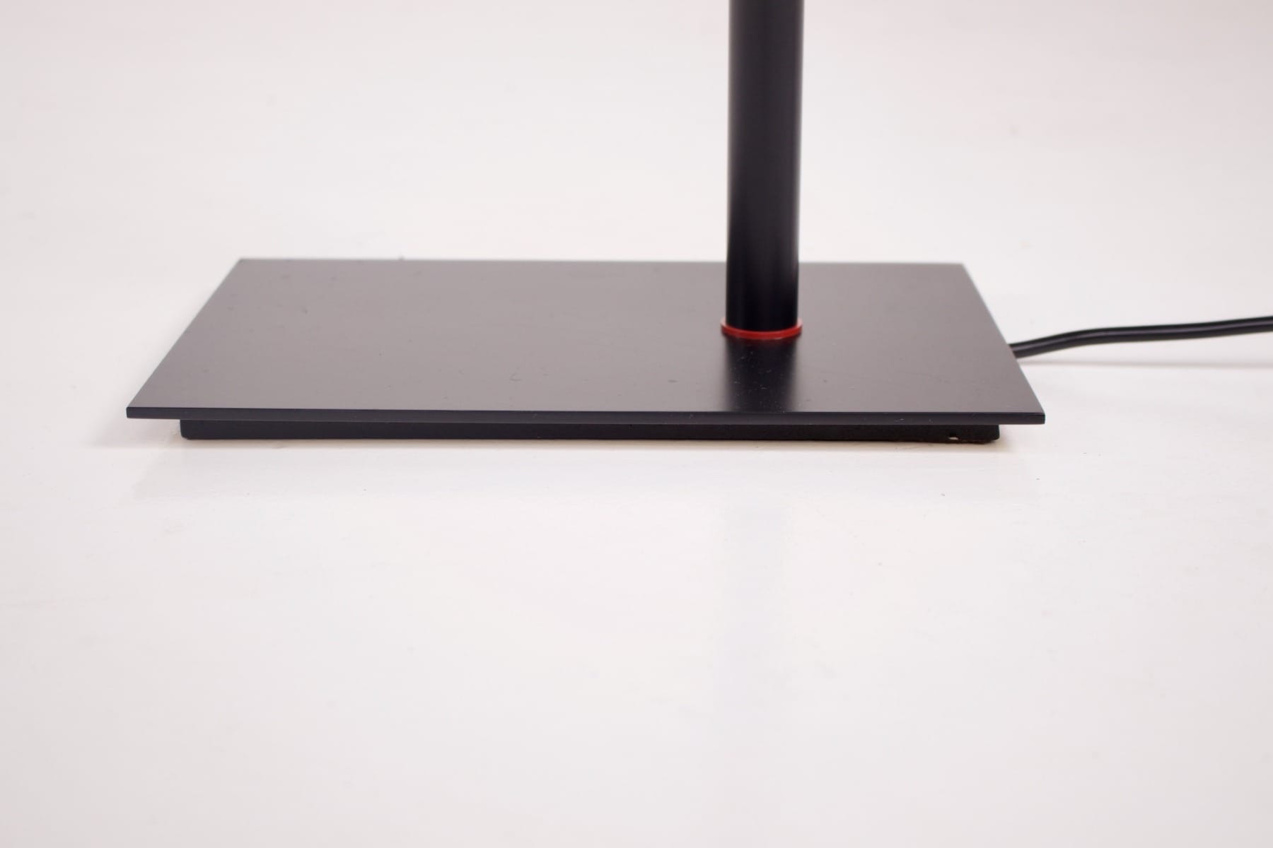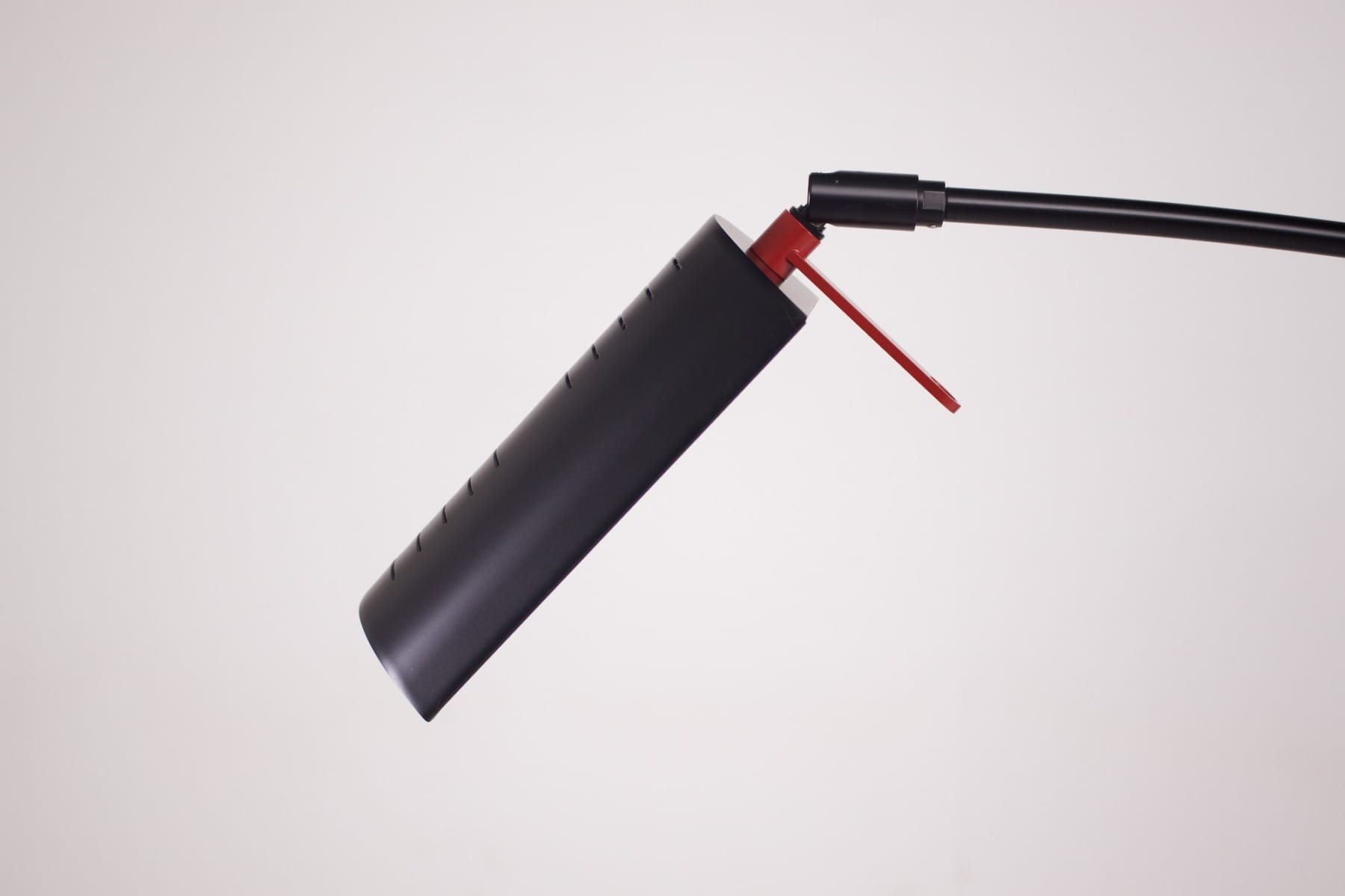 - Vloerlamp in zwart en rood gelakt staal, voorzien van een dimschakelaar. De pendelarm kan worden gekanteld en de reflector kan 360° worden gedraaid.