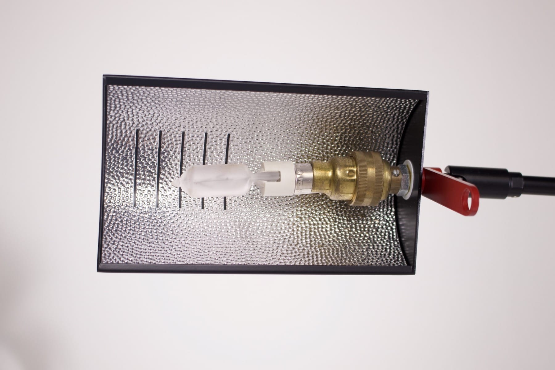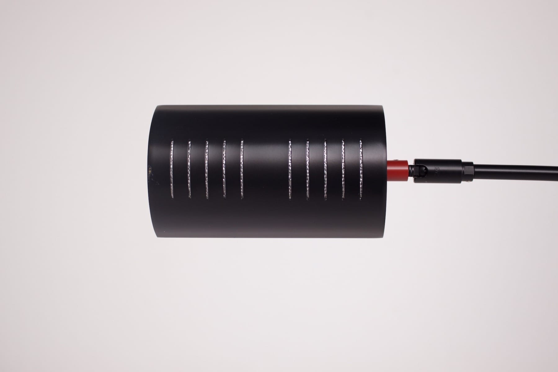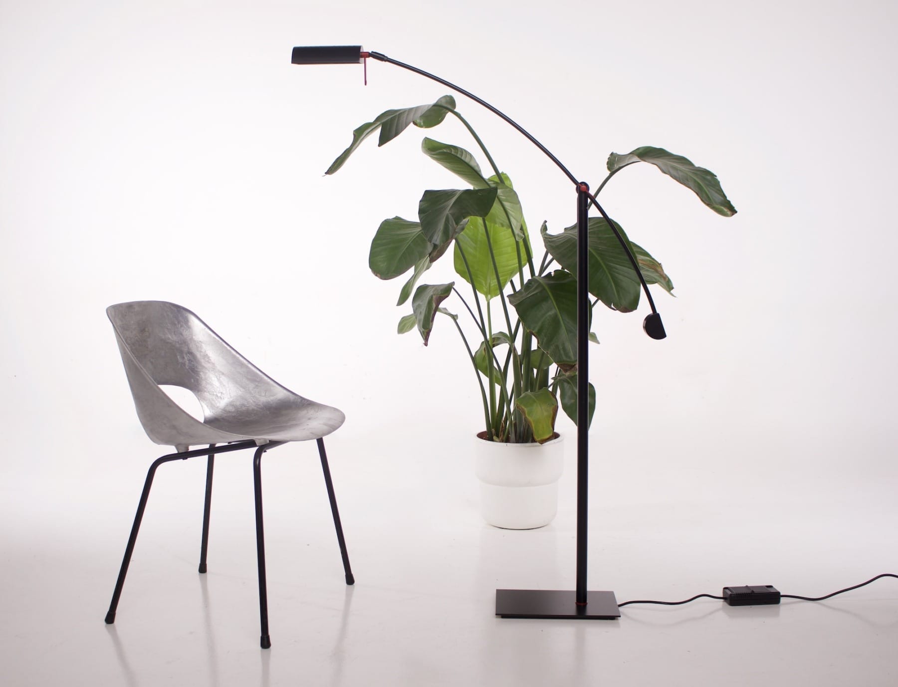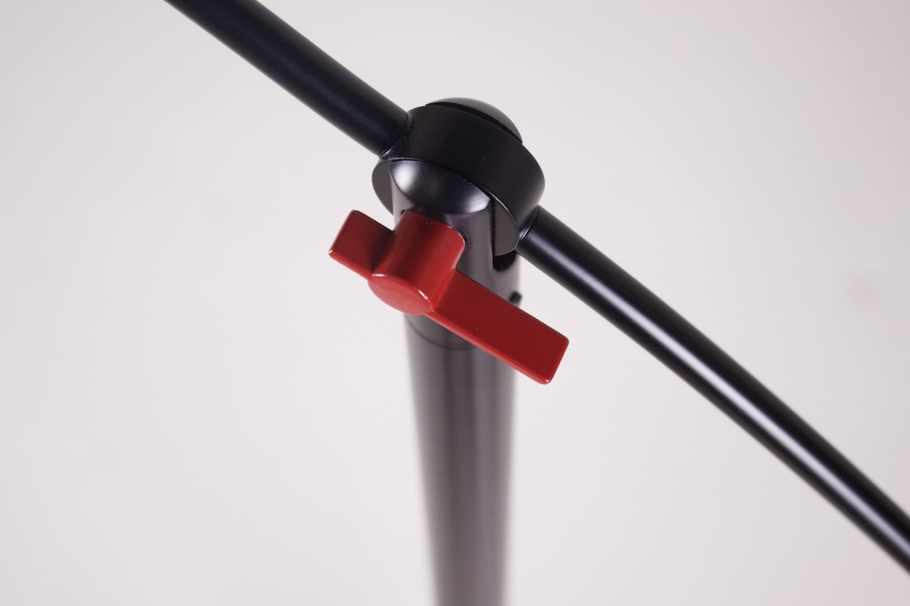 - Vloerlamp in zwart en rood gelakt staal, voorzien van een dimschakelaar. De pendelarm kan worden gekanteld en de reflector kan 360° worden gedraaid.