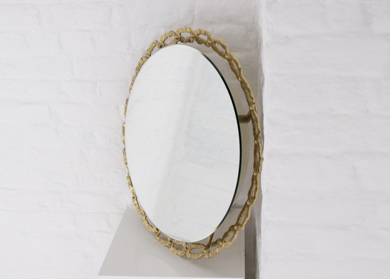 - Grote ronde spiegel met achtergrondverlichting omringd door een massief messing lusframe, editie 1970.
