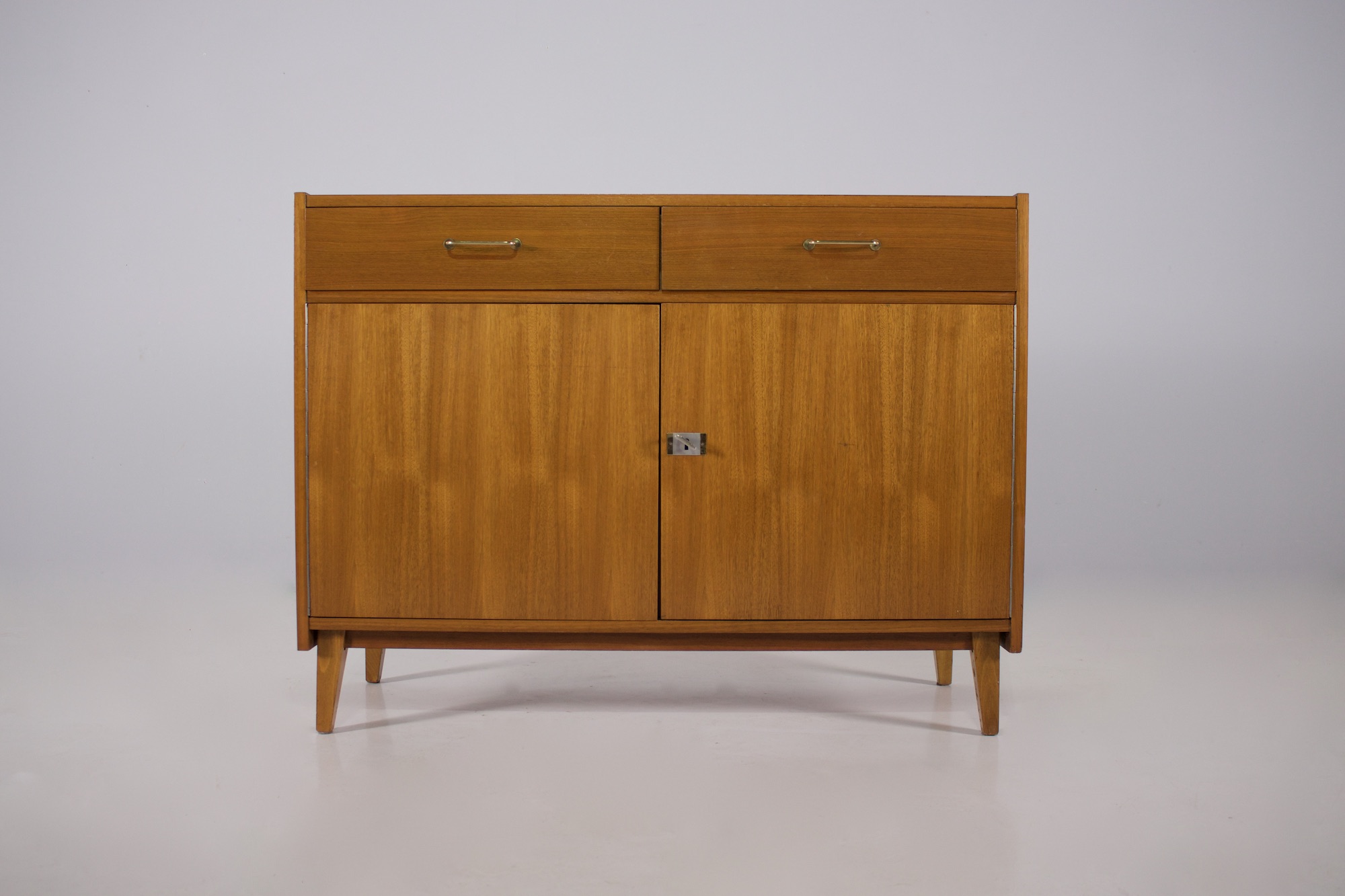 • Buffet moderniste en placage de noyer, les poignées en laiton, les fonds de tiroirs incurvés.