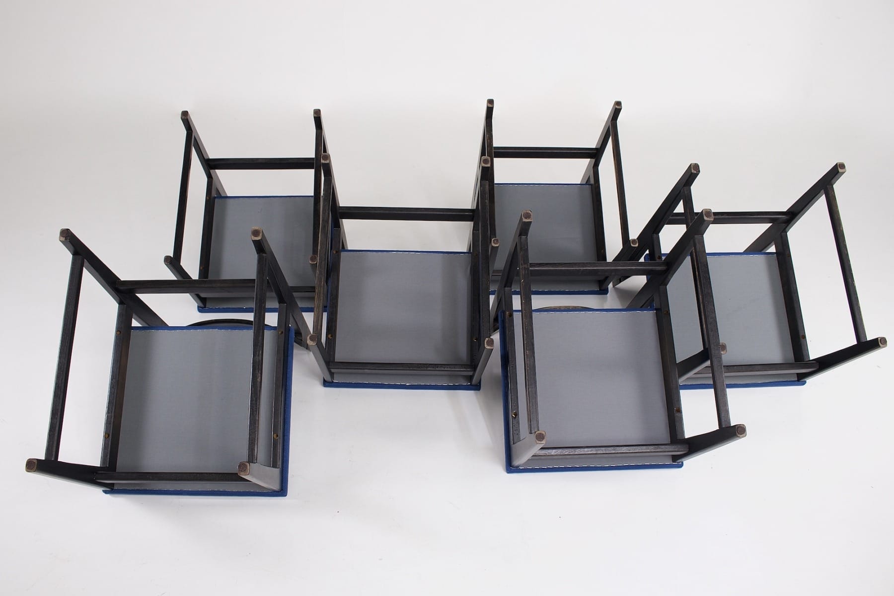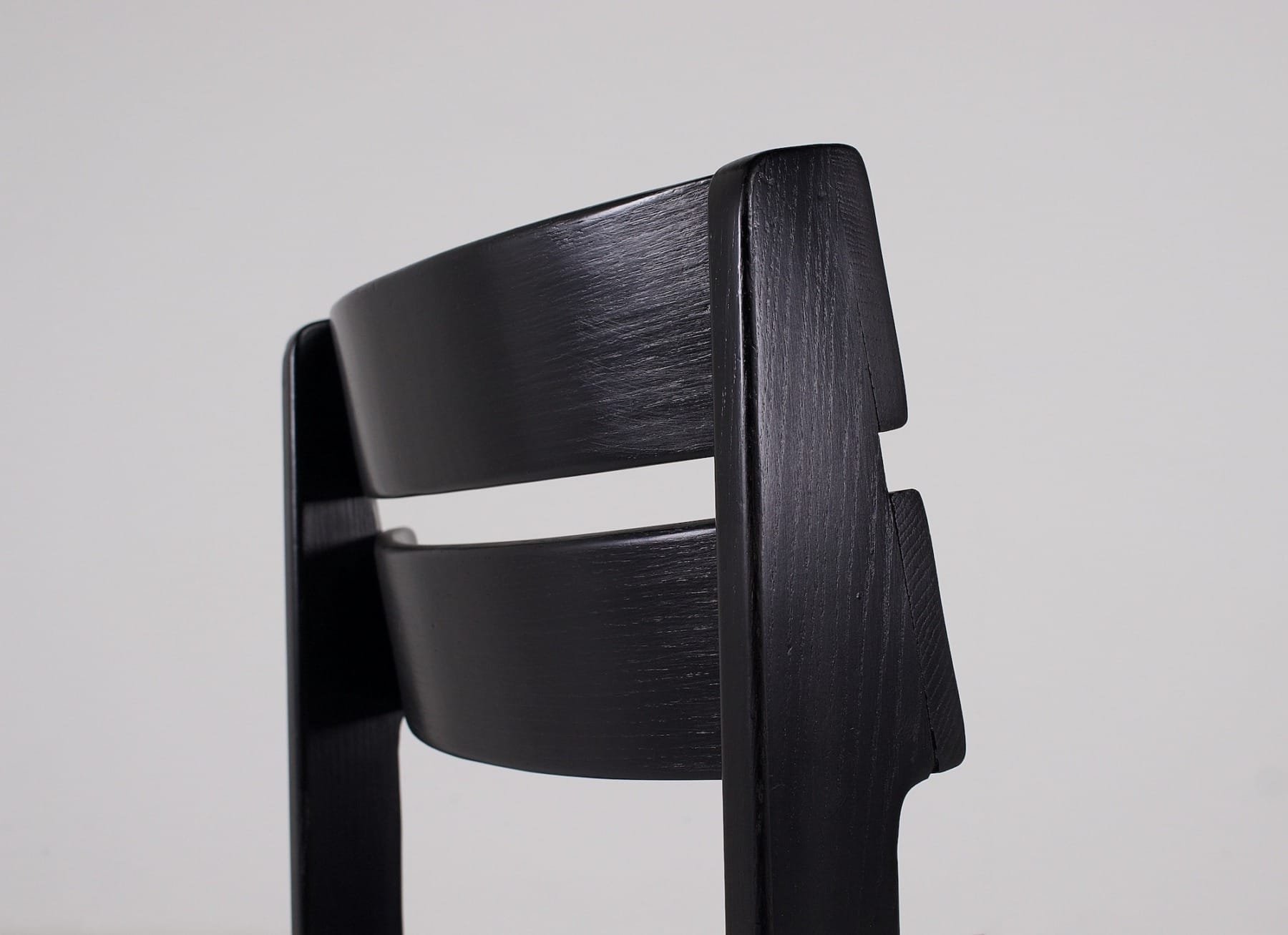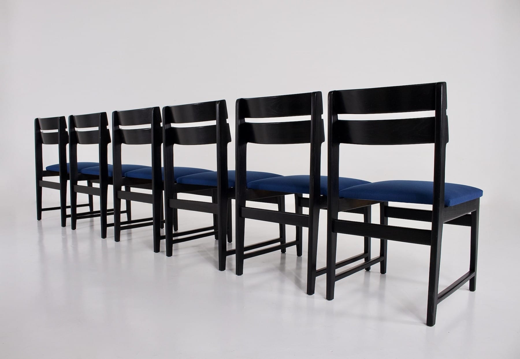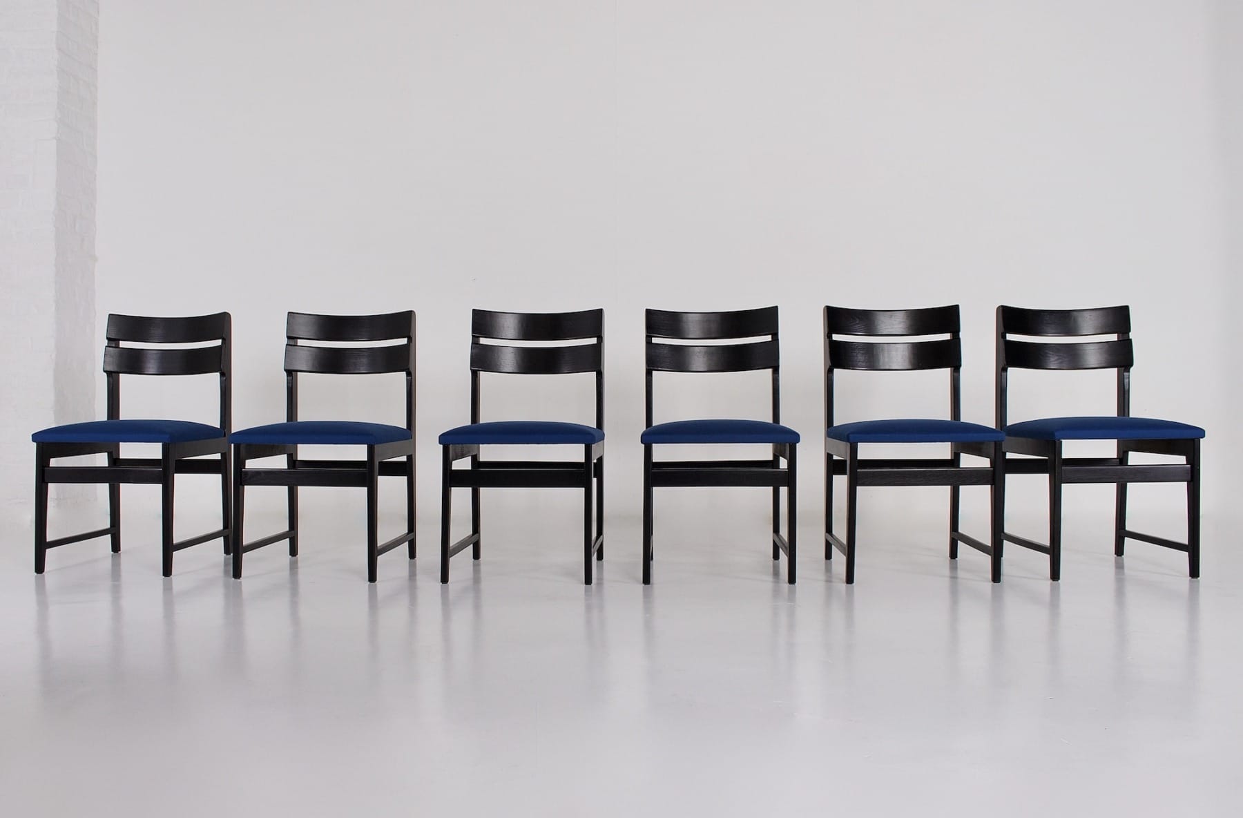 • Suite de 6 chaises brutalistes en chêne massif, laquées noir. Edition des années 1970 dans le goût de Jean Batenburg, Frans Dufour, de Coene,…