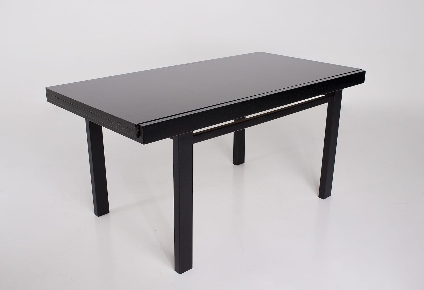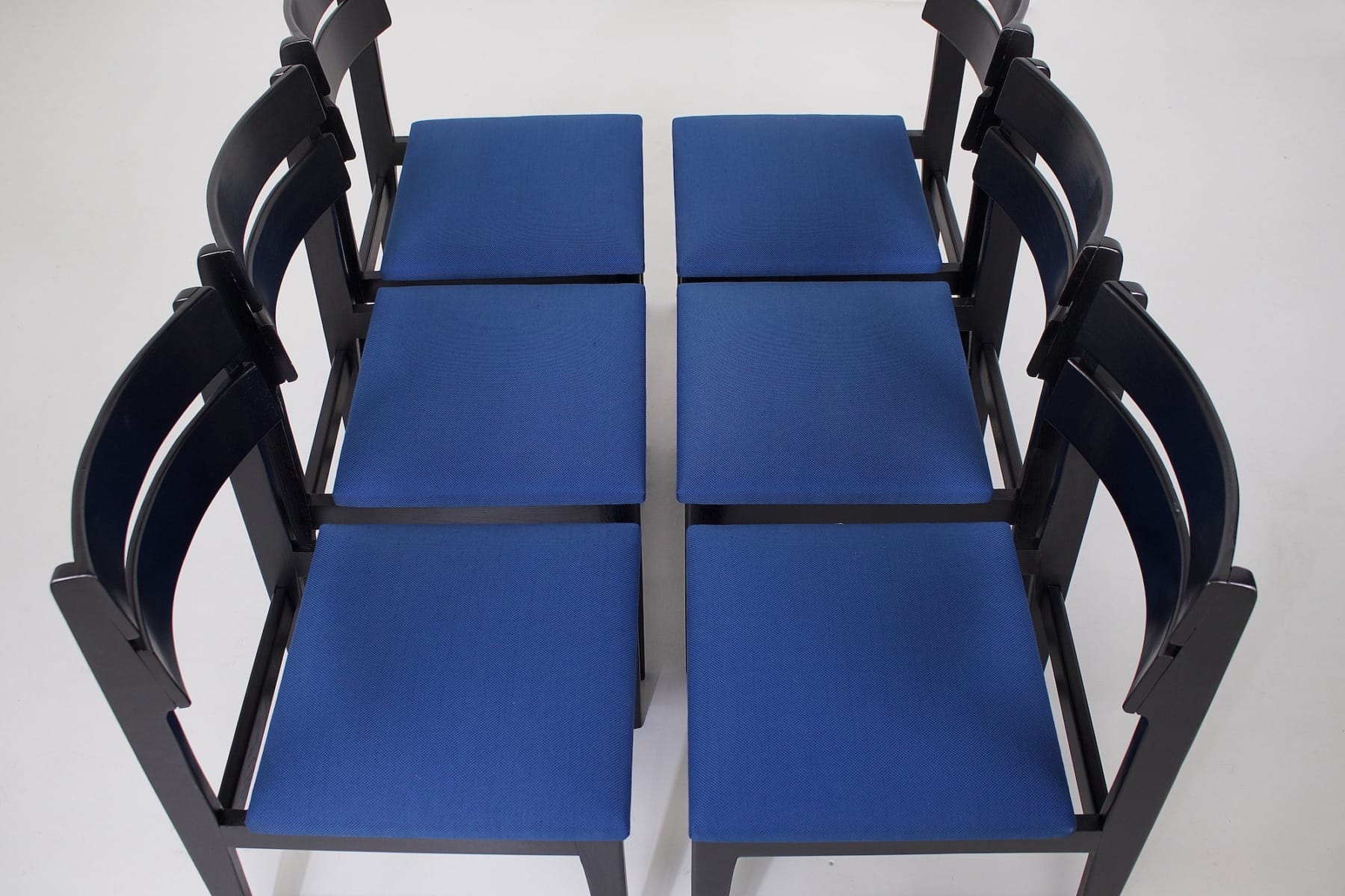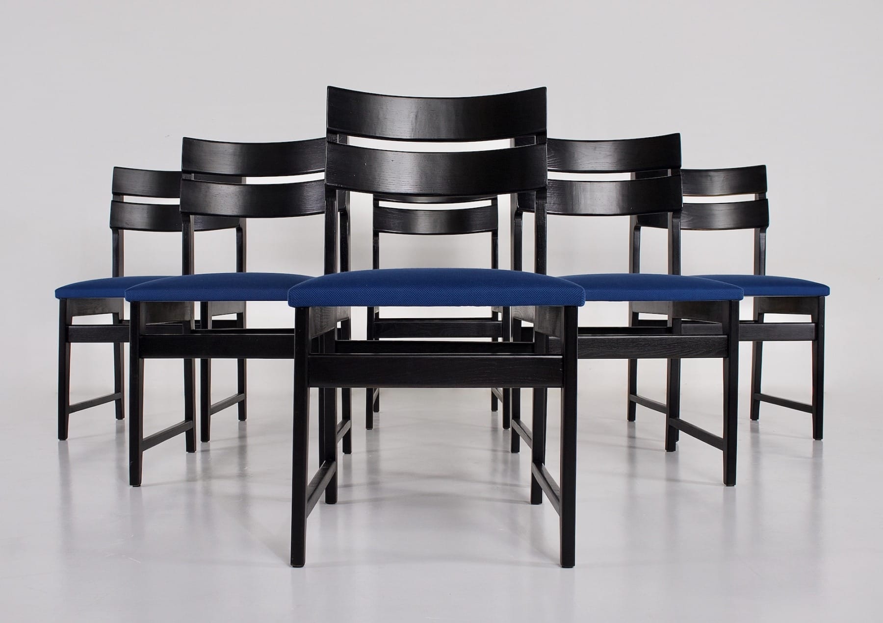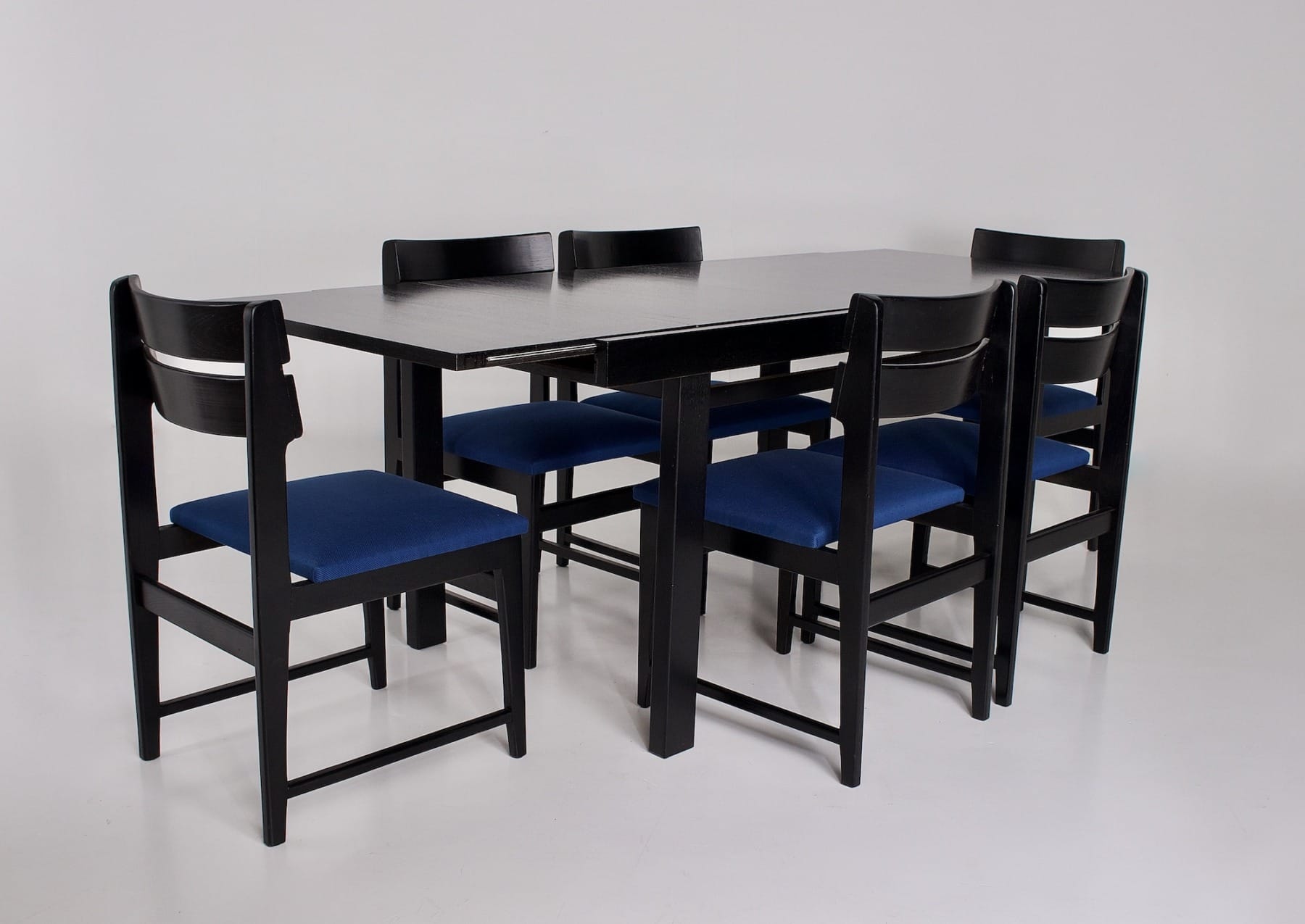 • Suite de 6 chaises brutalistes en chêne massif, laquées noir. Edition des années 1970 dans le goût de Jean Batenburg, Frans Dufour, de Coene,…