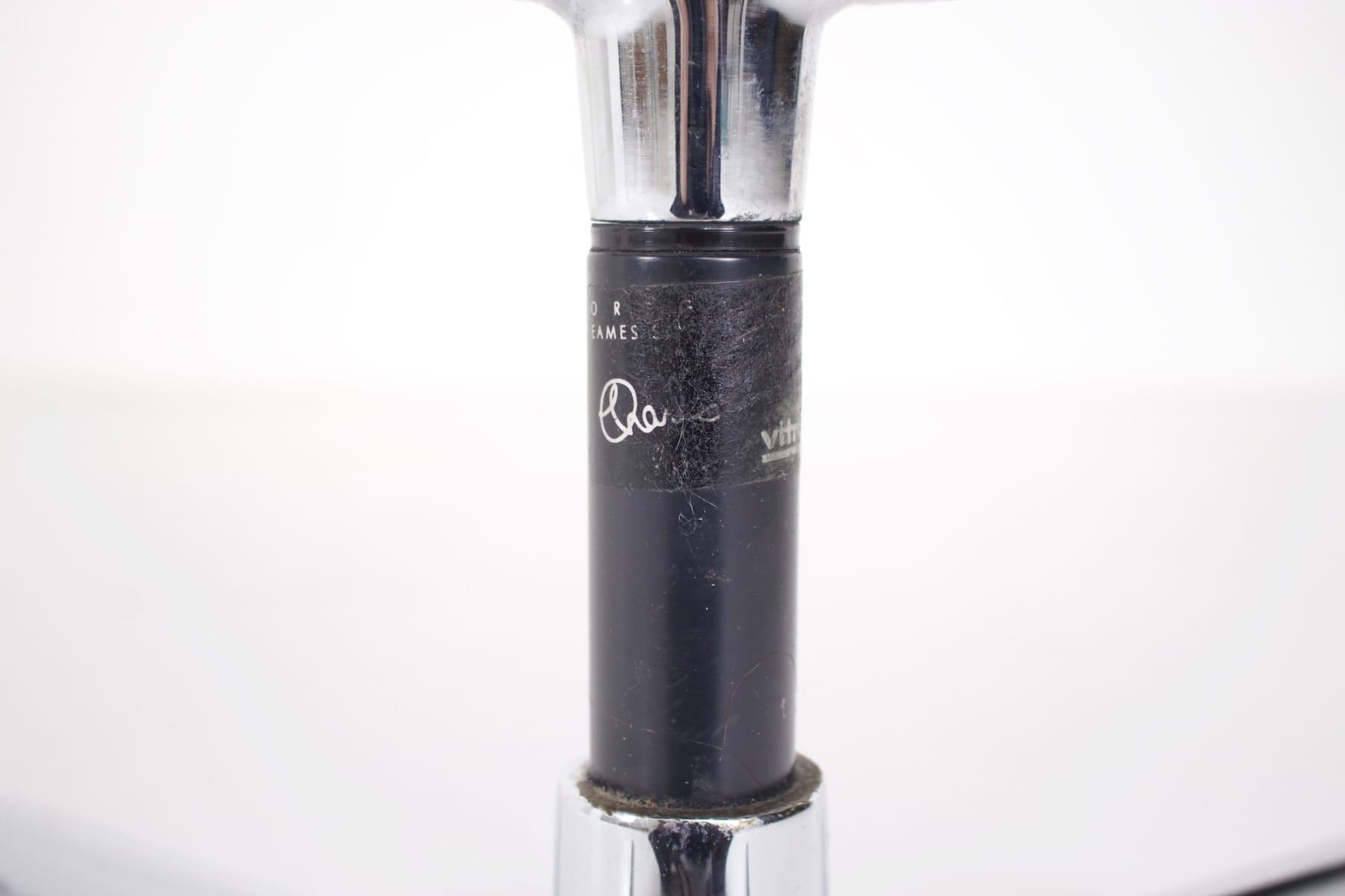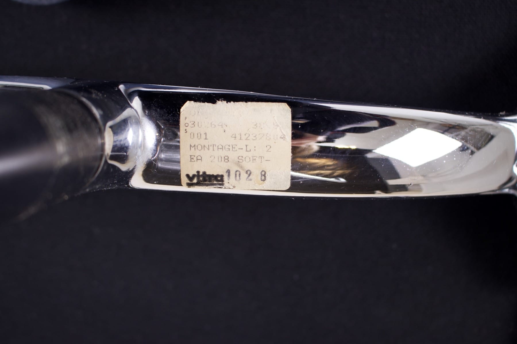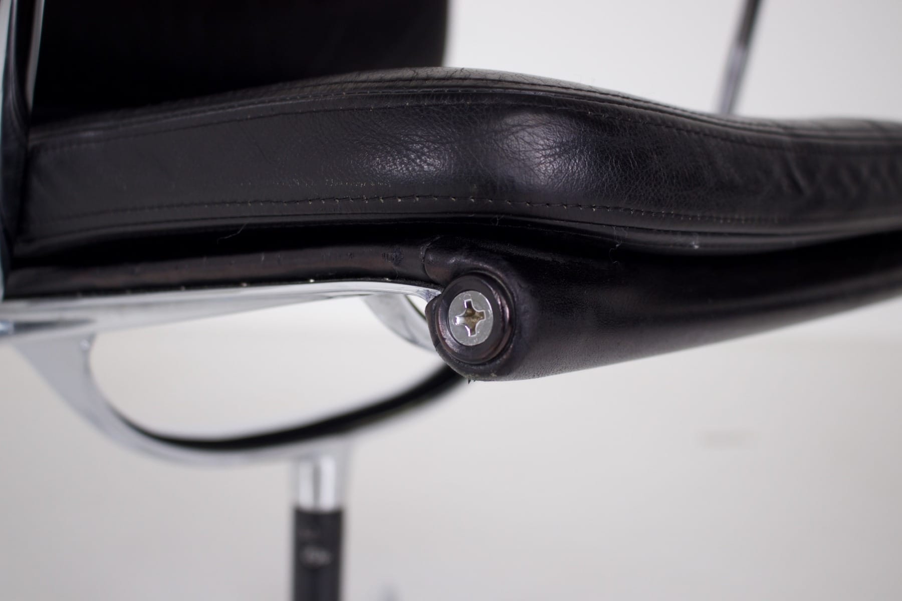 - Charles & Ray Eames pour Vitra éditeur, fauteuil iconique « Soft Pad » (EA 208), structure pivotante en aluminium poli, garnie de coussin en cuir noir.