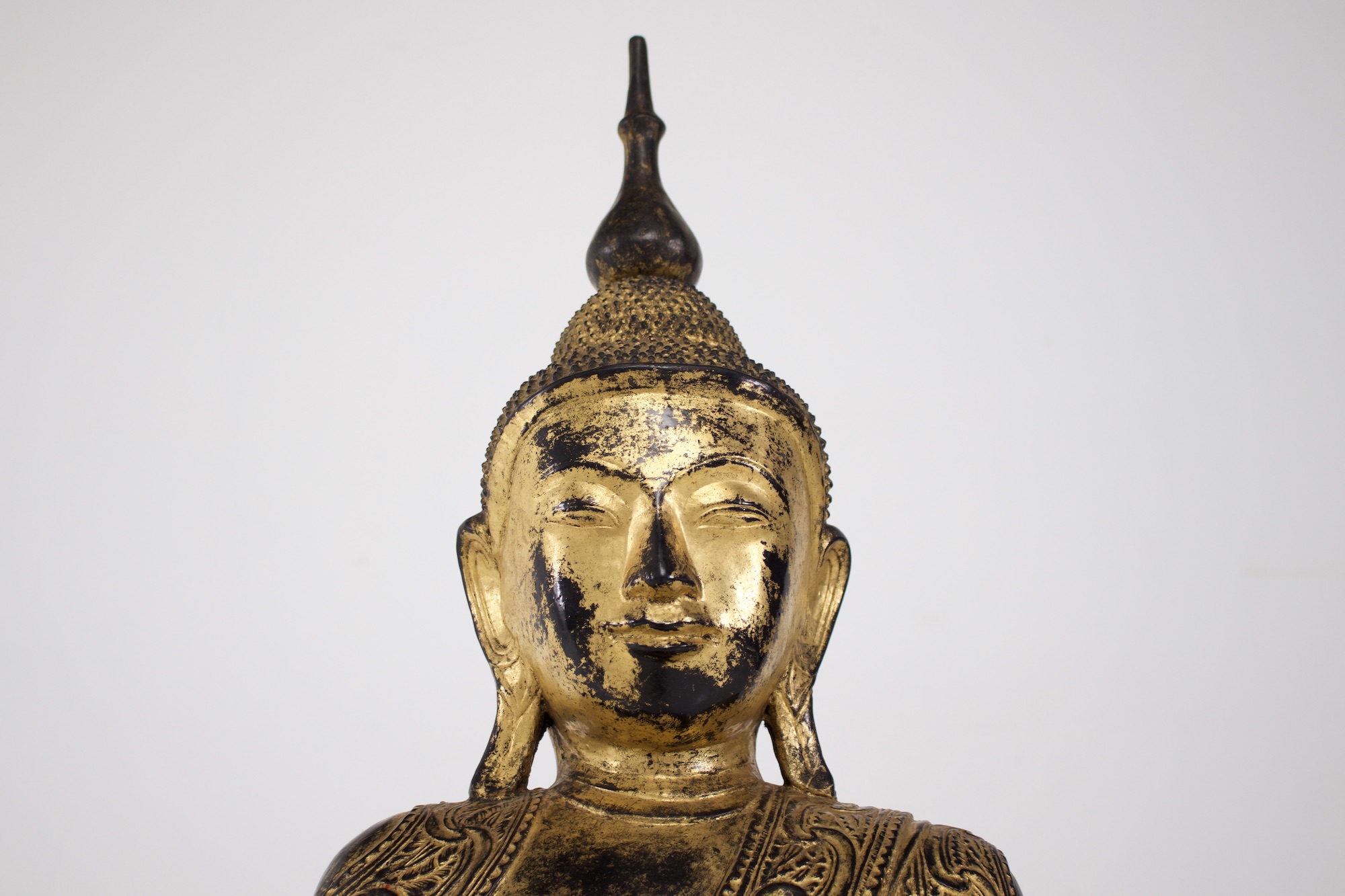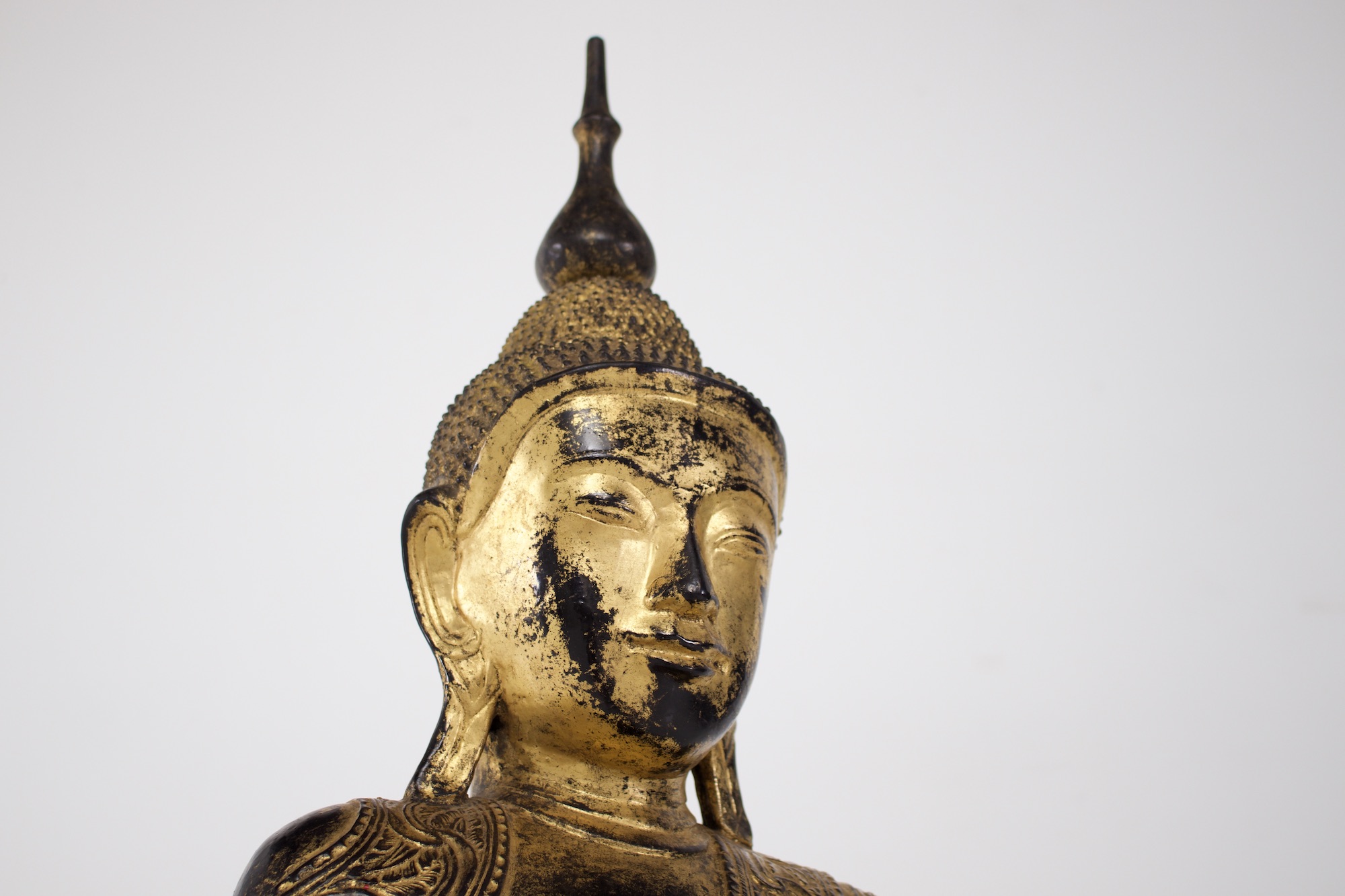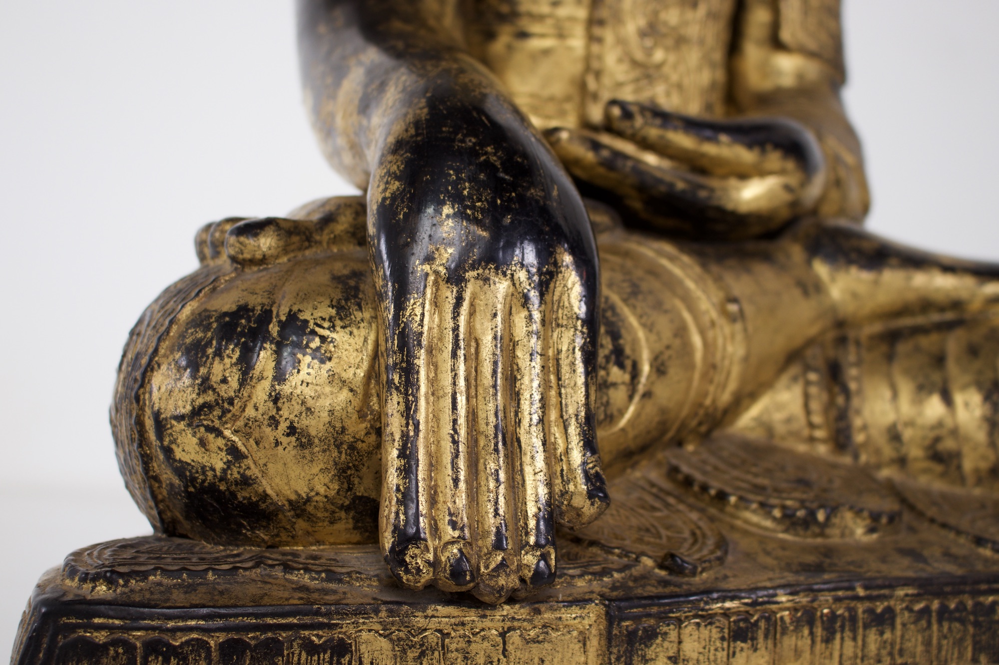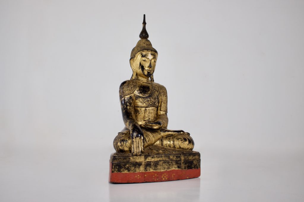 - Probablement la forme la plus caractéristique de sculpture bouddhique en Birmanie et du bouddhisme de l’Ecole des Anciens (Theravada), le Bouddha historique Shakyamuni est représenté en position de la prise de la terre à témoin. Une très belle image de l’Eveillé, fort bien conservée puisqu’elle est en « papier mâché », bois et laque sèche.