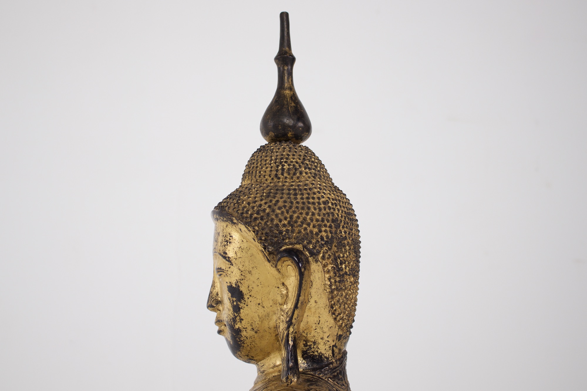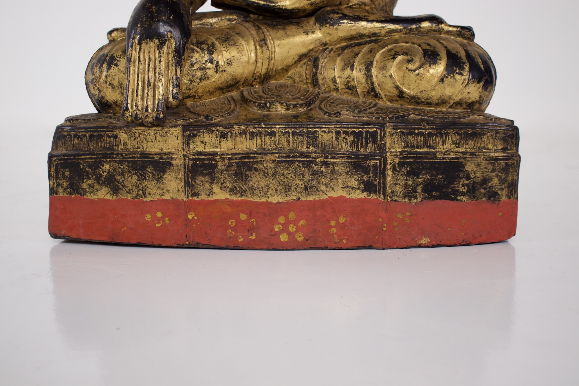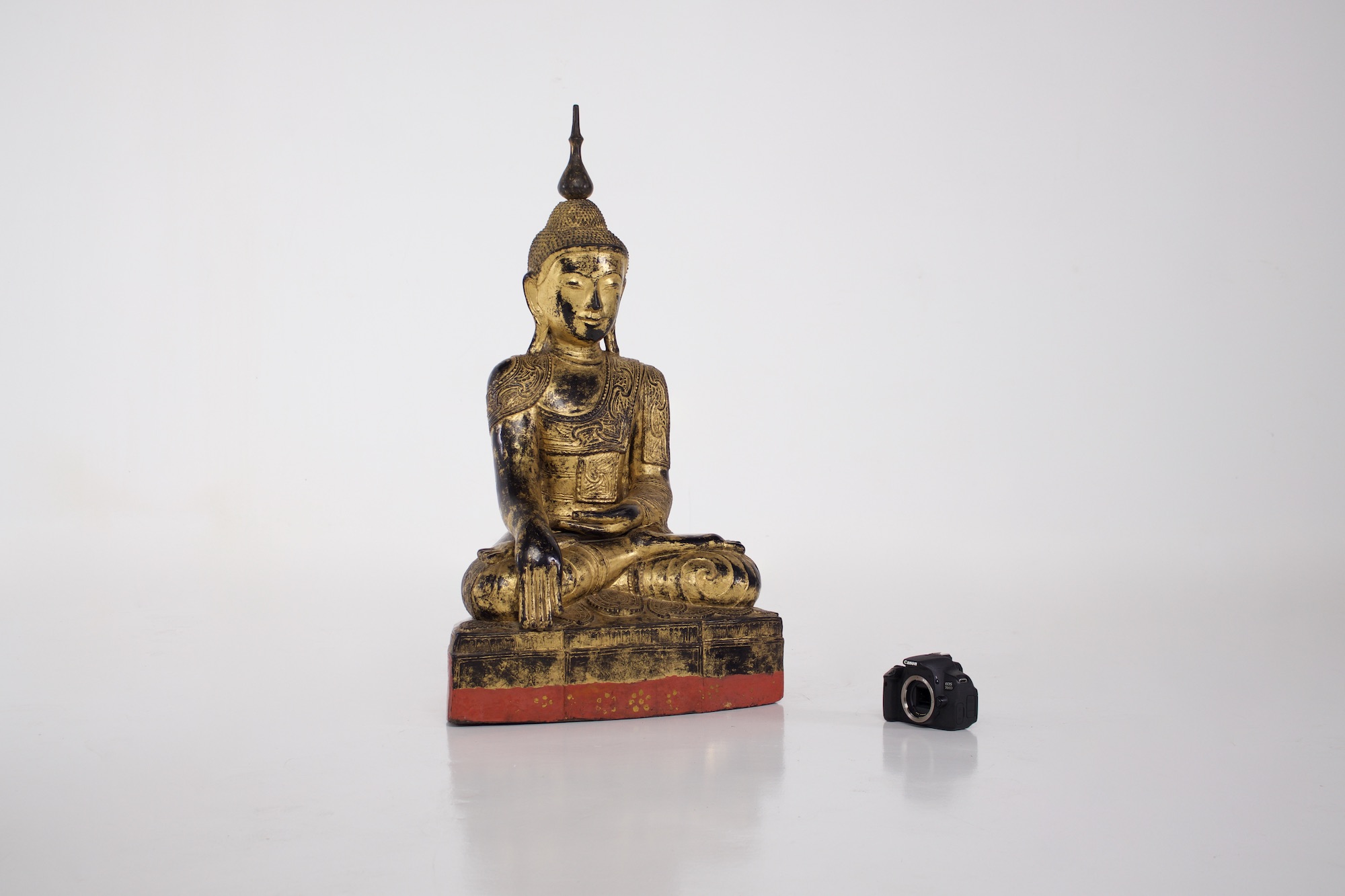 - Probablement la forme la plus caractéristique de sculpture bouddhique en Birmanie et du bouddhisme de l’Ecole des Anciens (Theravada), le Bouddha historique Shakyamuni est représenté en position de la prise de la terre à témoin. Une très belle image de l’Eveillé, fort bien conservée puisqu’elle est en « papier mâché », bois et laque sèche.