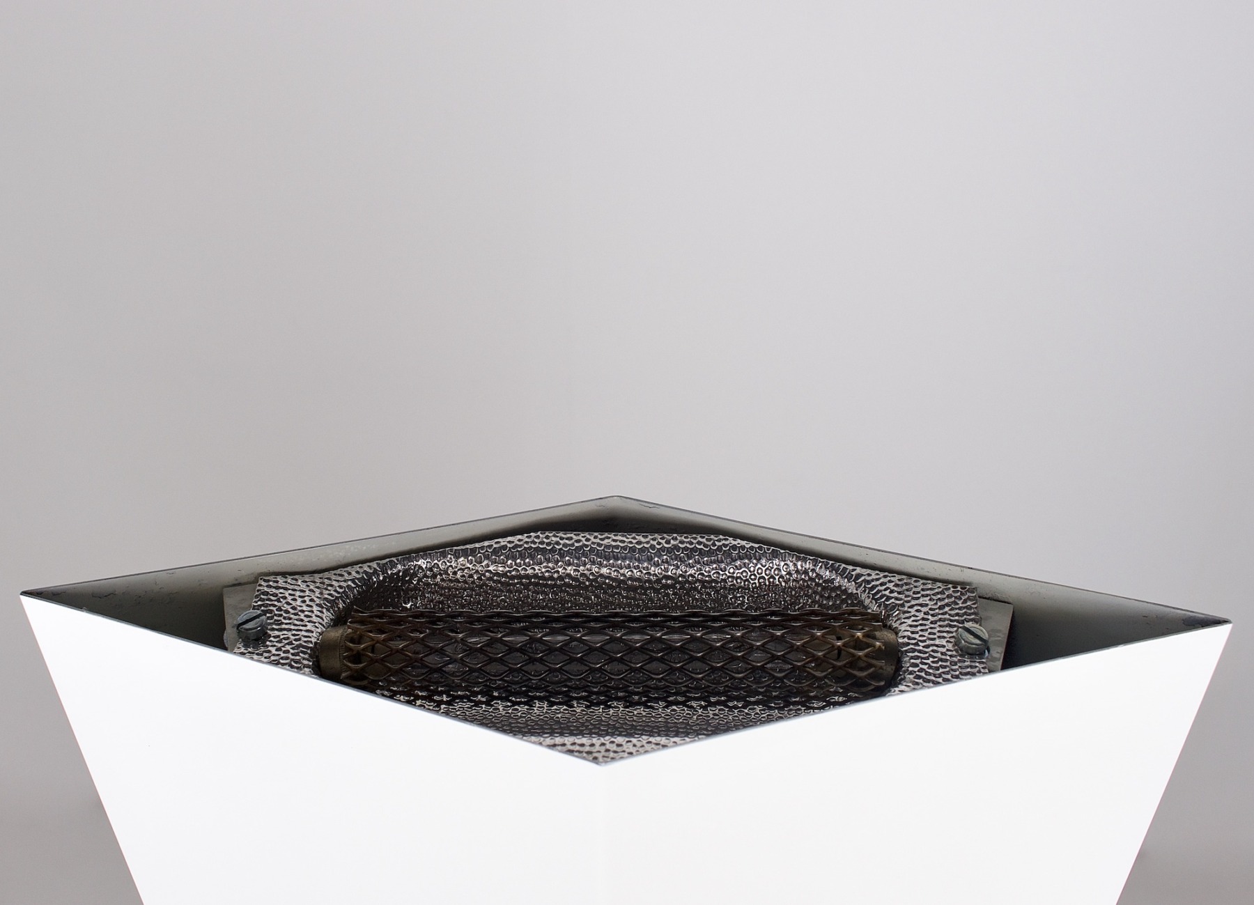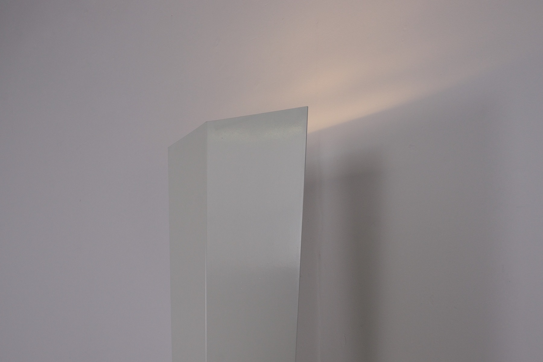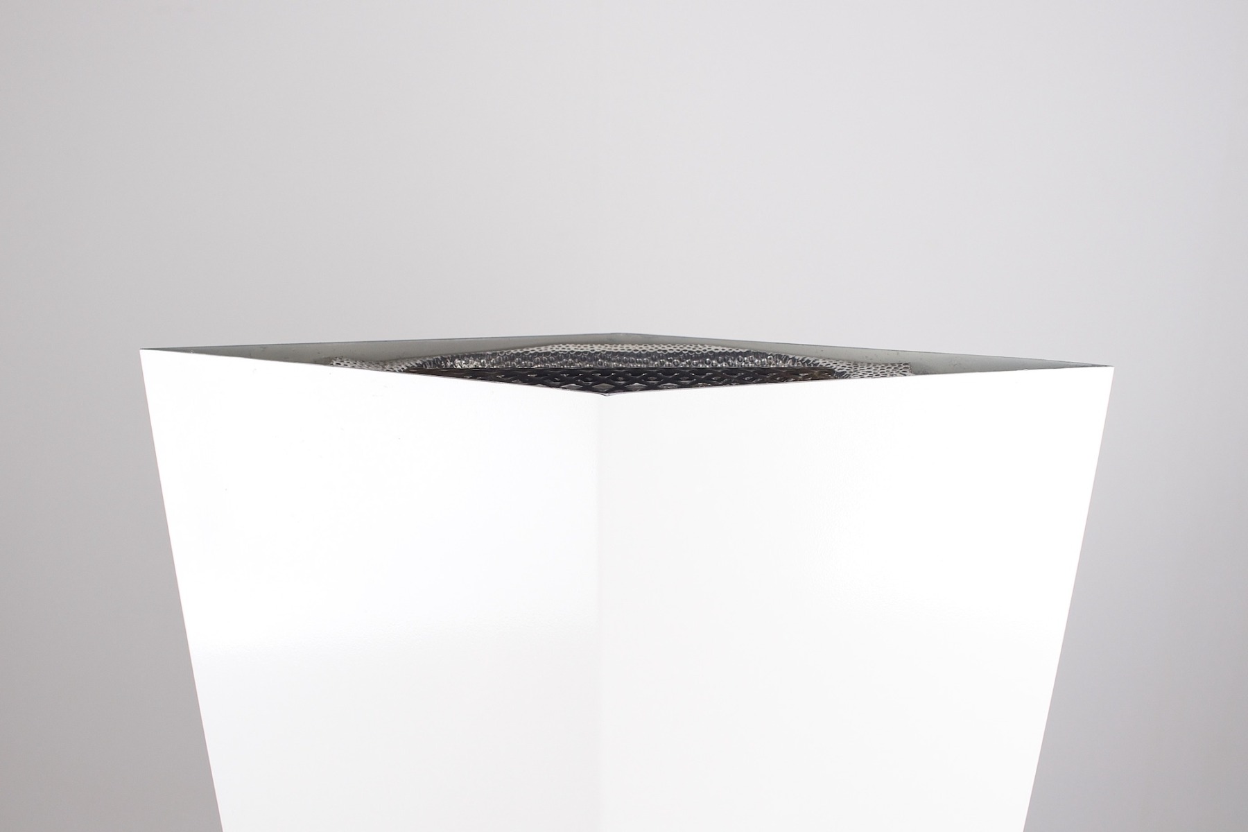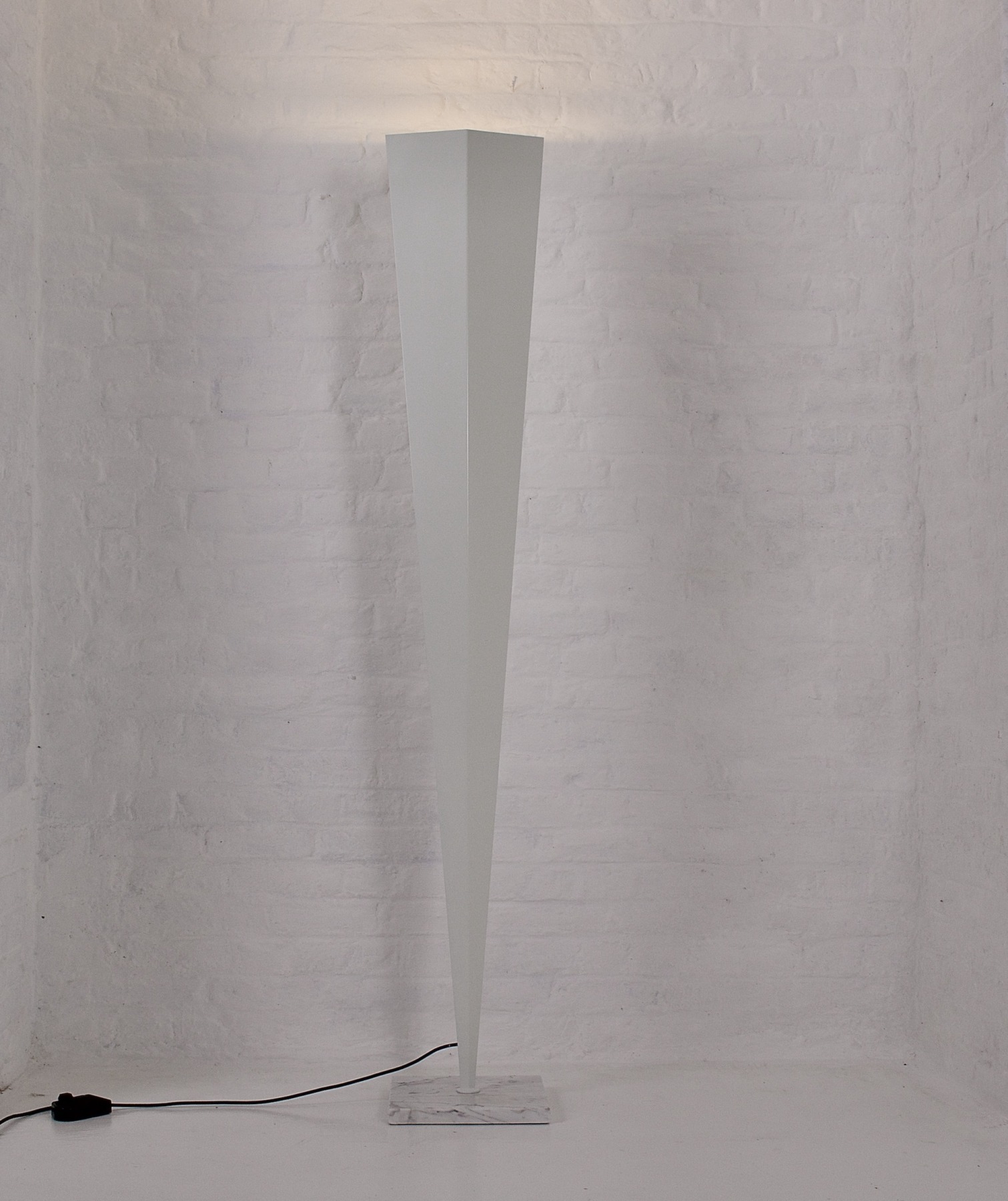 - Lampadaire de forme polyèdre,halogène, formé de quatre biseaux d’aluminium laqué blanc. Piètement carré en marbre de Carrare.