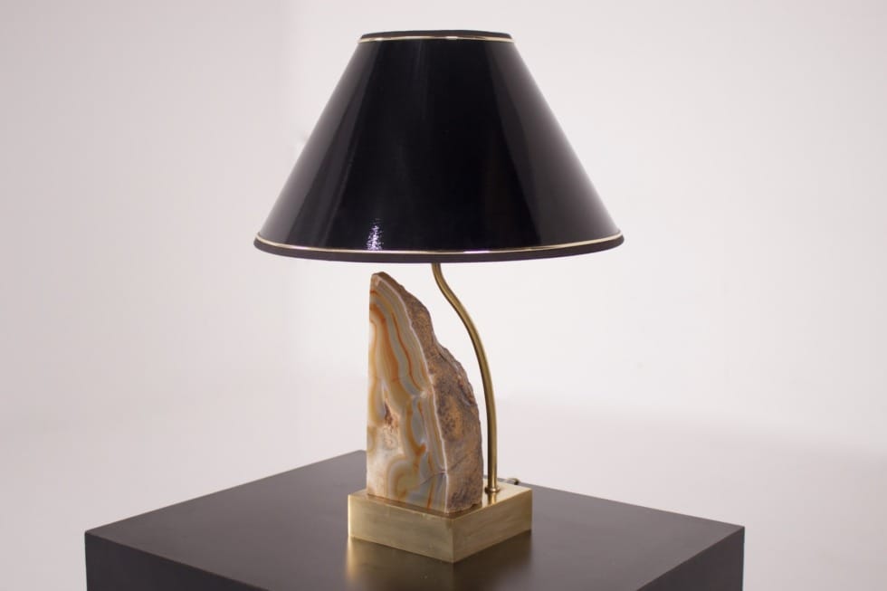 - Willy Daro, lampe socle en laiton massif, décorée d’un quartier d’agate et équipée d’une large abat-jour d’époque, en épais papier noir « gloss » doublé or. Début des années 1970.