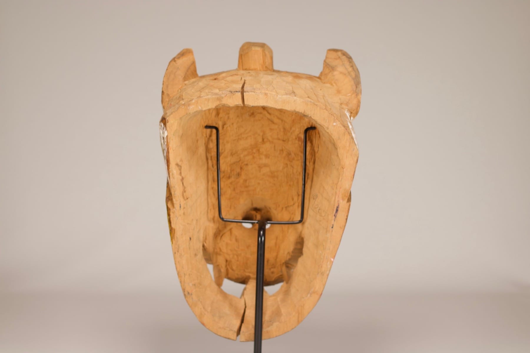 - Masque en bois sculpté et peint, ses couleurs, ainsi que les têtes de mort qui décorent son diadème représentent une divinité courroucée, protectrice des pratiquants et des enseignements (Dharmapala)