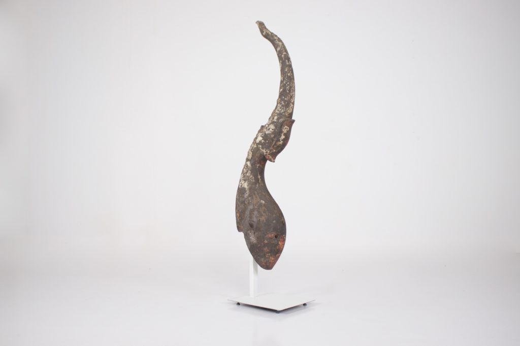 - Bois sculpté, vestige de polychromie rouge et or (Couleurs de Brahma). Belle patine marquée de vestiges de lichens.