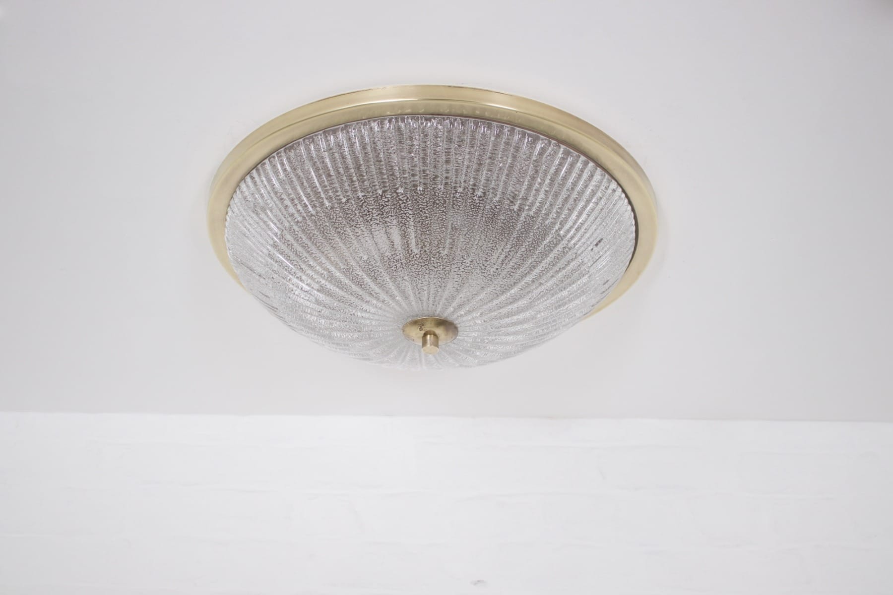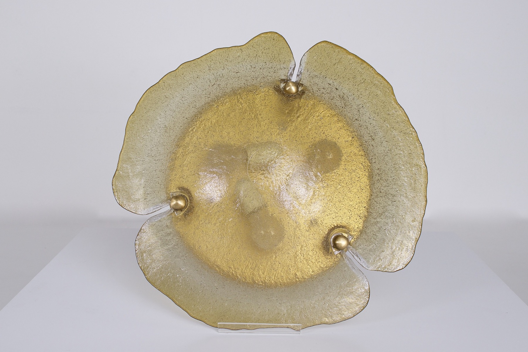 - Grand plafonnier en verre de Murano ambré, dessinant une forme convexe à trois lobes ponctués d’une attache de laiton massif.