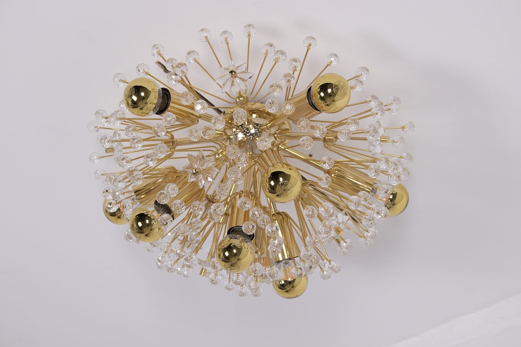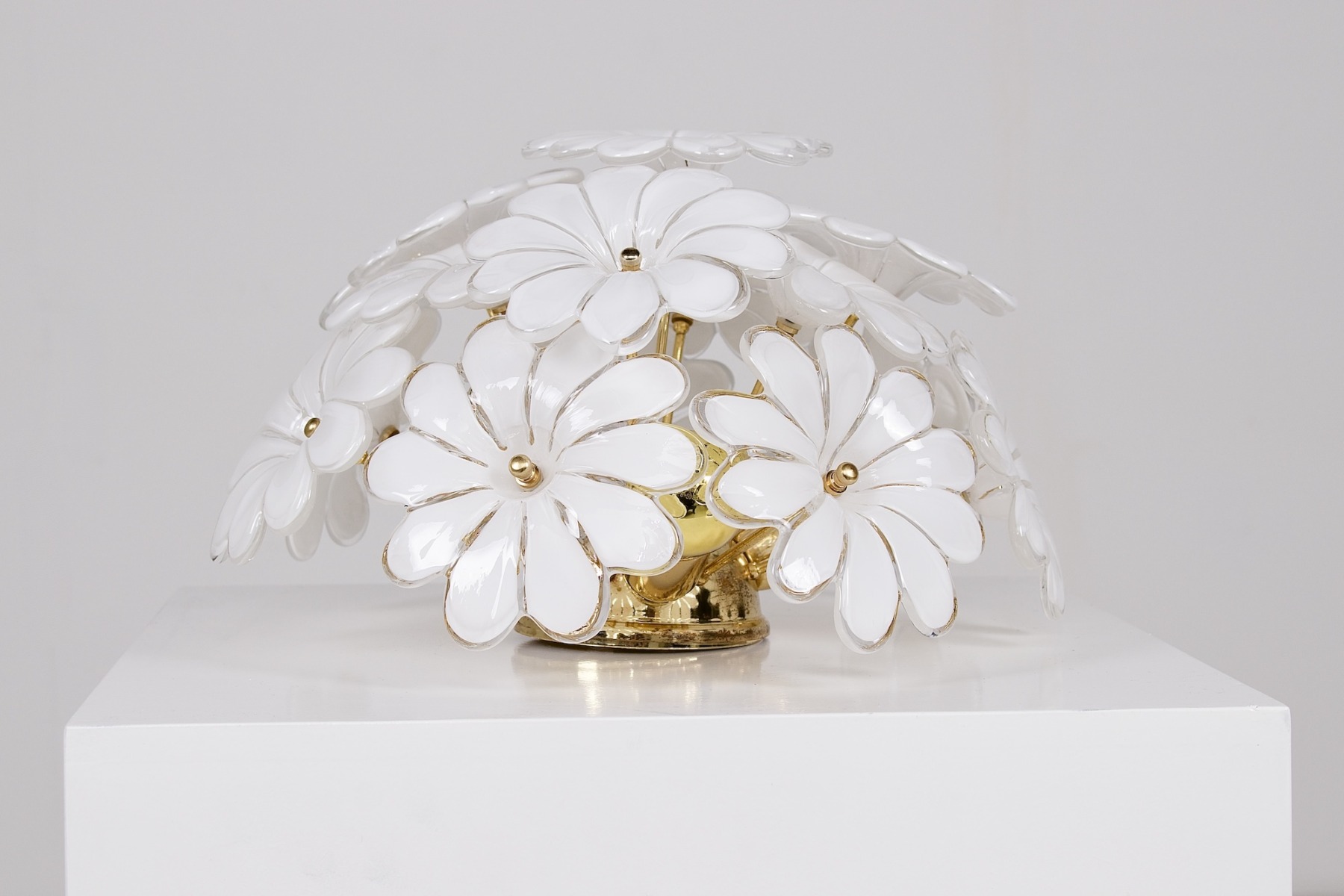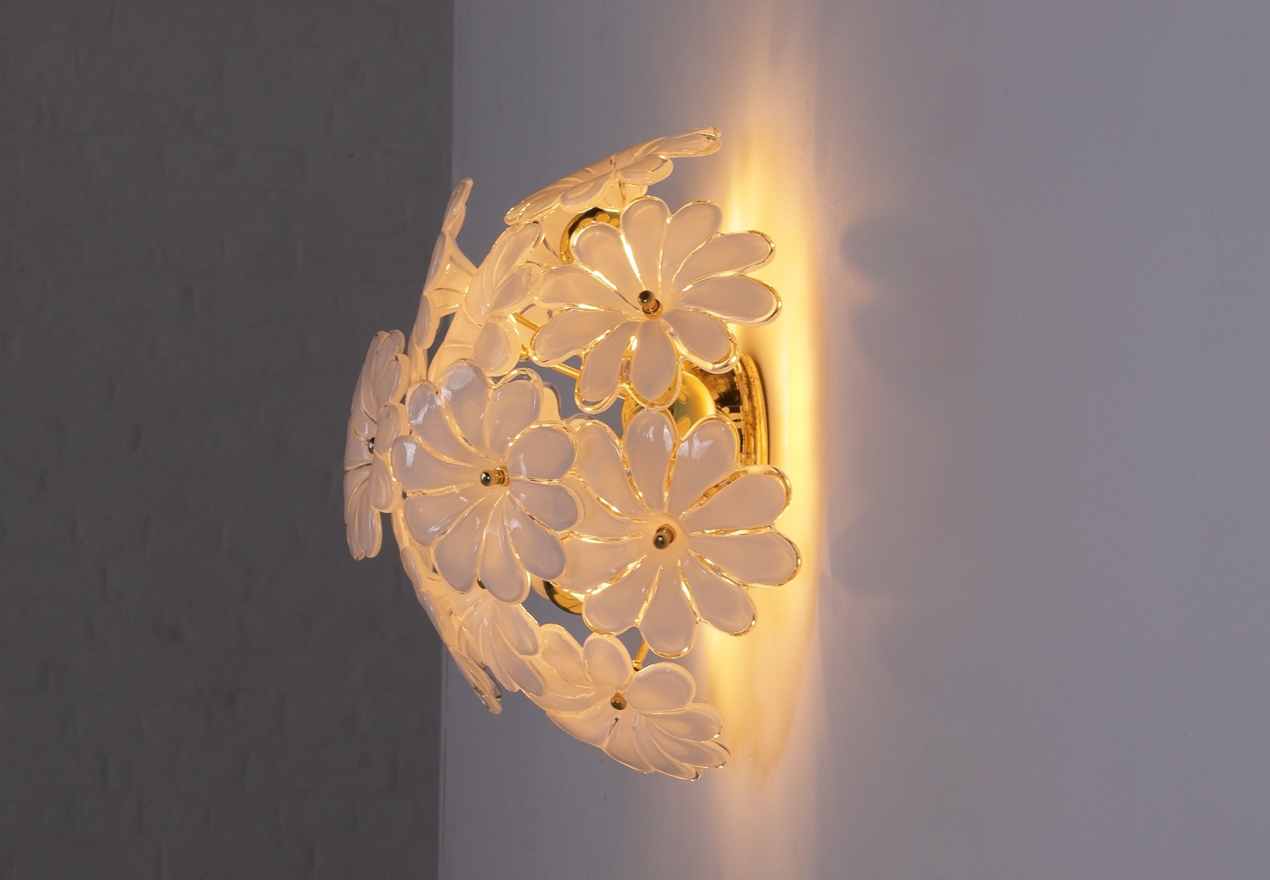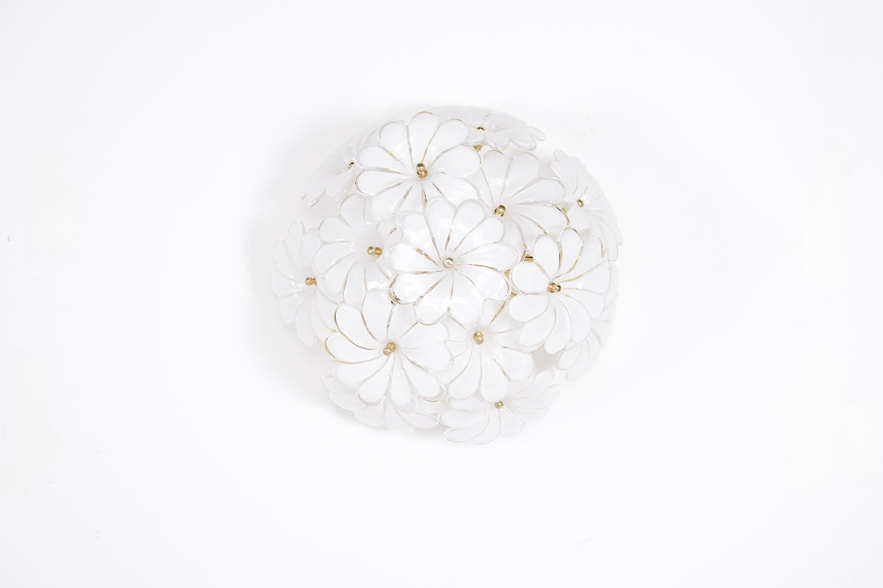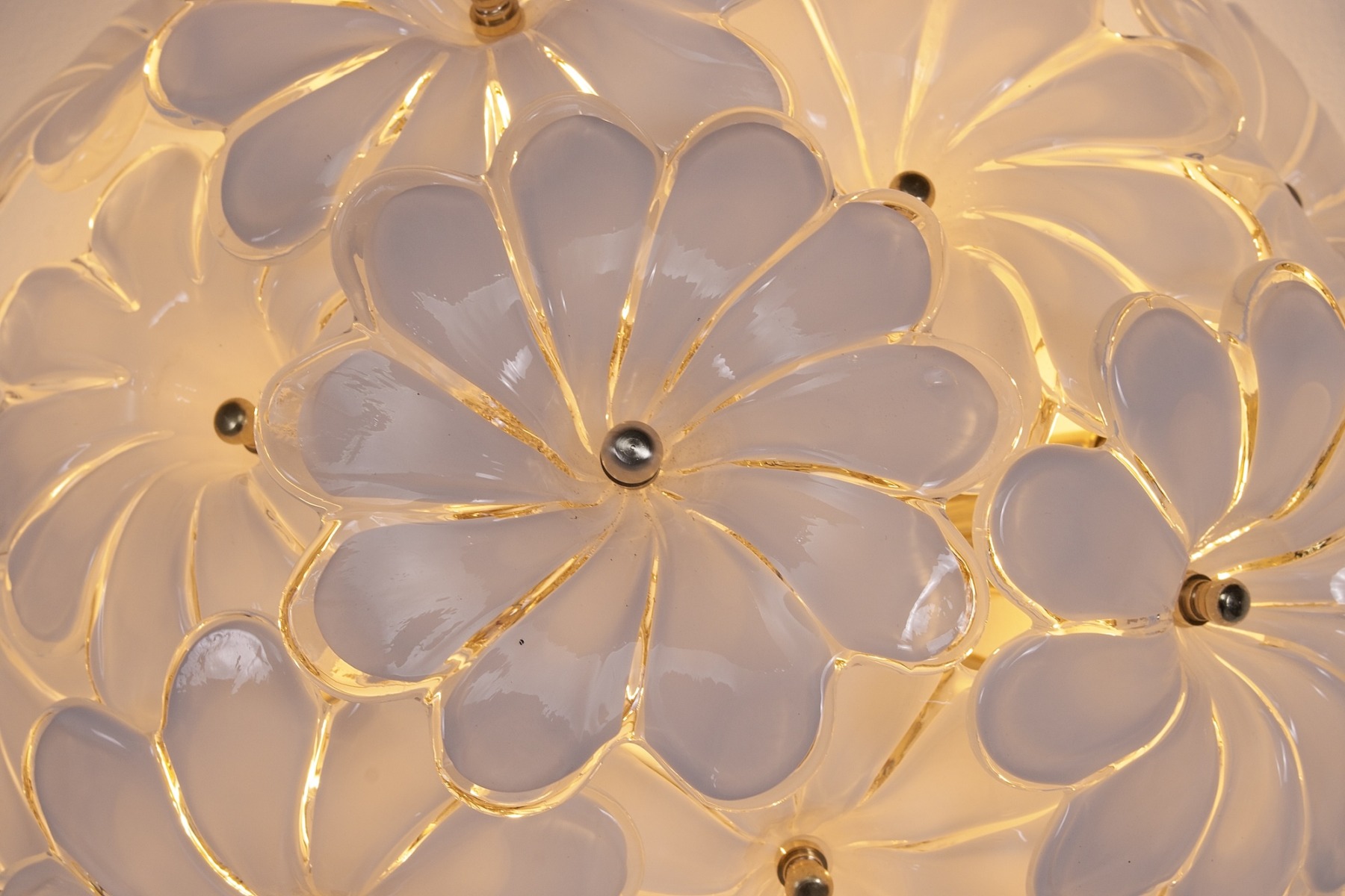 Plafonnier ou applique murale formant un dôme de fleurs de verre blanc translucide, chacune arrimée à un petit bras de laiton. Edition des années 1970.