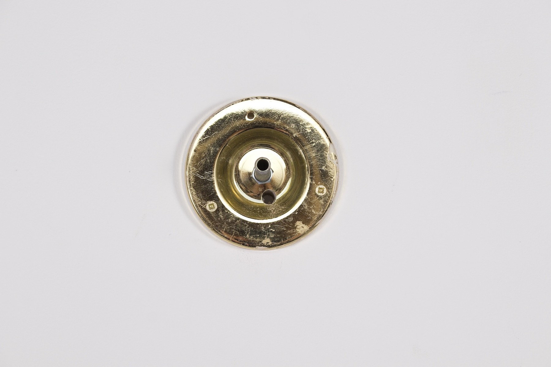 Sur les photos, les ampoules à culot doré ont été choisies afin de s’accorder avec la teinte du laiton. Lorsque le luminaire est éteint, elles donnent une tonalité plus orangée que des ampoules à culot blanc.