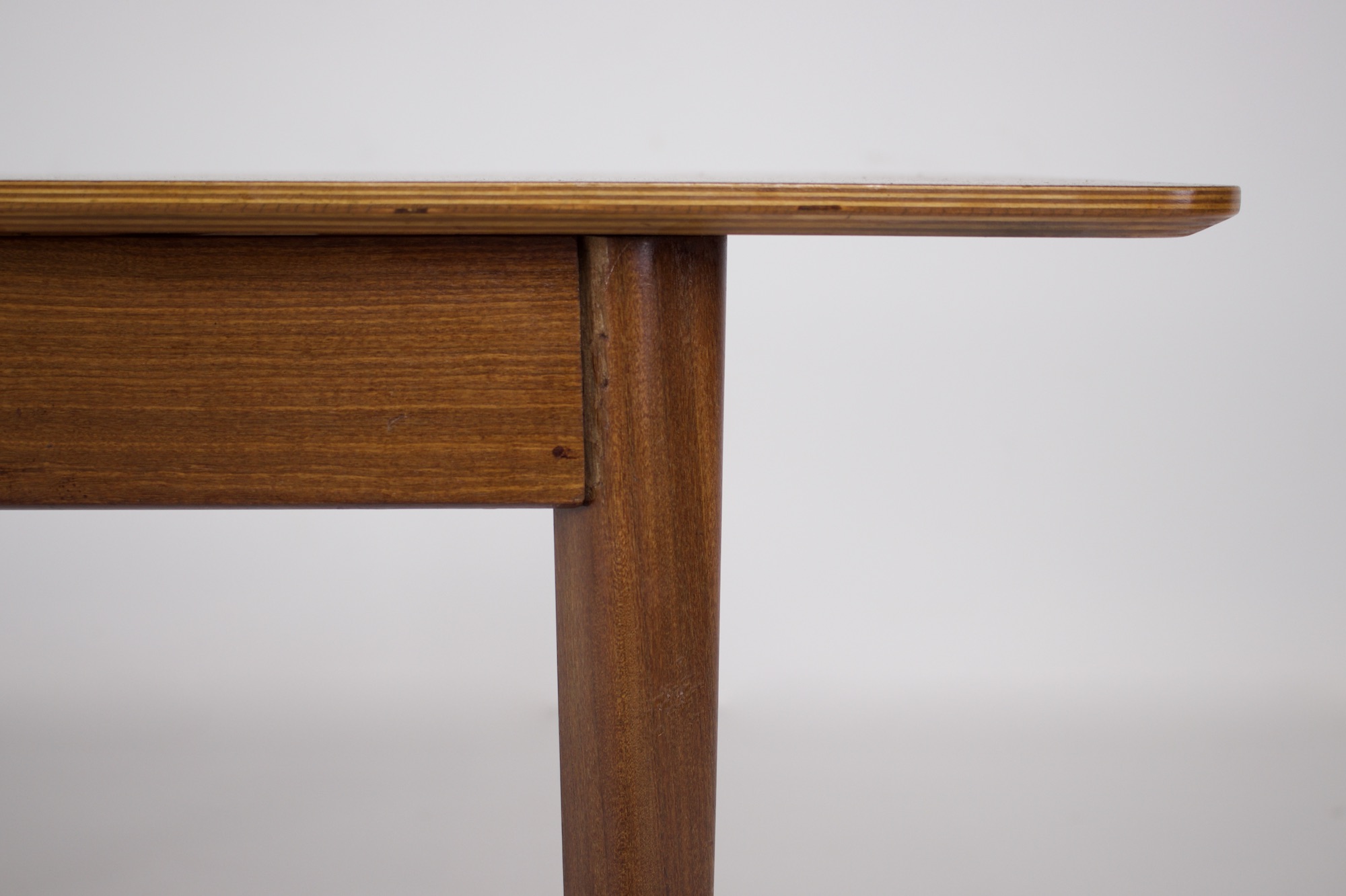 - Quelques marques d’usure normale sur la tablette, deux jonctions présentent un petit jour (raccord entre pied et tablette, voir photos). Elles sont fixées et stables, le meuble est solide.